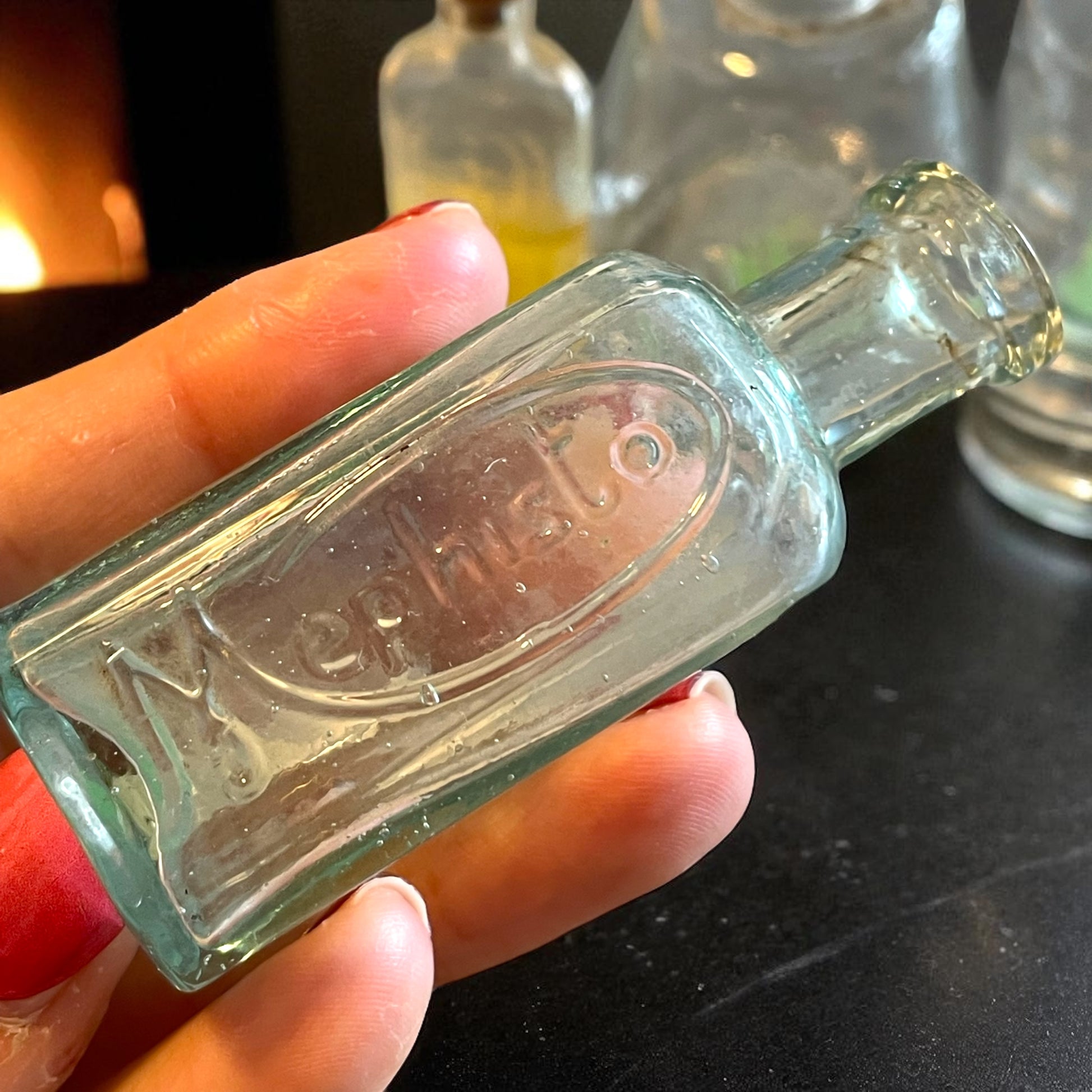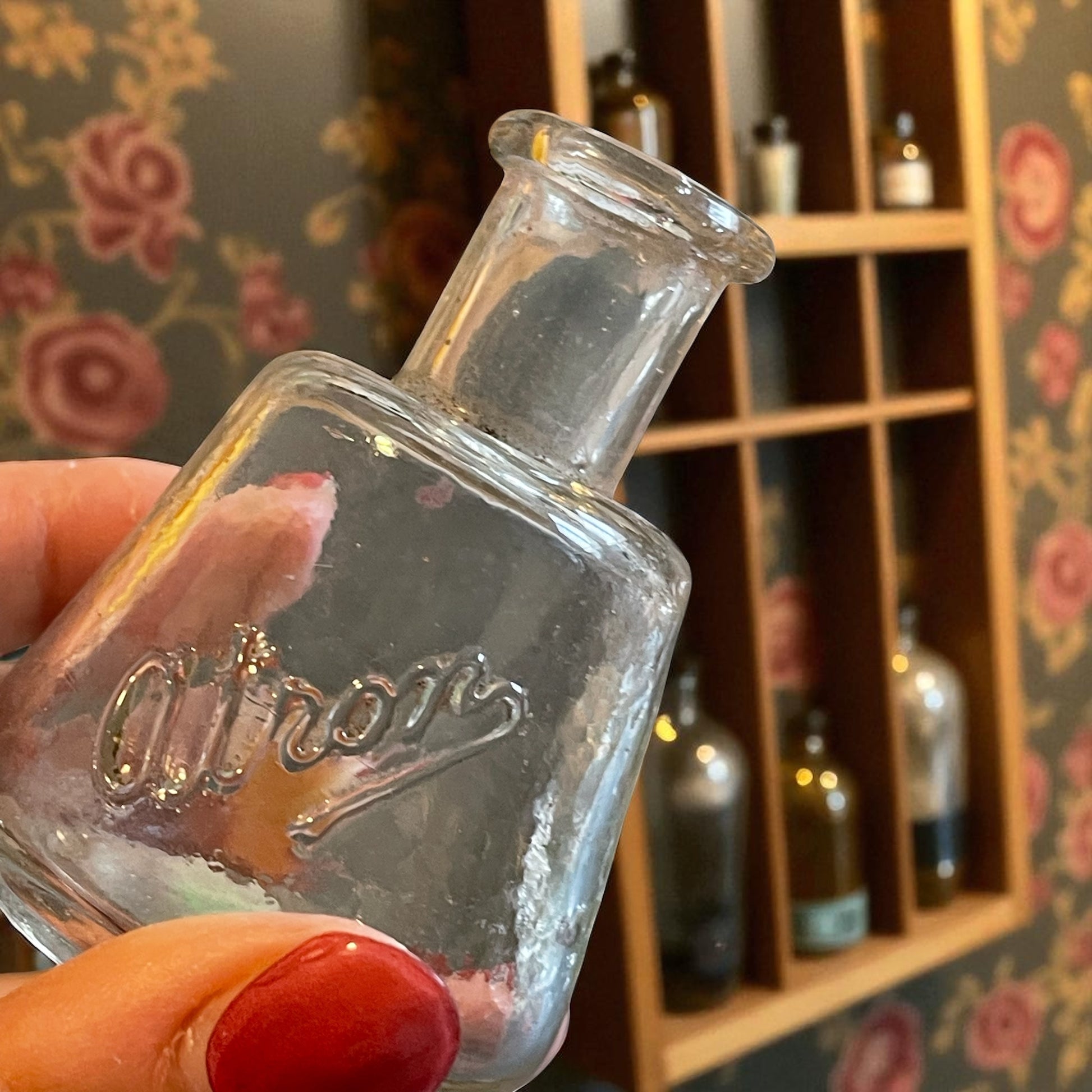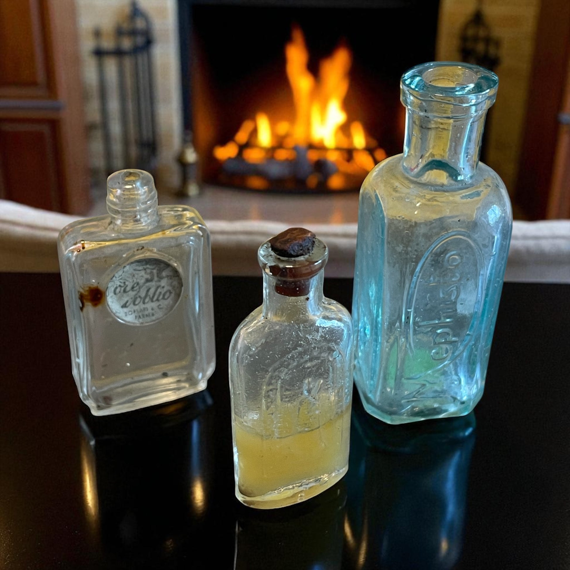 Un piccolo gruppo di bottigliette, ognuna con un frammento di storia da raccontare: profumi dimenticati, rimedi di antiche farmacie, misteriosi elisir d’Oriente e perfino un residuo d’olio sacro. Una collezione che attraversa confini e culture, perfetta da custodire in una bacheca come un cabinet delle meraviglie in miniatura. Bottiglietta “Olivon”: farmaceutico italiano della prima metà del ’900 usato come emolliente. Bottigliette con etichetta in gujarati (India): dal testo si distinguono le parole “Maruti” (dio Hanuman, simbolo di forza e guarigione) e “Yunani”, riferimento alla medicina Unani, antica tradizione greco-araba arrivata in India nel Medioevo e ancora praticata nel ’900. Rimedi erboristici per disturbi generici. Bottiglietta “Cré d’Oblio – Borsari & C. Parma”: celebre casa Borsari di Parma, attiva dal 1870 e famosa in tutto il mondo. Bottiglietta “Mephisto”: preparato farmaceutico italiano dei primi del ’900, digestivo o tonico. Bottiglietta con residuo giallo: olio, ormai scurito dal tempo, destinato a lampade votive.