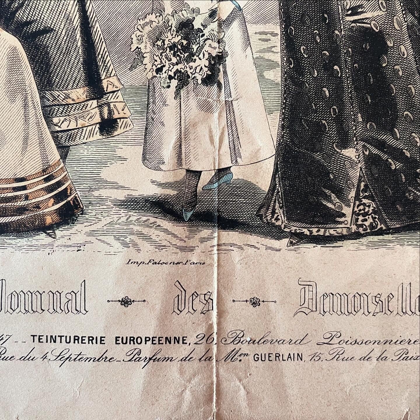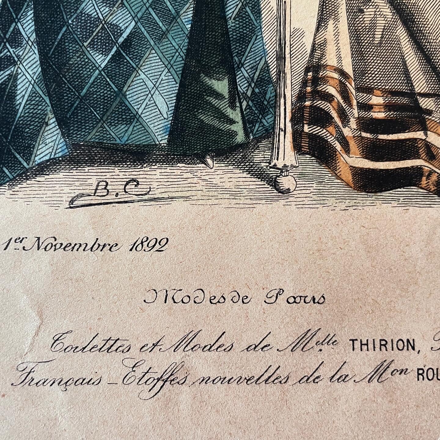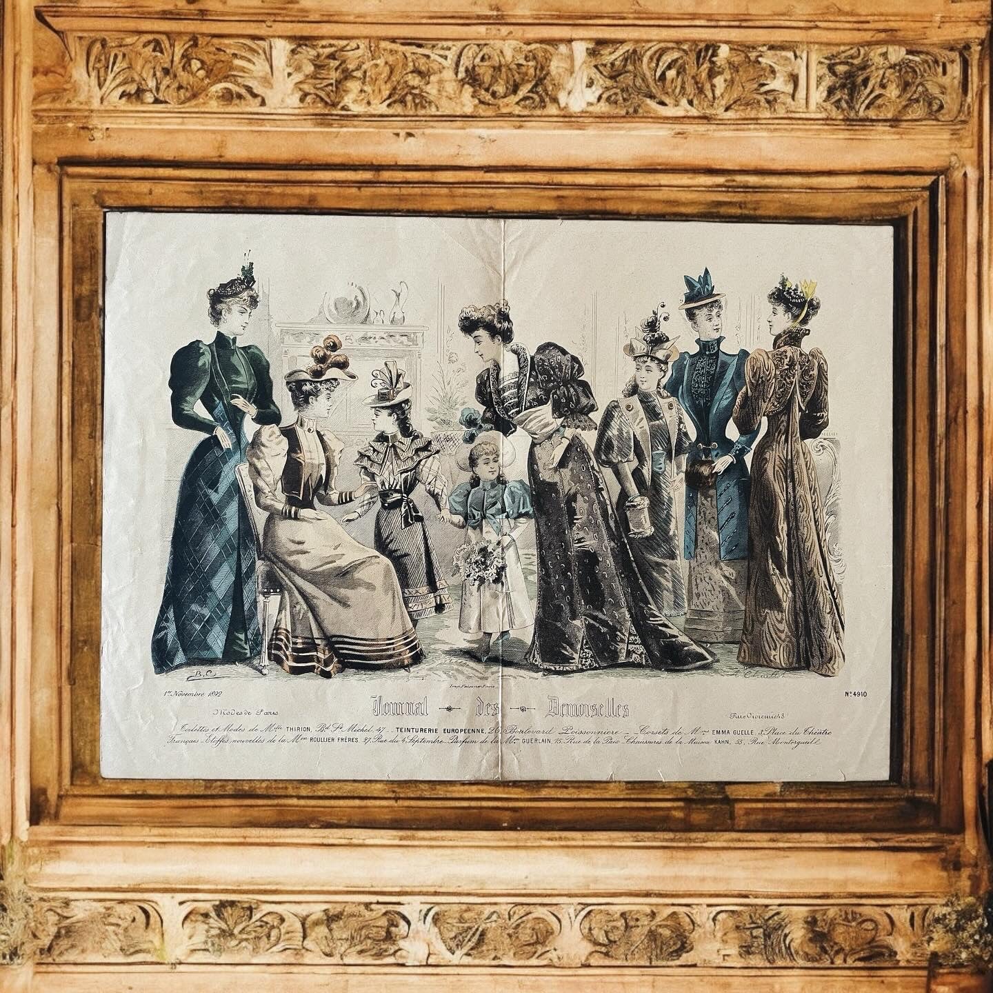 In the first photo you can see where we found it ... we only took the large print and not the frame; now we offer it to you in all its beauty and in all its Antiquity - it is from 1892, as reported at the bottom. This large millinery work measures 40 x 28 cm. Signed, it presents us with the elegance of timeless accessories and clothes: printed exclusively for the Journal des Demoiselles, in the lower part it reports the prestigious names of those who supplied fabrics, dressing tables, make-up, hats - commendable names such as Guerlain, to give an example. Wonderful to frame and display in an atelier.