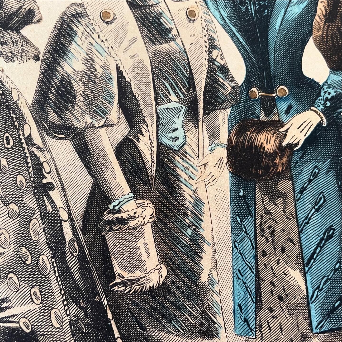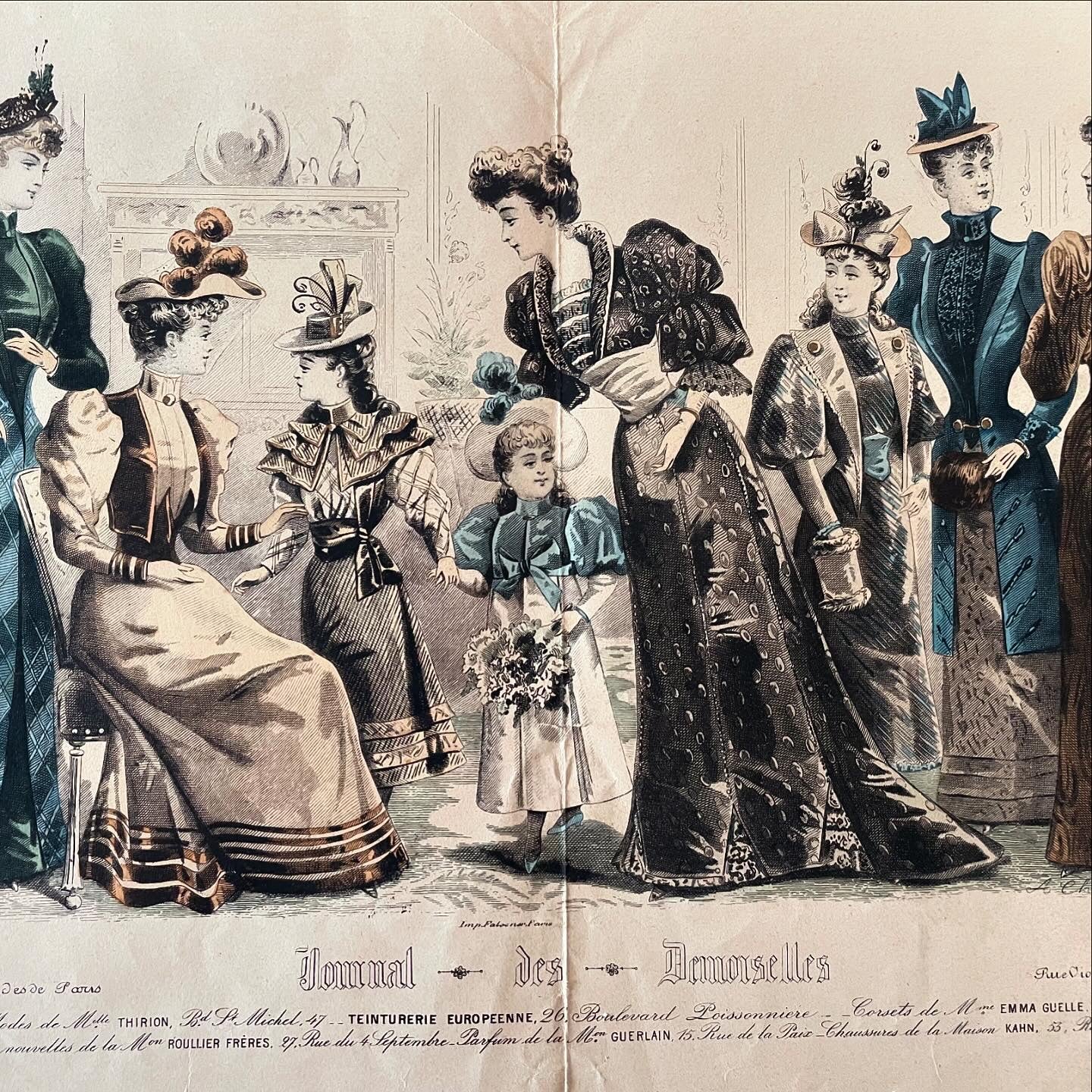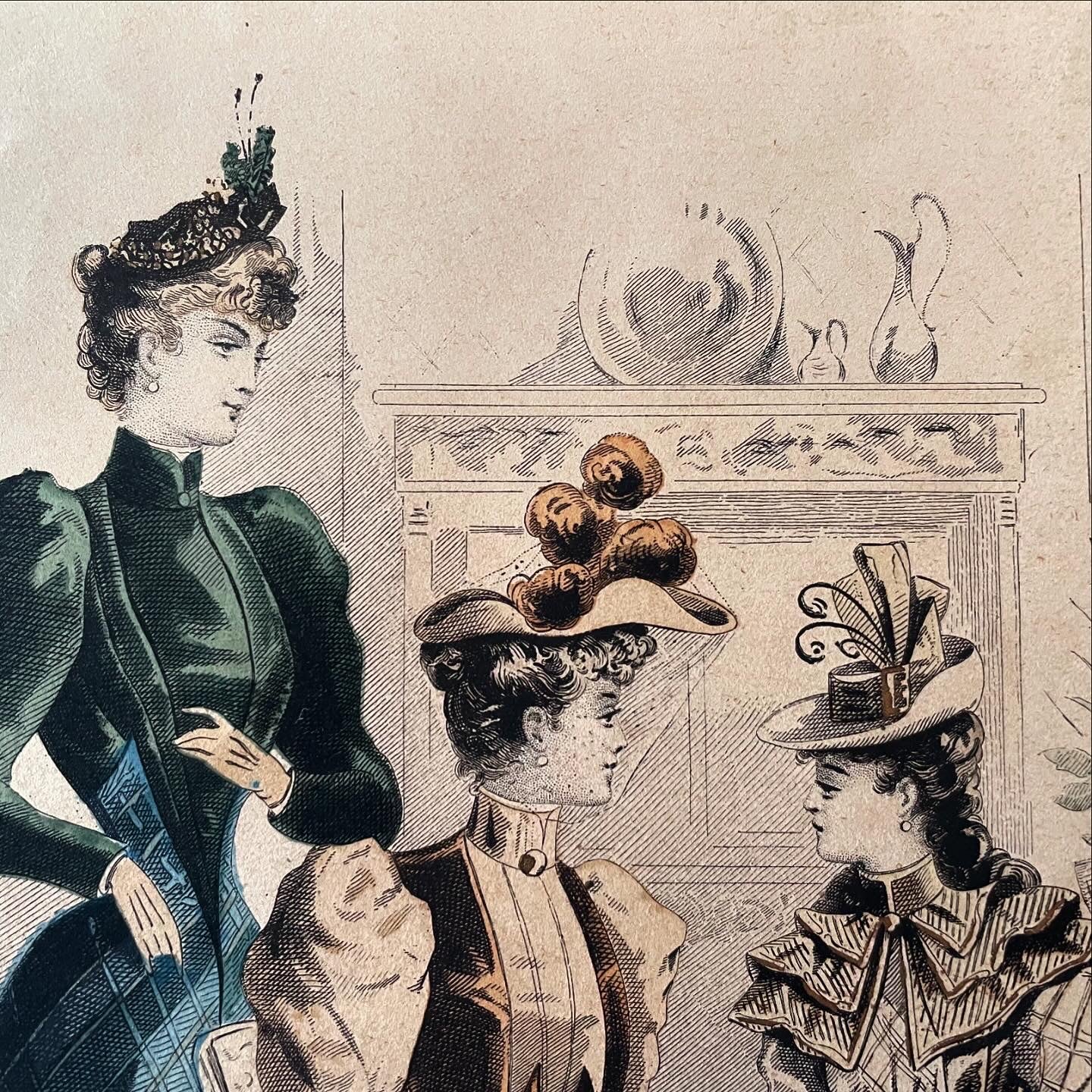 In the first photo you can see where we found it ... we only took the large print and not the frame; now we offer it to you in all its beauty and in all its Antiquity - it is from 1892, as reported at the bottom. This large millinery work measures 40 x 28 cm. Signed, it presents us with the elegance of timeless accessories and clothes: printed exclusively for the Journal des Demoiselles, in the lower part it reports the prestigious names of those who supplied fabrics, dressing tables, make-up, hats - commendable names such as Guerlain, to give an example. Wonderful to frame and display in an atelier.