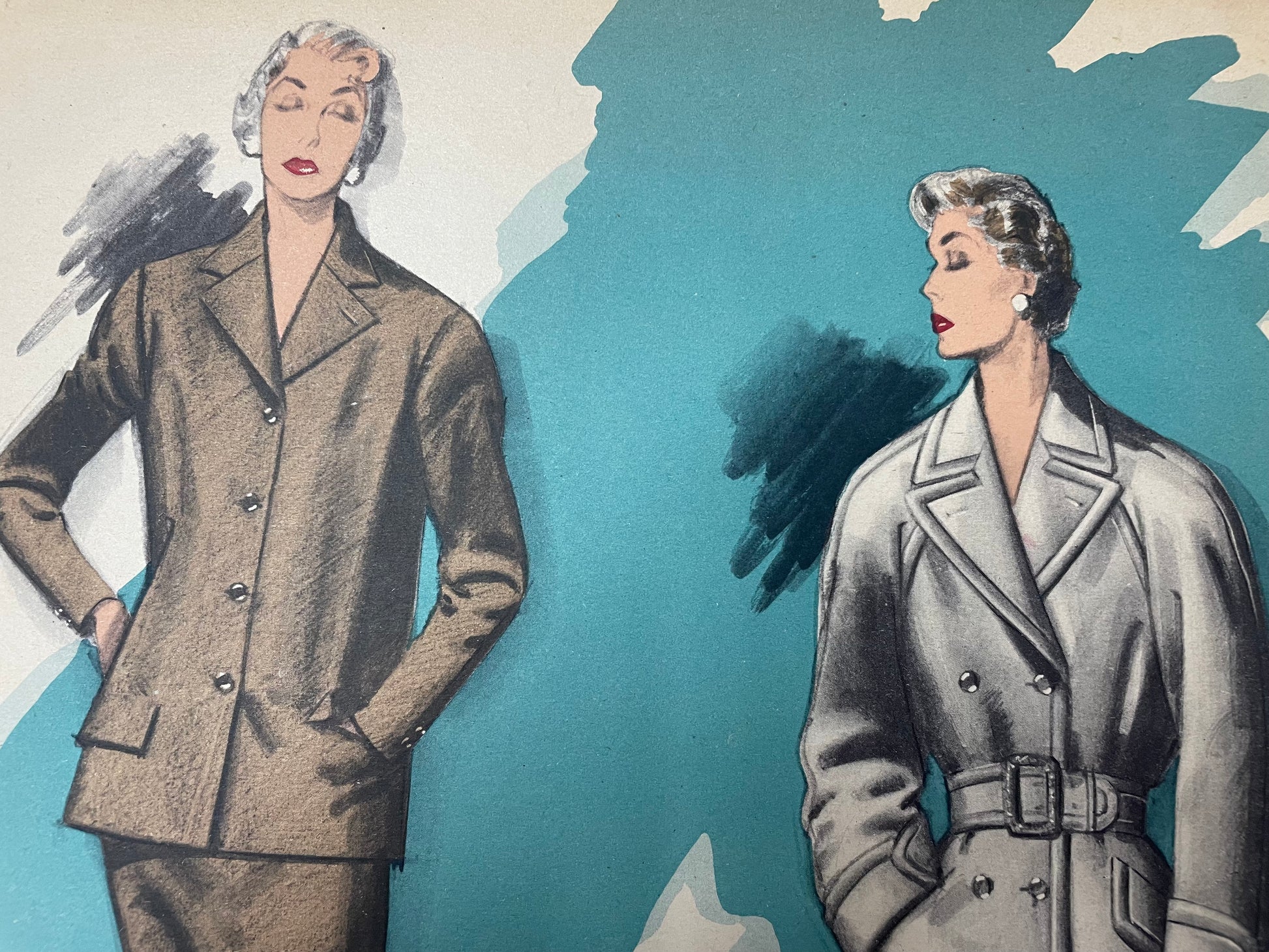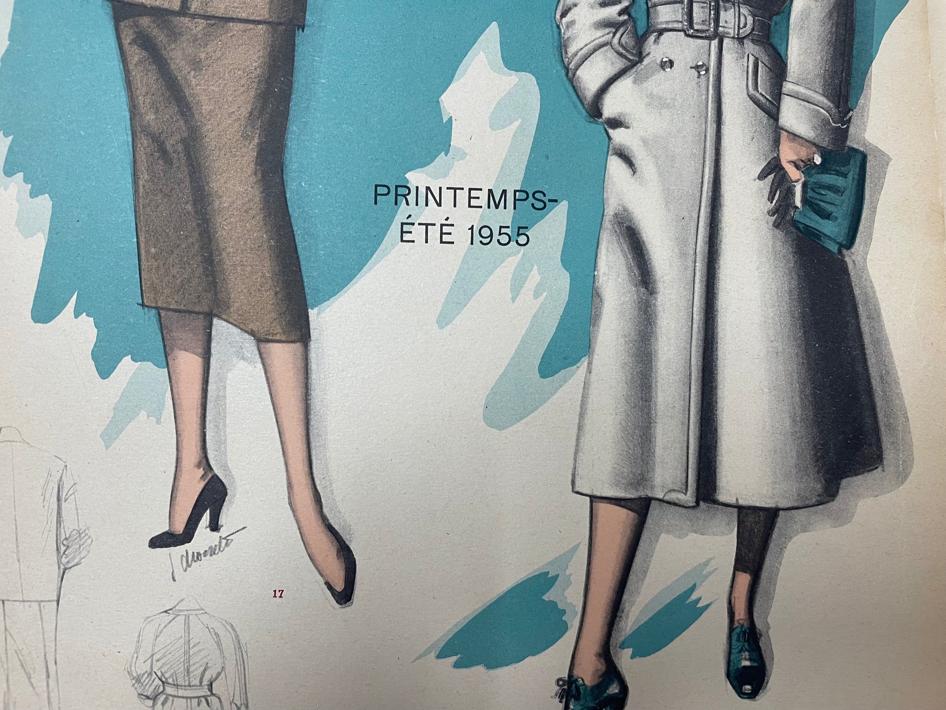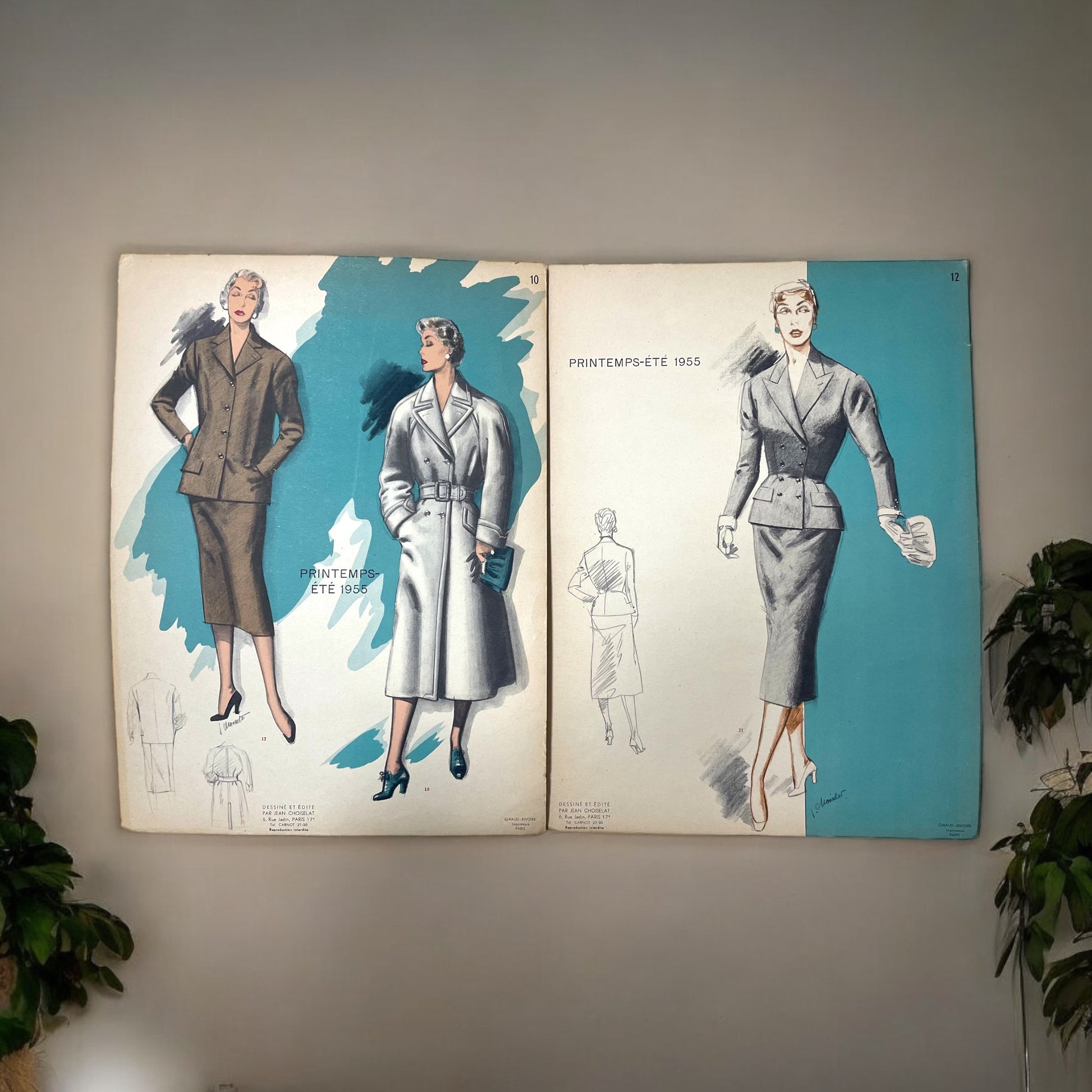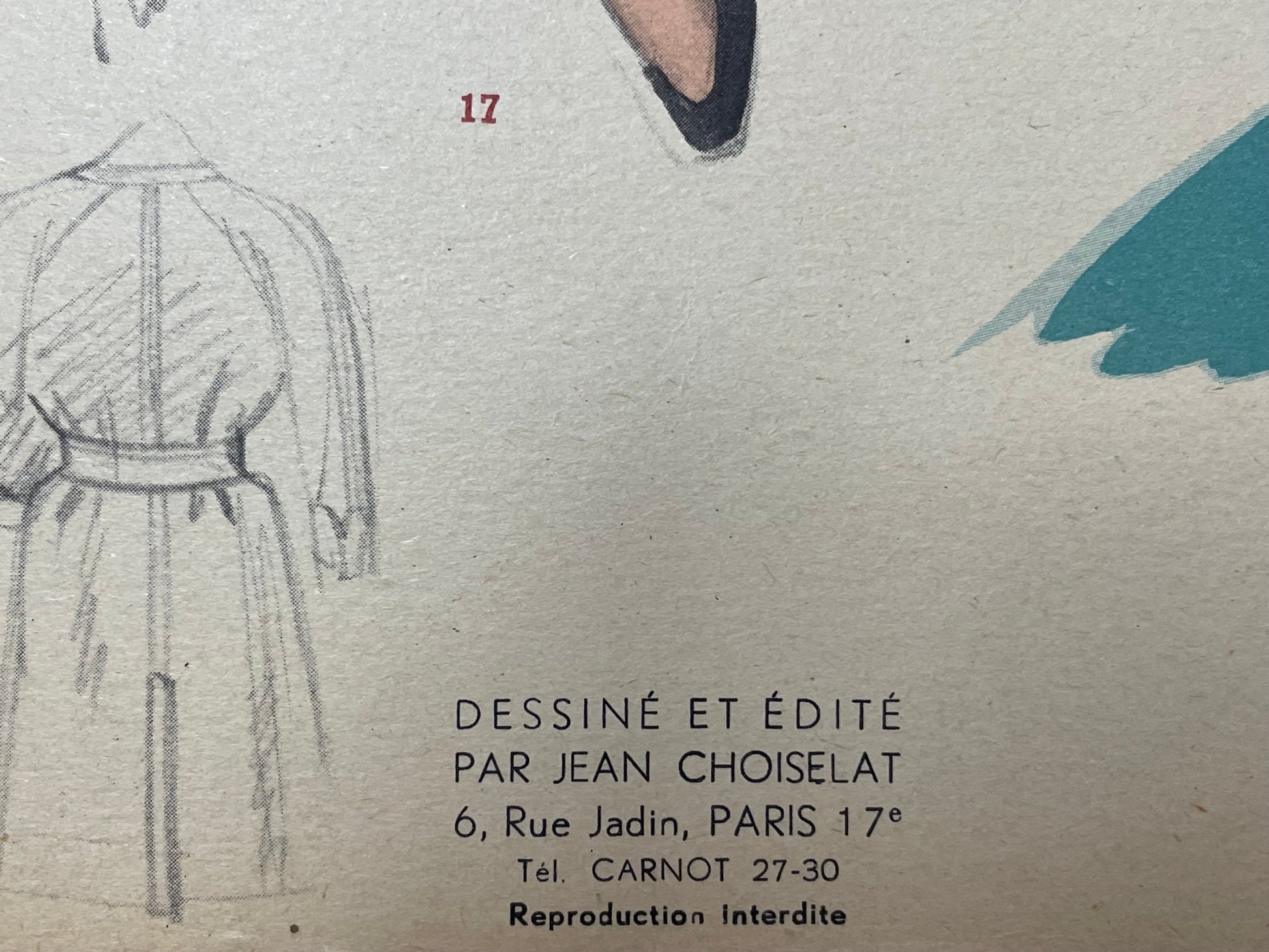 ULTIMI RIMASTI! Coppia di bozzetti moda, si tratta di due grandi stampe di modisteria realizzate dall’inimitabile Jean Choiselat - sono stampe di cui è vietata la riproduzione, ne esistono quindi pochi esemplari, tutti numerati. ci illustrano la moda della primavera estate del 1955 e della stagione autunno inverno 1954-1955. Inutile descrivere l’eleganza di queste donne perché le immagini parlano da sé: perfette da incorniciare, da esporre in un atelier o in un qualsiasi ambiente voglia vantare un pezzo esclusivo della storia della moda, proveniente direttamente da Parigi. Le dimensioni: 36 x 26 cm ciascuna.
