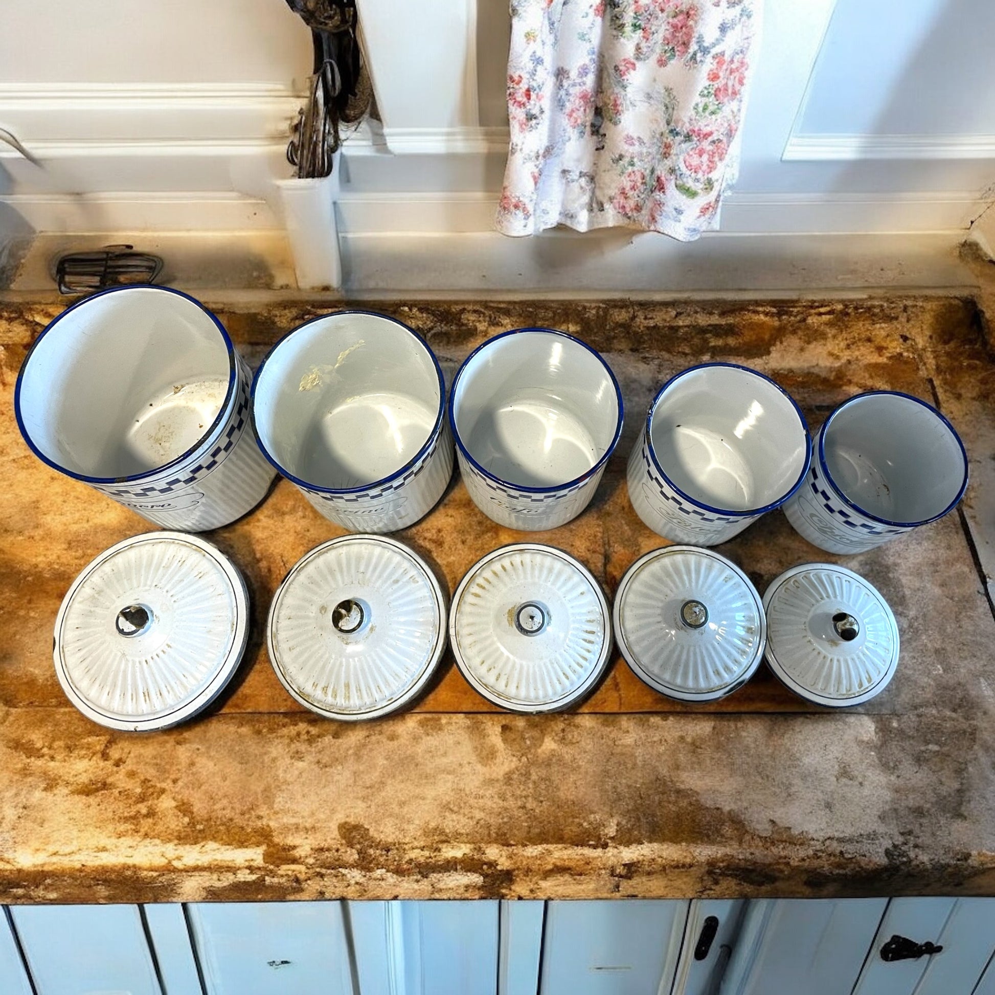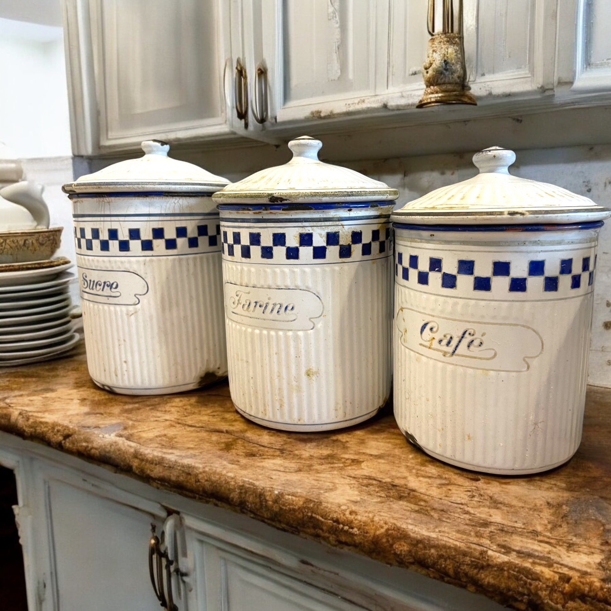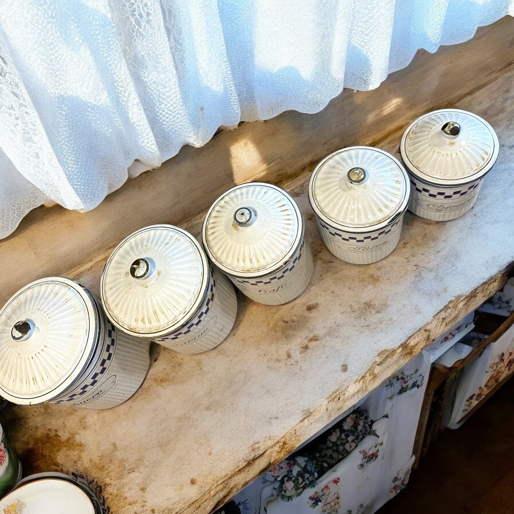 Saltati fuori da una cucina provenzale antica … quando troviamo questi set di barattoli siamo super contenti perché sappiamo piacere molto. Del resto come potrebbe non essere così? In ferro smaltato con la loro patina e i loro difetti del tempo che li rendono super brocante, portano con sé tutta l’atmosfera provenzale di un’altra epoca. Bellissima in questo caso la greca bianco blu con cui sono decorati, che li rende molto particolari. Potete vedere persino la farina rimasta nell’apposito vaso dagli anni che furono 😂♥️