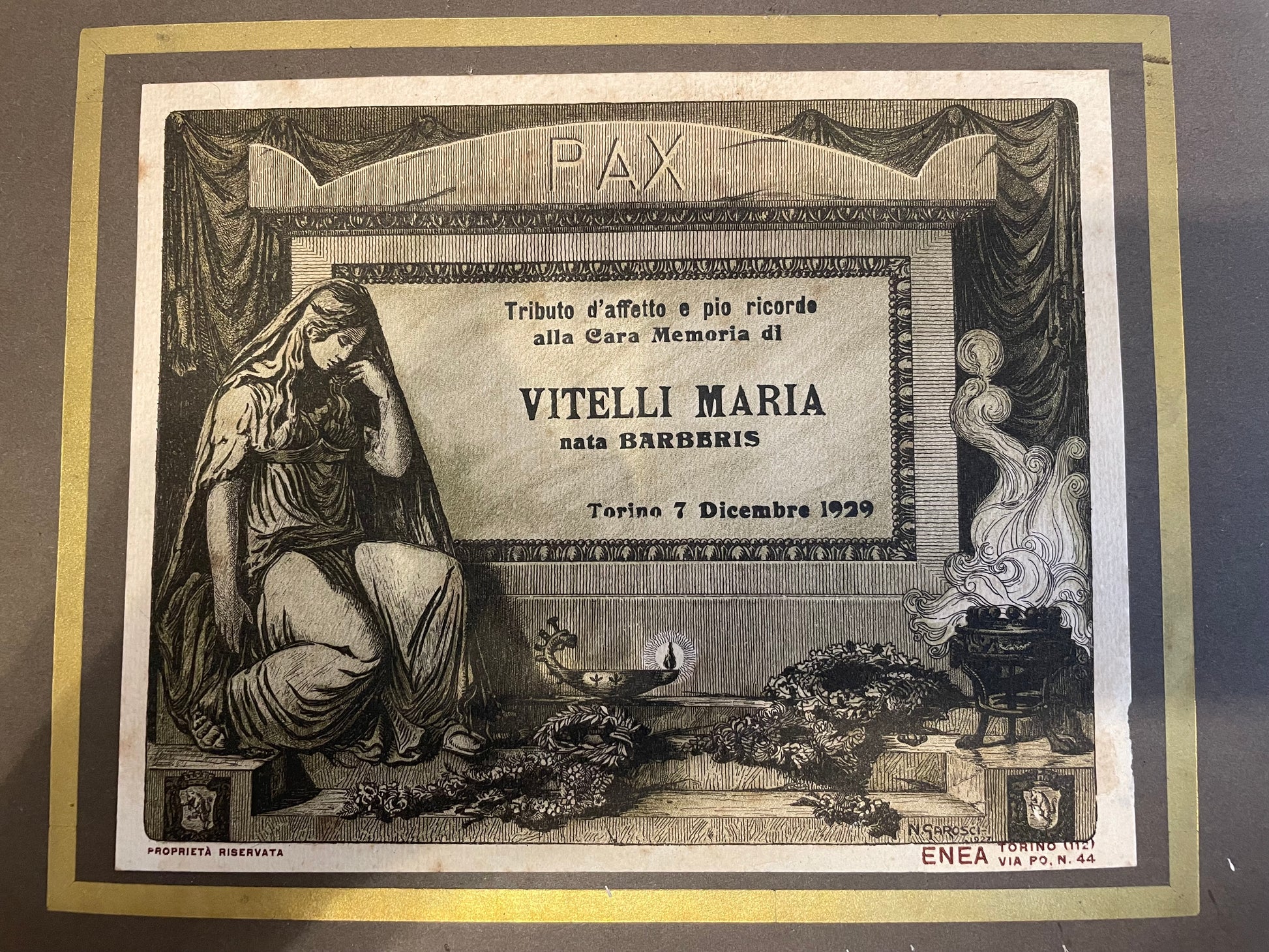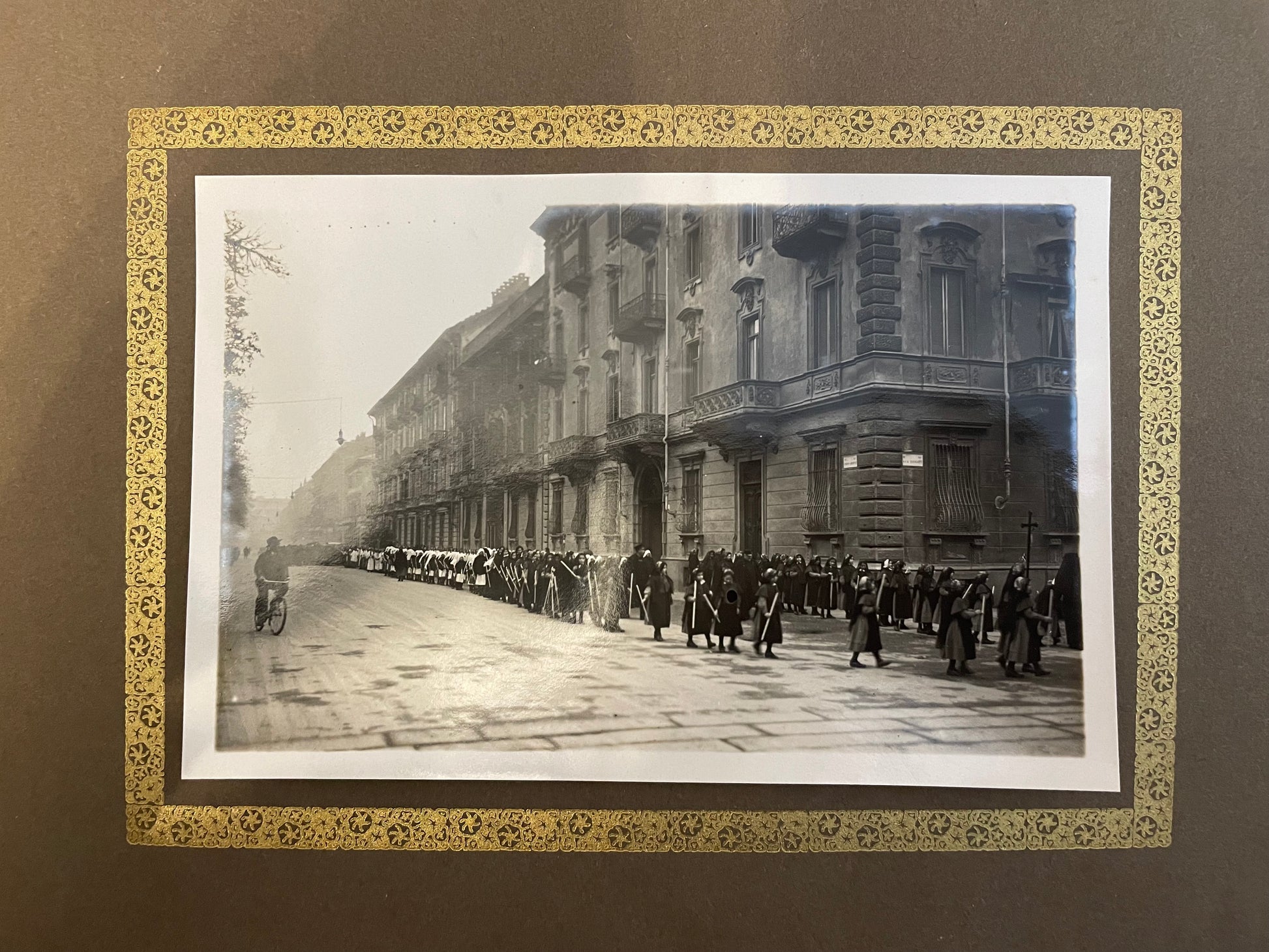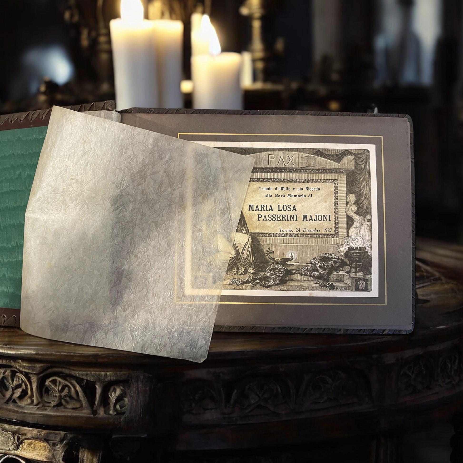 Questi straordinari “album in memoriam”, risalenti agli anni ’20, sono un tributo tangibile al mistero della vita e della morte. Frutto di una tradizione ormai dimenticata, raccontano con eleganza e solennità i riti funebri di due donne torinesi di spicco, Maria Losa Passerini Majoni (1927) e Maria Vitelli nata Barberis (1929). Questi oggetti non sono solo ricordi, ma veri e propri monumenti di carta, in cui ogni dettaglio è intriso di significato. La carta velina rappresenta il tempo sospeso: particolare e inquietante, su uno degli album è decorata con ragnatele e ragni offrendo un simbolismo macabro e affascinante. Le ragnatele evocano il tempo che si ferma, mentre i ragni, pazienti tessitori, richiamano la connessione invisibile tra la vita e la morte. È un dettaglio raro che arricchisce il valore antropologico e simbolico di questo pezzo unico. Nell’altro la velina ci porta farfalle, da sempre simbolo di trasformazione. Le copertine in rilievo, con il simbolo del Chi Rho (☧) e delle lettere Alfa e Omega, celebrano l’eternità divina. L’Alfa e l’Omega rappresentano il ciclo della vita, che trova compimento nell’infinito. All’interno, la grafica che incornicia i nomi delle defunte è costruita come un altare votivo: drappi, candele e fiori richiamano la preghiera e la luce eterna; mentre la scritta “PAX” invita a una pace universale, per chi resta e per chi se ne va. Le fotografie dei funerali mostrano orfanelle velate di bianco che seguono i cortei. La loro presenza, simbolo di purezza e devozione, aggiunge un elemento emotivo e commovente, collegando il defunto al mondo della carità e della fede. Questi album non sono semplici documenti, ma testimonianze antropologiche di un’epoca in cui il lutto si intrecciava con la memoria sacra. La loro bellezza e il loro simbolismo li rendono oggetti unici, capaci di raccontare una storia che supera il tempo e celebra il legame eterno tra vita, morte e ricordo. Si vendono SOLO in coppia; le fotografie in totale sono 12.