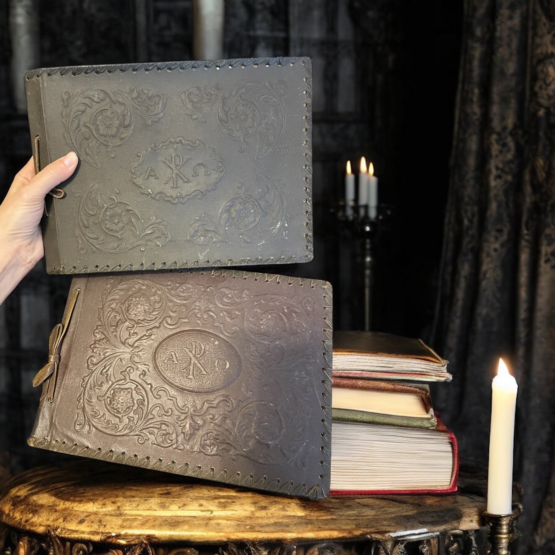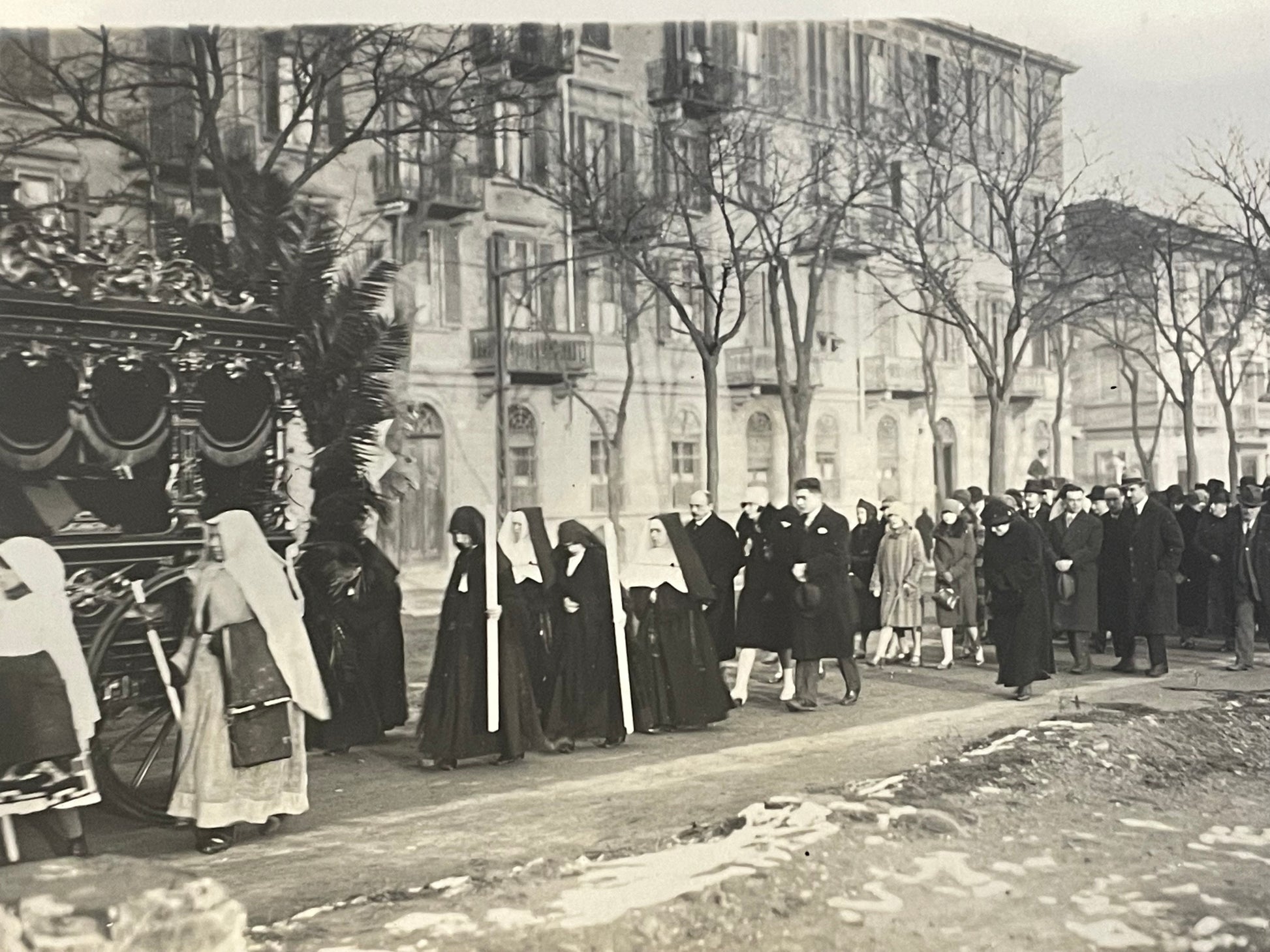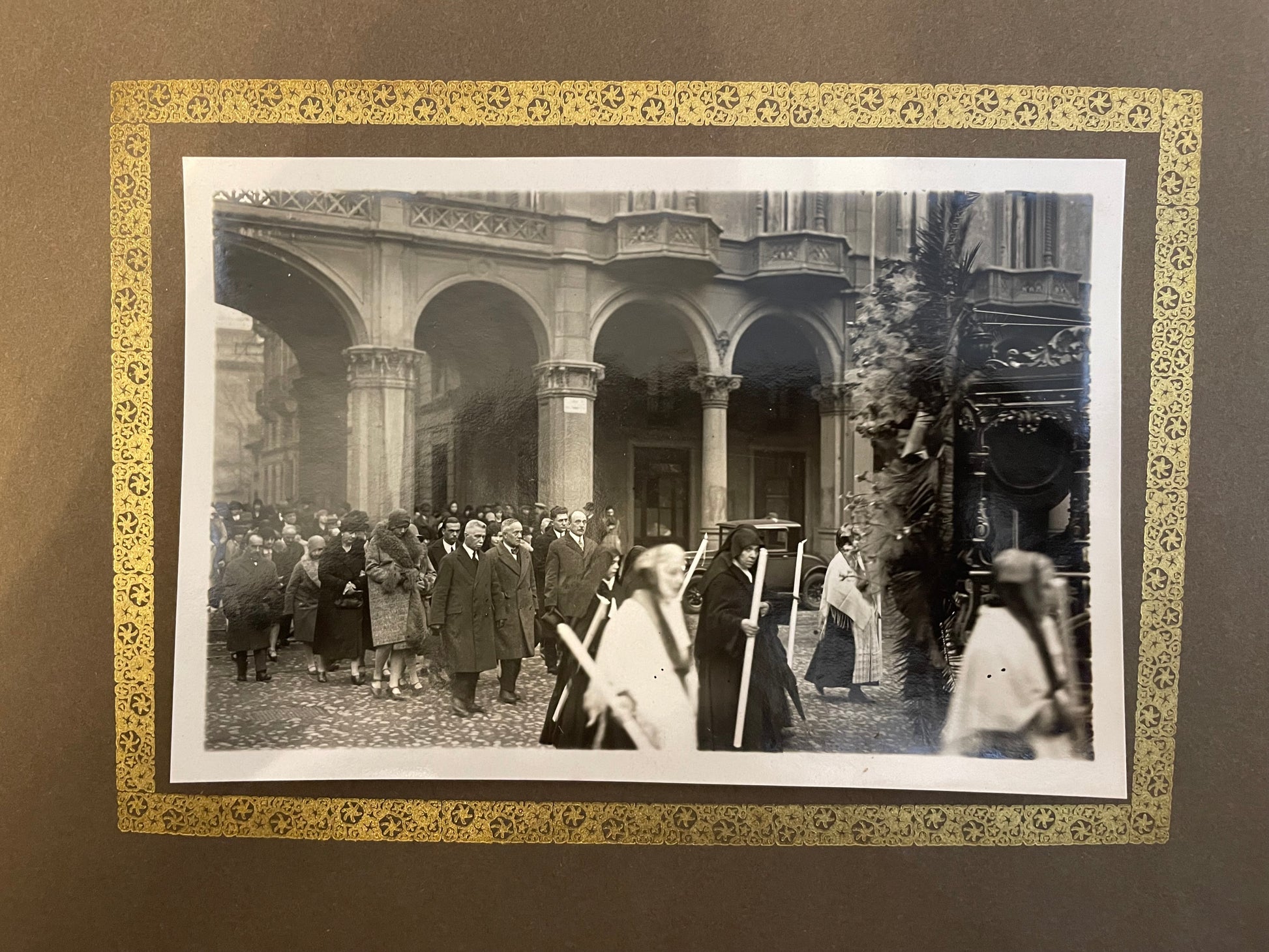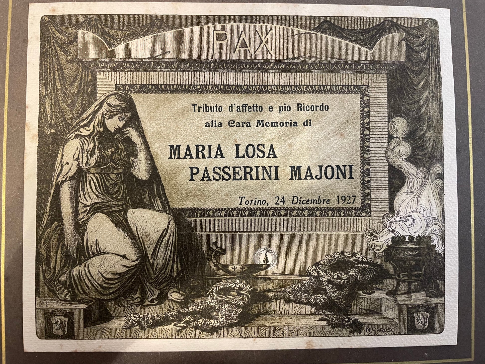 Questi straordinari “album in memoriam”, risalenti agli anni ’20, sono un tributo tangibile al mistero della vita e della morte. Frutto di una tradizione ormai dimenticata, raccontano con eleganza e solennità i riti funebri di due donne torinesi di spicco, Maria Losa Passerini Majoni (1927) e Maria Vitelli nata Barberis (1929). Questi oggetti non sono solo ricordi, ma veri e propri monumenti di carta, in cui ogni dettaglio è intriso di significato. La carta velina rappresenta il tempo sospeso: particolare e inquietante, su uno degli album è decorata con ragnatele e ragni offrendo un simbolismo macabro e affascinante. Le ragnatele evocano il tempo che si ferma, mentre i ragni, pazienti tessitori, richiamano la connessione invisibile tra la vita e la morte. È un dettaglio raro che arricchisce il valore antropologico e simbolico di questo pezzo unico. Nell’altro la velina ci porta farfalle, da sempre simbolo di trasformazione. Le copertine in rilievo, con il simbolo del Chi Rho (☧) e delle lettere Alfa e Omega, celebrano l’eternità divina. L’Alfa e l’Omega rappresentano il ciclo della vita, che trova compimento nell’infinito. All’interno, la grafica che incornicia i nomi delle defunte è costruita come un altare votivo: drappi, candele e fiori richiamano la preghiera e la luce eterna; mentre la scritta “PAX” invita a una pace universale, per chi resta e per chi se ne va. Le fotografie dei funerali mostrano orfanelle velate di bianco che seguono i cortei. La loro presenza, simbolo di purezza e devozione, aggiunge un elemento emotivo e commovente, collegando il defunto al mondo della carità e della fede. Questi album non sono semplici documenti, ma testimonianze antropologiche di un’epoca in cui il lutto si intrecciava con la memoria sacra. La loro bellezza e il loro simbolismo li rendono oggetti unici, capaci di raccontare una storia che supera il tempo e celebra il legame eterno tra vita, morte e ricordo. Si vendono SOLO in coppia; le fotografie in totale sono 12.