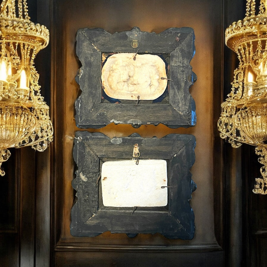 Coppia di rilievi in pietra calcarea, fine XIX – inizi XX secolo, altorilievo scolpito a mano in cornice di legno e gesso con laccatura nera e fondo rosso visibile, francesi.