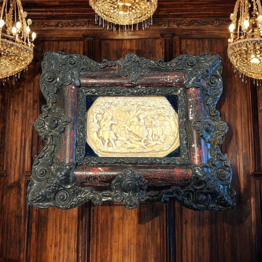Due quadri gemelli, potenti nella loro teatralità, raccontano in silenzio il tempo sospeso dell’attesa, della caccia, dell’incontro. Scene scolpite con maestria su pietra calcarea tenera, con un altorilievo tanto profondo da dare quasi l’illusione del movimento. I personaggi, elegantemente abbigliati, evocano il gusto settecentesco: cavalieri e dame, segugi in corsa, boschi intricati e villaggi lontani. Ogni dettaglio è cesellato a mano, con strumenti visibili nella resa dei panneggi e nella texture dei tronchi. Le cornici originali, in legno e gesso laccato nero con fondo rosso visibile sotto le abrasioni, richiamano lo stile eclettico dell’Ottocento borghese. Una coppia decorativa, rara e scenografica, perfetta per ambienti raffinati dove la storia può ancora prendere forma sulle pareti. Le dimensioni con cornice: cm 19 x 16.