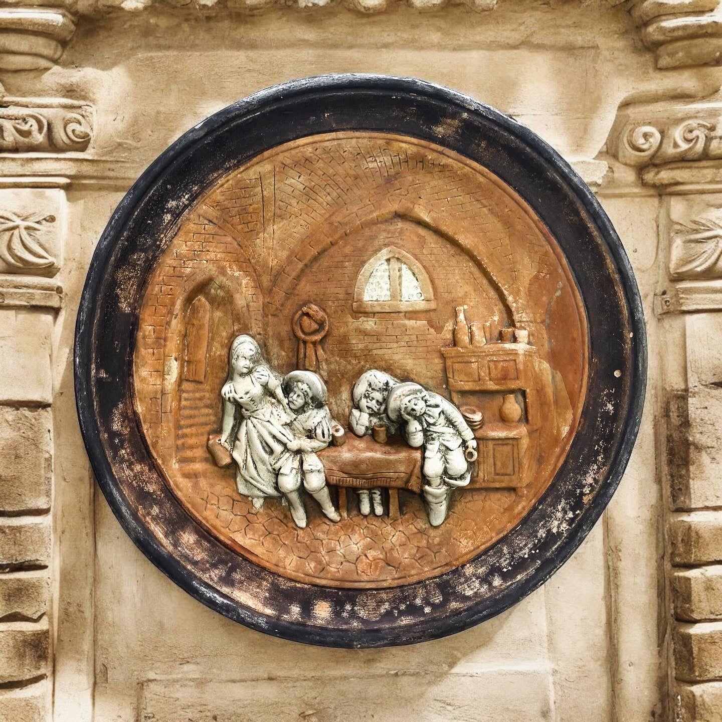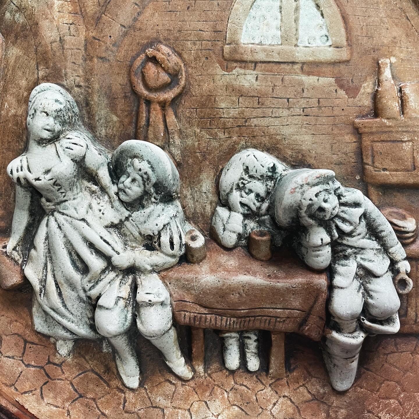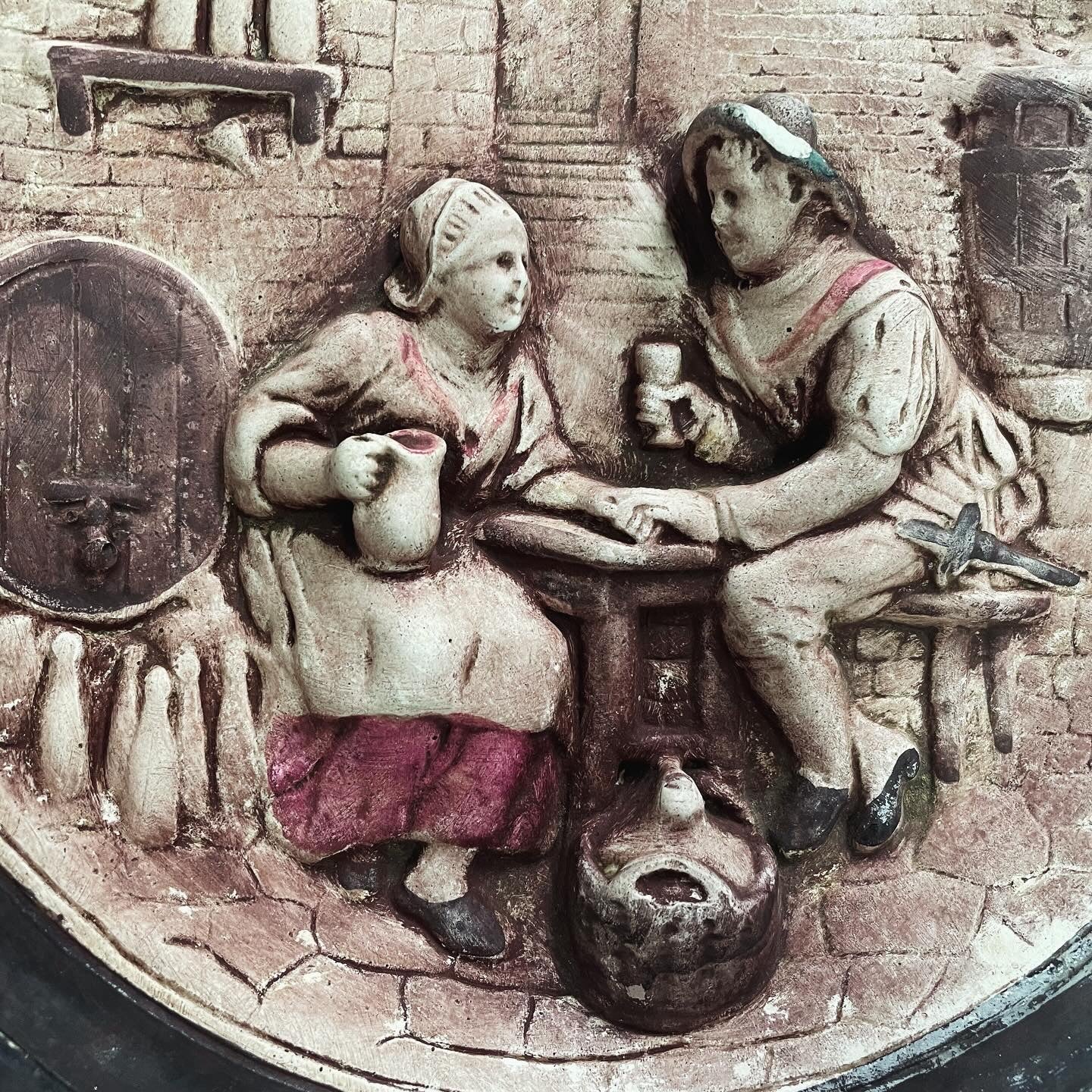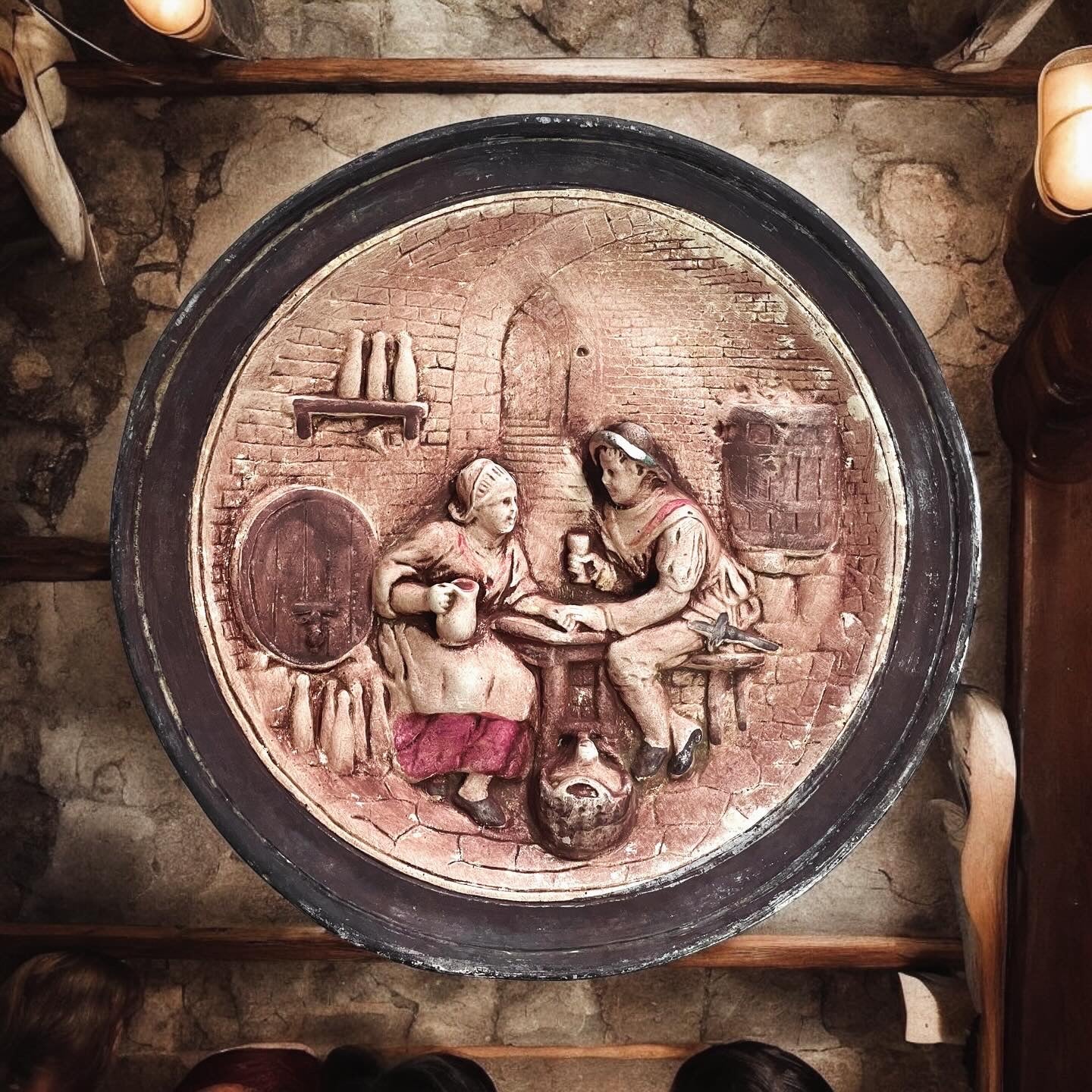 for lovers of Dutch antiques today we have this beautiful retreat to propose ... pair of large bas-reliefs in painted plaster, representing typical interior scenes of life in the past. The diameter of each bas-relief is 35 centimeters; they are in excellent condition except for a small lack on the edge of the hat of the character of one of the two plates. The first one presents the scene of a nineteenth-century banquet with guests drinking wine and embracing girls; the second one instead shows a couple in traditional costumes. As you will have understood, it is the wine that reigns supreme 👀 and therefore these sculptures are perfect for hanging in a wine shop, an old tavern, a bistro.