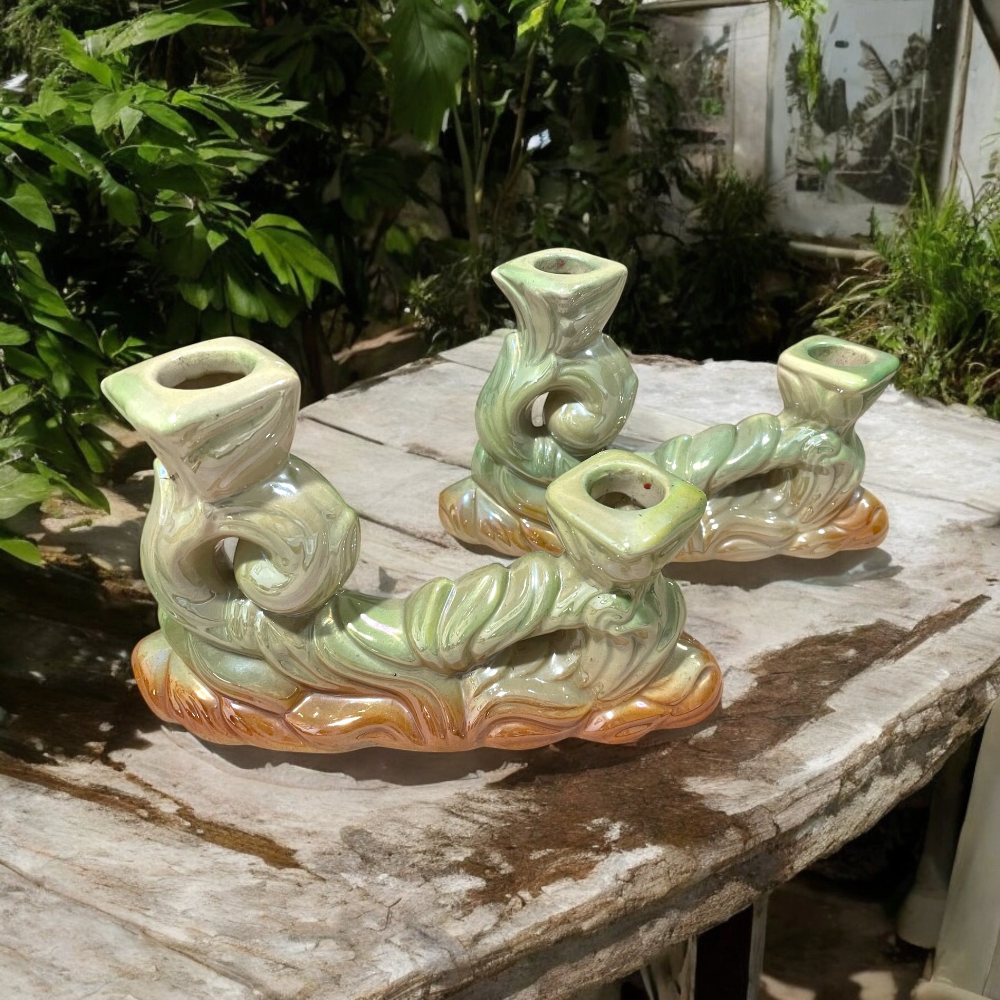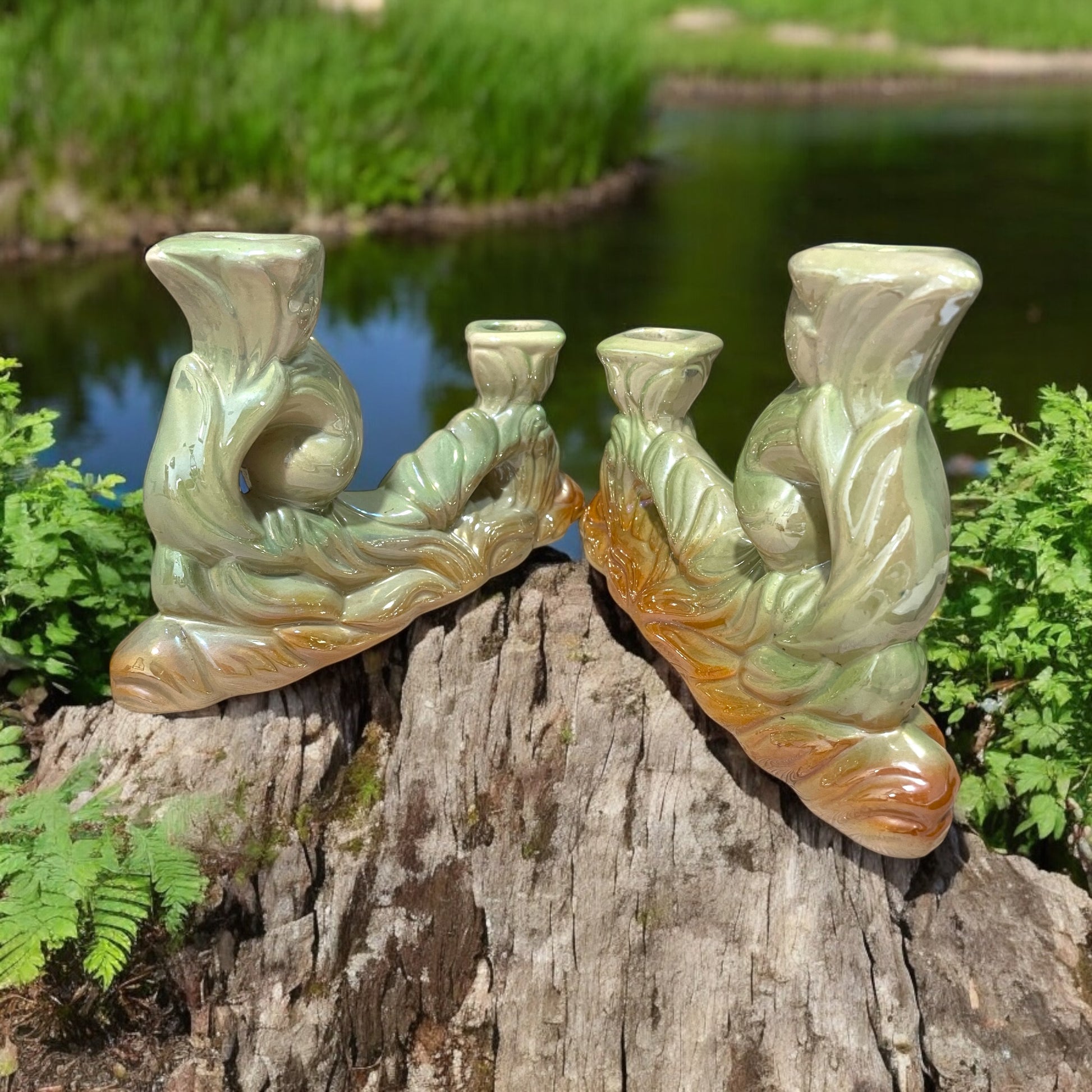 Coppia candelabri Art Nouveau anni ‘30 ceramica iridescente