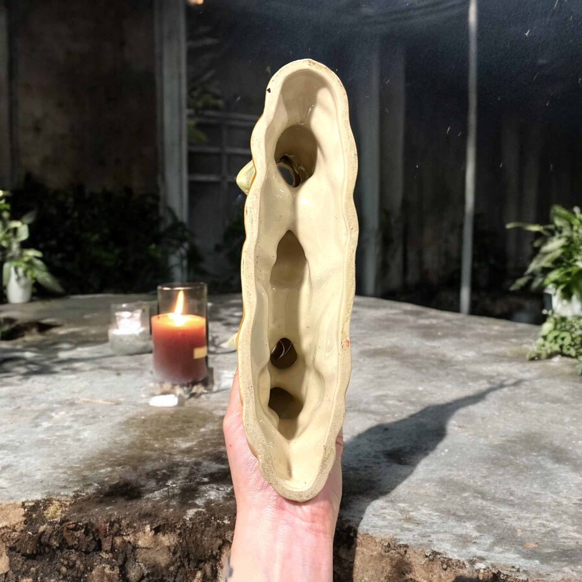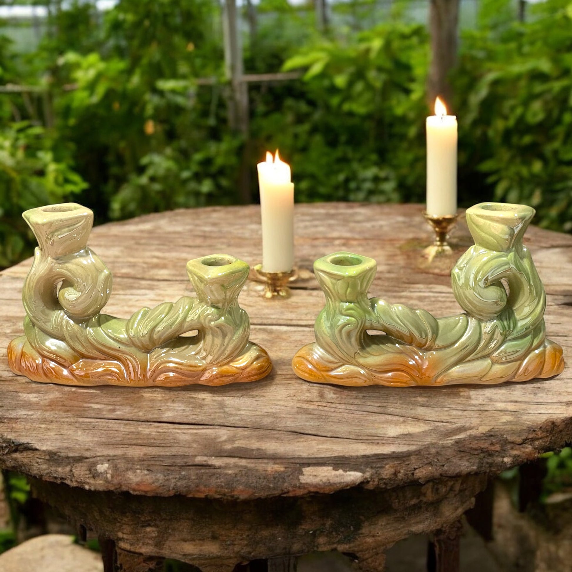 Splendidi candelabri in ceramica smaltata, risalenti agli anni ‘30, caratterizzati da un raffinato design dalle linee sinuose e organiche che richiama l’eredità dell’Art Nouveau, ancora presente in quel periodo. Il dettaglio che li rende davvero unici è lo smalto cangiante, tipico della ceramica artistica dell’epoca, ottenuto grazie alla tecnica della smaltatura iridescente. Questo processo, molto apprezzato tra gli anni ‘20 e ‘30, prevedeva l’applicazione di ossidi metallici che, con una seconda cottura a basse temperature, conferivano alla superficie riflessi che cambiano colore a seconda della luce. Le tonalità variano elegantemente tra il verde, l’oro e sfumature ambrate, donando ai candelabri un fascino senza tempo. Perfetti per creare un’atmosfera calda e ricercata in qualsiasi ambiente. Lunghezza cm 25, altezza cm 14. Ognuno ha due luci.