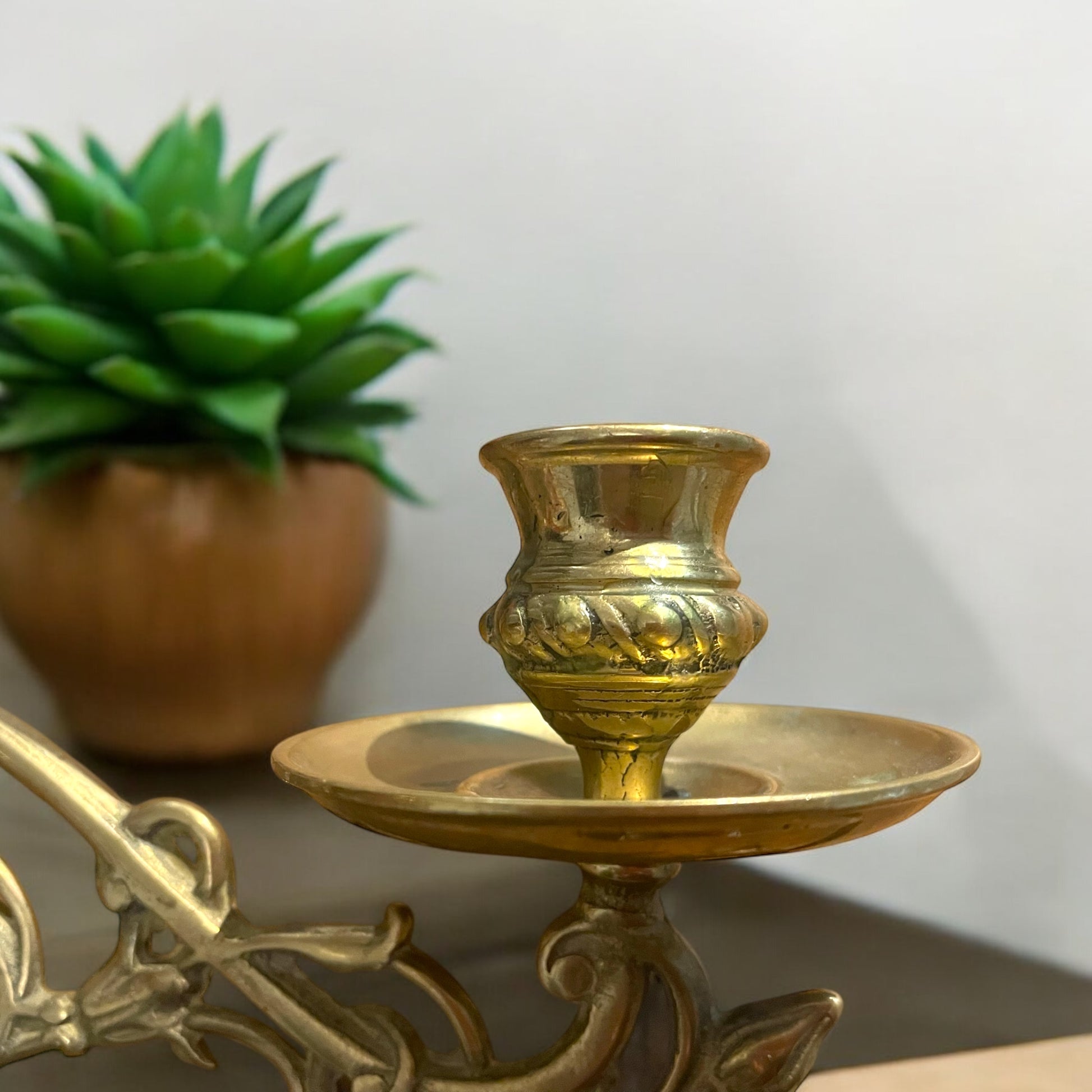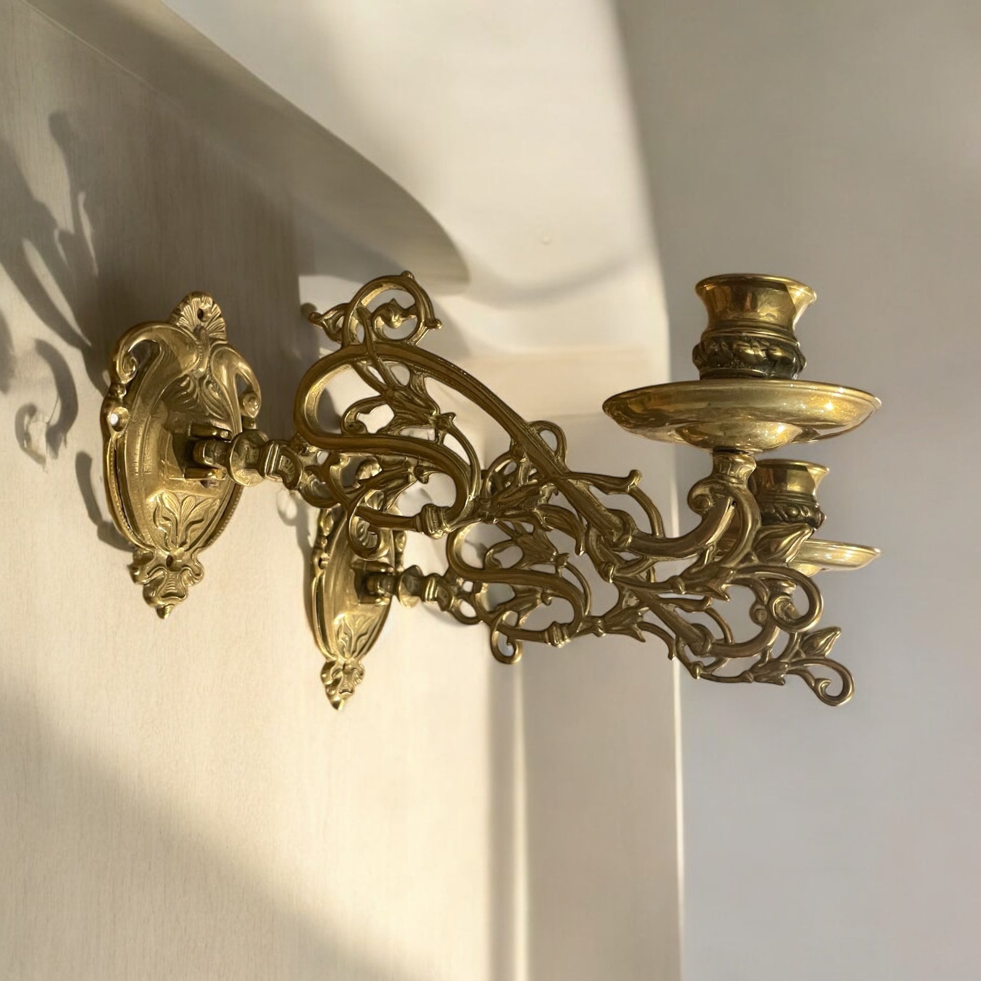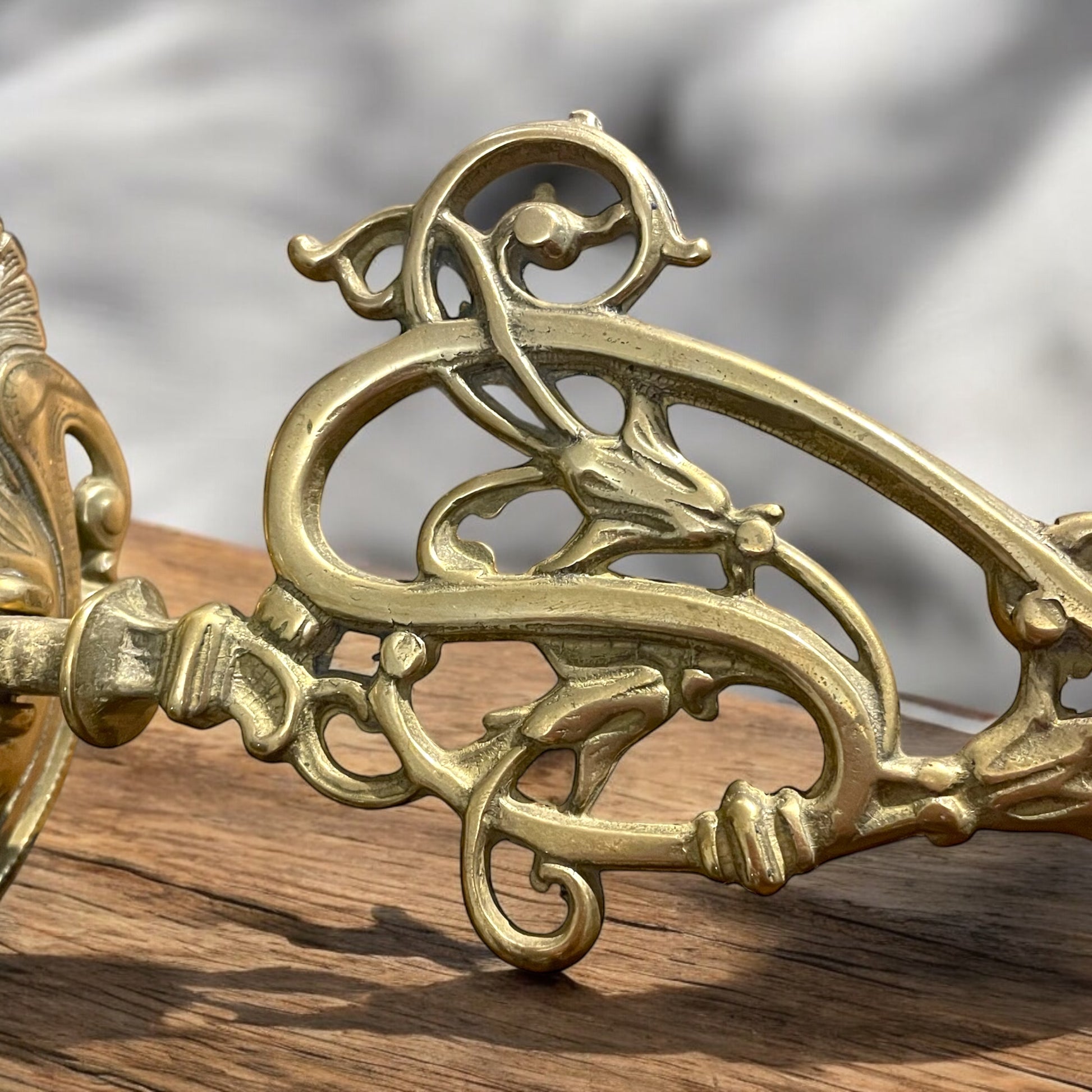 Una stanza avvolta nella penombra, ombre danzano leggere sulle pareti. Al centro, un pianoforte a muro si staglia con la sua elegante presenza: ai suoi lati due splendidi candelabri in ottone, con bracci mobili, diffondono una luce morbida e calda illuminando lo spartito con un bagliore dorato. Questi candelabri sono testimoni silenziosi di un’epoca raffinata: in ottone, si inseriscono perfettamente nello stile Art Nouveau, con le loro forme sinuose e i motivi vegetali che si intrecciano come rami in una foresta incantata. Le volute elaborate, che si rincorrono in un fluire armonioso di curve e riccioli, richiamano la grazia della natura, in un gioco di intrecci che sembra quasi voler prendere vita. La placca per il fissaggio, con le sue raffinate decorazioni a conchiglia e i richiami floreali, rievoca le suggestioni dello stile Rococò, reinterpretate però con la leggerezza tipica del gusto Liberty. La loro funzione era tanto pratica quanto decorativa: fissati ai lati dei pianoforti verticali o a muro, questi candelabri permettevano di orientare la luce in modo strategico, così che le note sullo spartito risplendessero nitide agli occhi del musicista. Oggi, questi candelabri rappresentano non solo un prezioso oggetto d’arredo, ma anche un frammento di storia del design e della vita quotidiana del passato. Posizionati in una sala da musica, in un ingresso elegante o come punti luce alternativi in un ambiente contemporaneo, continuano a raccontare la loro storia fatta di eleganza e fascino senza tempo. La lunghezza dalla placca è cm 24.5. Ottime le condizioni.