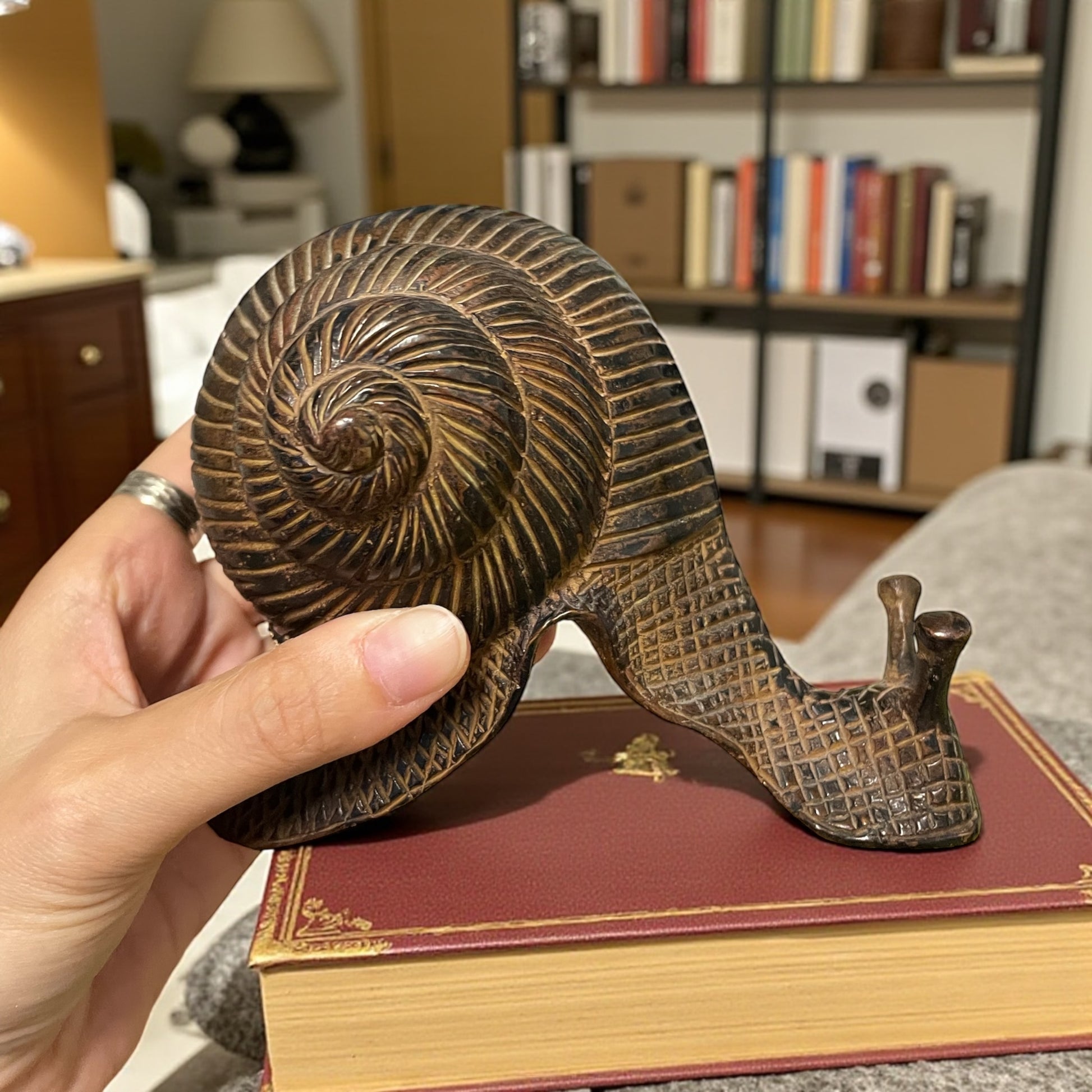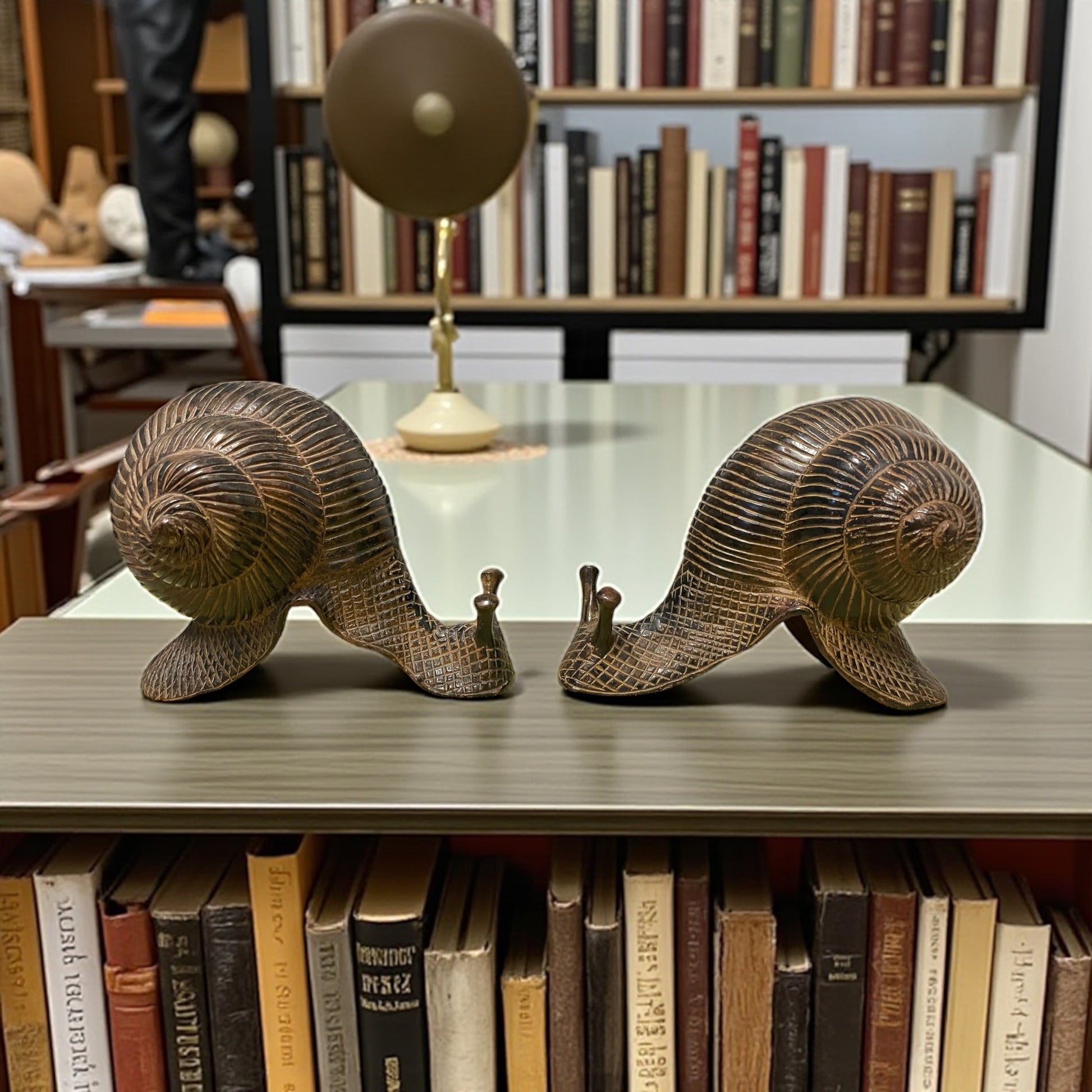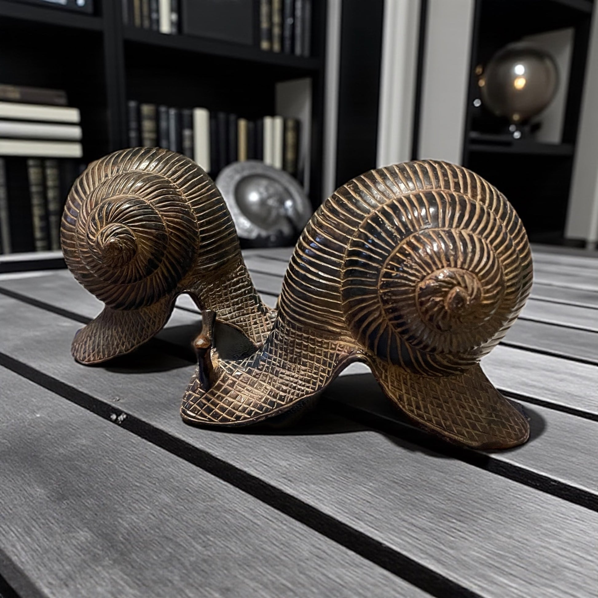 Coppia di fermalibri a forma di chiocciola in metallo fuso, con elegante patinatura bronzata. Presentano una lavorazione curata e una patina che dona calore e profondità al colore. L’interno è cavo (fusione a stampo), il peso resta consistente e garantisce stabilità nell’uso. Tra pagine che attendono di essere riaperte, queste due chiocciole vegliano con pazienza. Non hanno fretta, perché conoscono il tempo lento della lettura, quello che scivola piano come un guscio che si avvolge su se stesso. Il loro peso solido regge i volumi senza sforzo, ma è la loro forma poetica a incantare: la spirale del guscio che richiama i percorsi della memoria, il corpo che sembra quasi avanzare verso la prossima storia. Non semplici fermalibri, ma piccoli custodi del ritmo interiore della lettura. Dettagli capaci di dare carattere a qualsiasi libreria, con un tocco poetico che richiama la lentezza della lettura e il tempo che scorre piano.