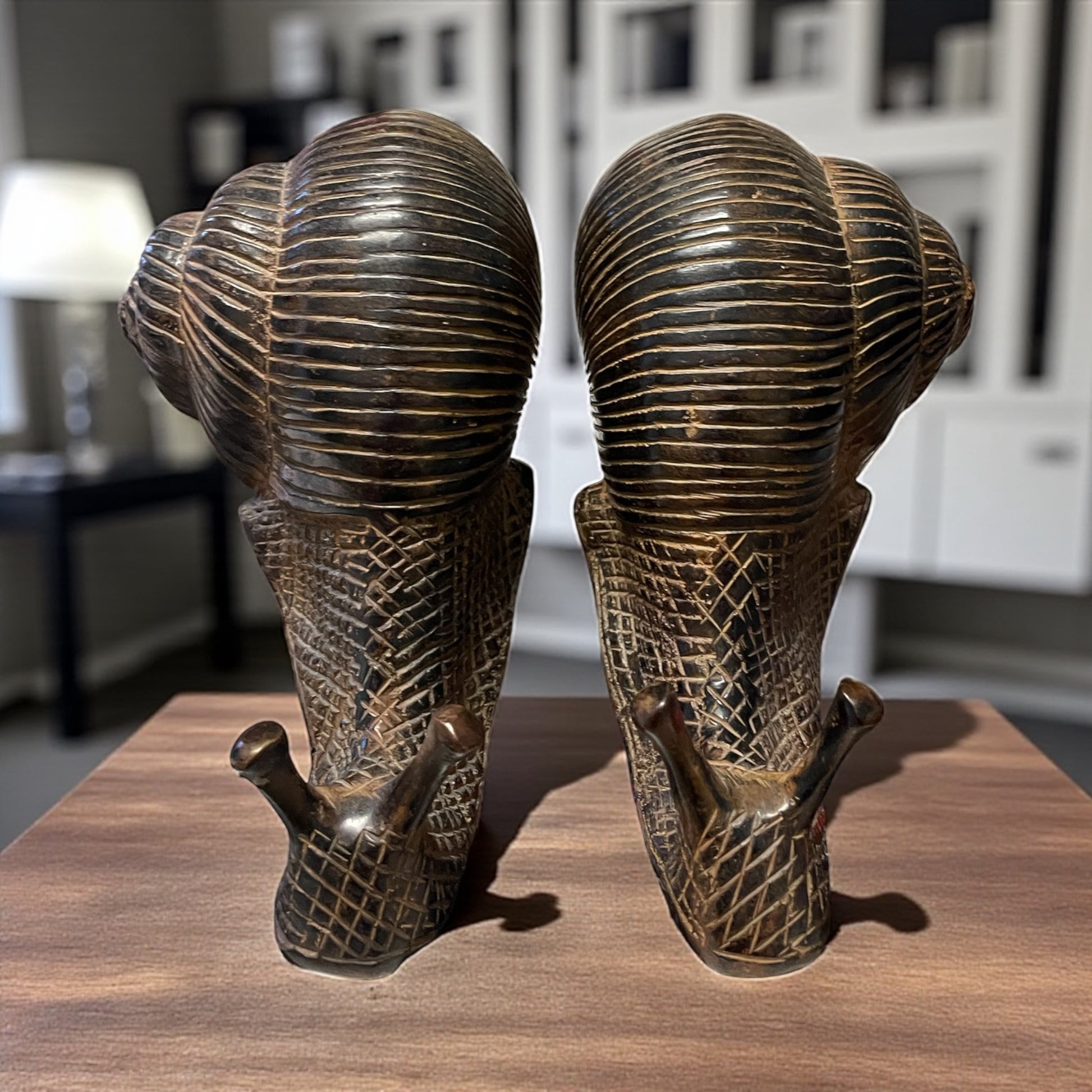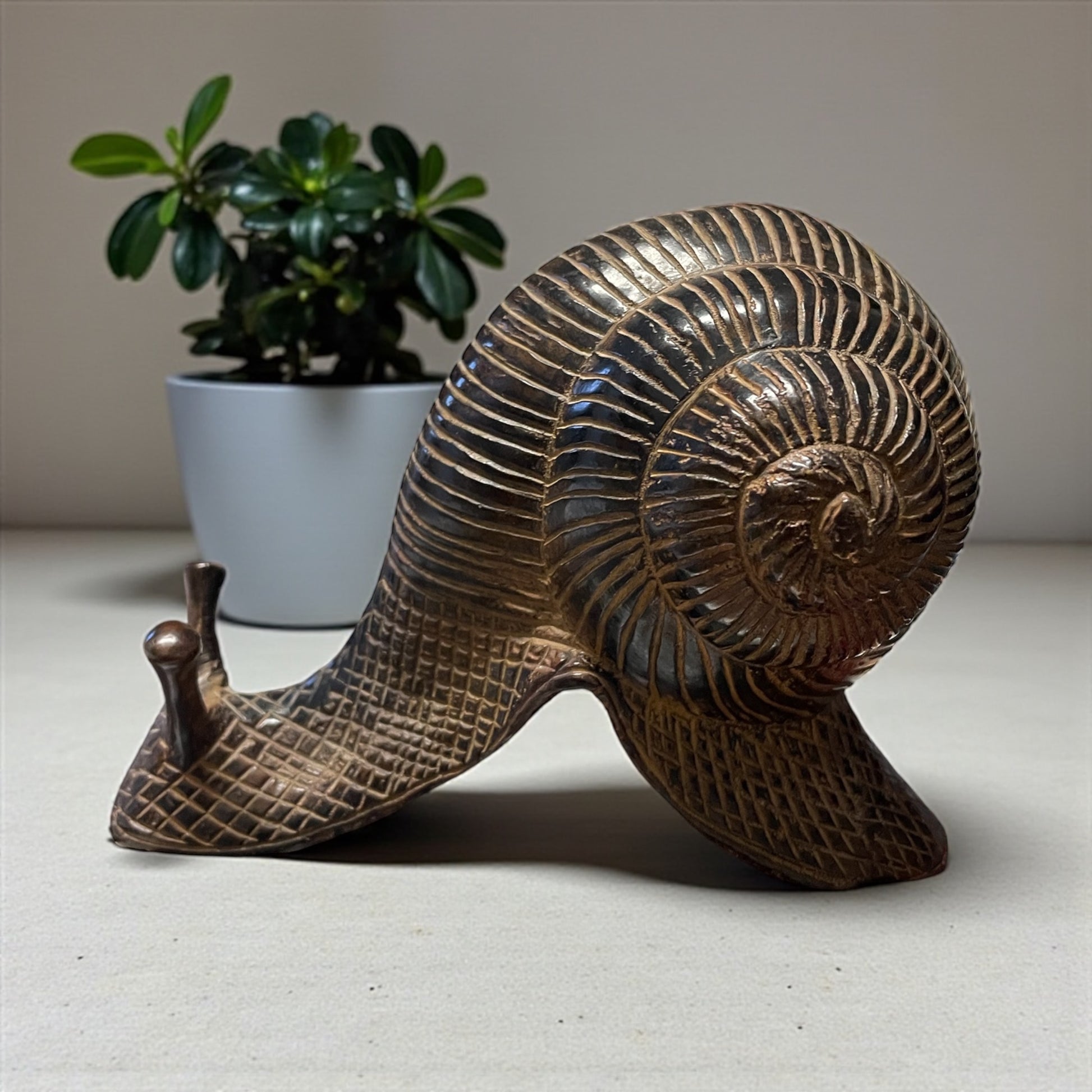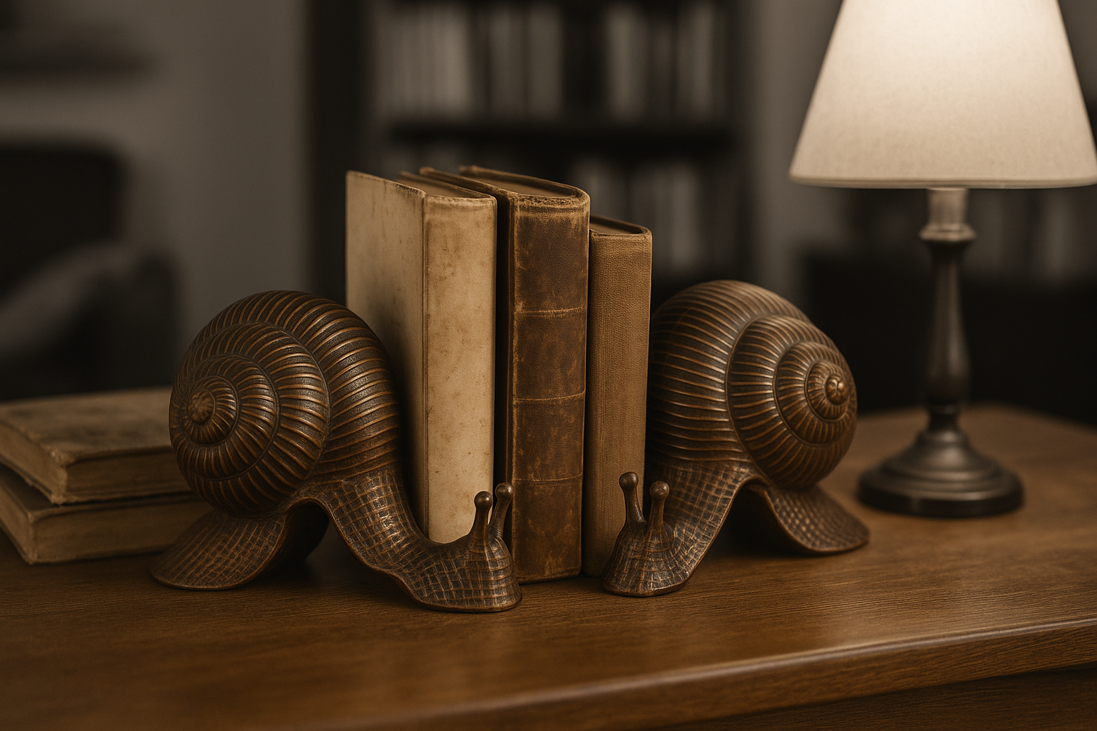 Coppia di fermalibri a forma di chiocciola in metallo fuso, con elegante patinatura bronzata. Presentano una lavorazione curata e una patina che dona calore e profondità al colore. L’interno è cavo (fusione a stampo), il peso resta consistente e garantisce stabilità nell’uso. Tra pagine che attendono di essere riaperte, queste due chiocciole vegliano con pazienza. Non hanno fretta, perché conoscono il tempo lento della lettura, quello che scivola piano come un guscio che si avvolge su se stesso. Il loro peso solido regge i volumi senza sforzo, ma è la loro forma poetica a incantare: la spirale del guscio che richiama i percorsi della memoria, il corpo che sembra quasi avanzare verso la prossima storia. Non semplici fermalibri, ma piccoli custodi del ritmo interiore della lettura. Dettagli capaci di dare carattere a qualsiasi libreria, con un tocco poetico che richiama la lentezza della lettura e il tempo che scorre piano.