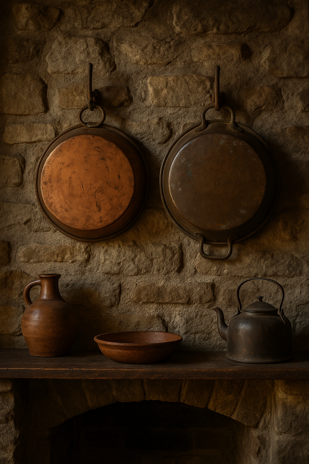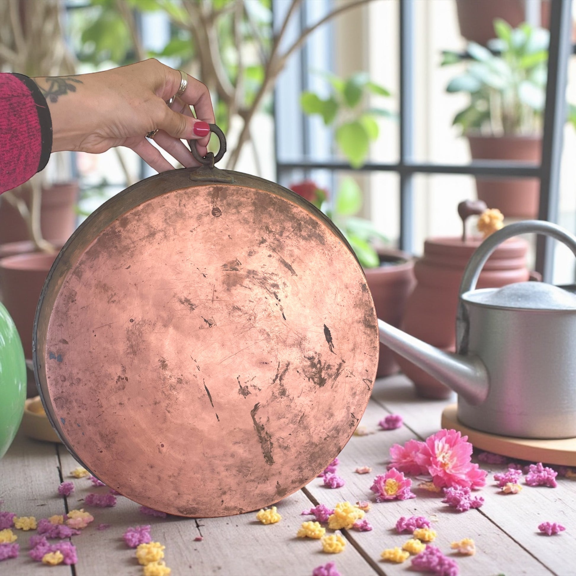 Li ho trovati insieme, e insieme devono restare. Questa coppia di paioli in rame della Val Sabbia nasce per un tipo di cucina che oggi quasi non esiste più: una cucina lenta, silenziosa, fatta di attesa e fuoco vivo. Non erano pensati per bollire acqua in fretta, ma per trasformare lentamente la materia, con pazienza e cura. Dentro questi paioli bassi si scioglieva il tempo: la cotognata, le marmellate dense di frutta, le conserve d’uva per l’inverno, e quelle ricette che non avevano nome ma solo sapienza tramandata. Il rame portava calore uniforme, il ferro delle maniglie resisteva al fuoco, e ogni cottura era un gesto di casa. Oggi portano con sé la dignità del lavoro di chi li ha usati, la memoria di mani vere, e quel sapore di semplicità che non si compra al mercato. Non sono oggetti da lucidare: sono da ascoltare.