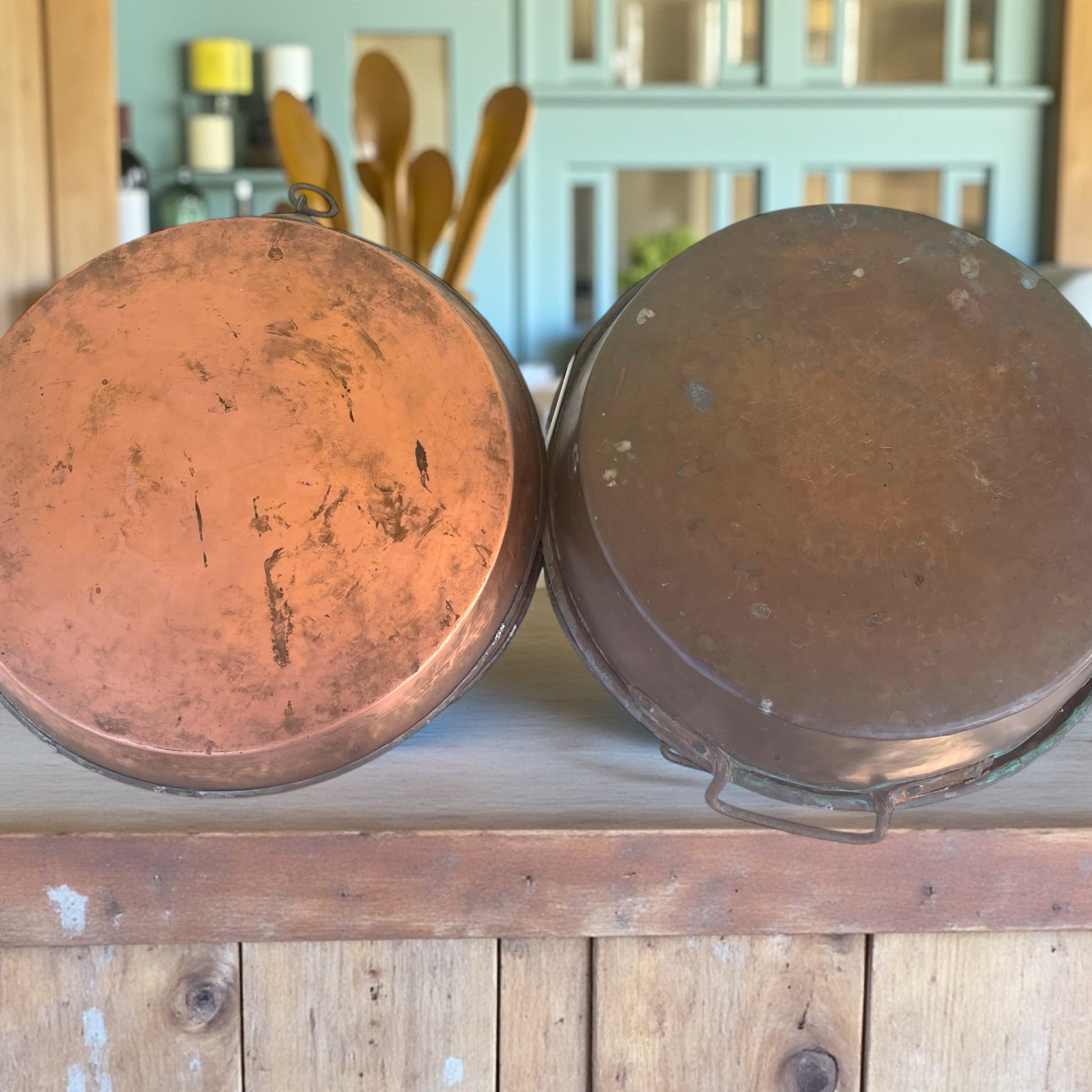 Coppia di paioli antichi in rame. Provenienza: Val Sabbia (Lombardia). Epoca: fine ’800 – inizi ’900. Diametro: 35 e 37,5 cm. Interno stagnato originale – uso da camino. Manici in ferro battuto, patina autentica. Ideali per arredo rustico, cucine country, scenografie alpine.