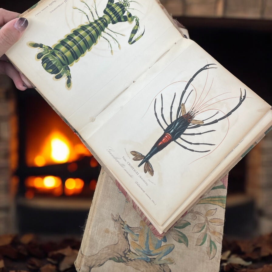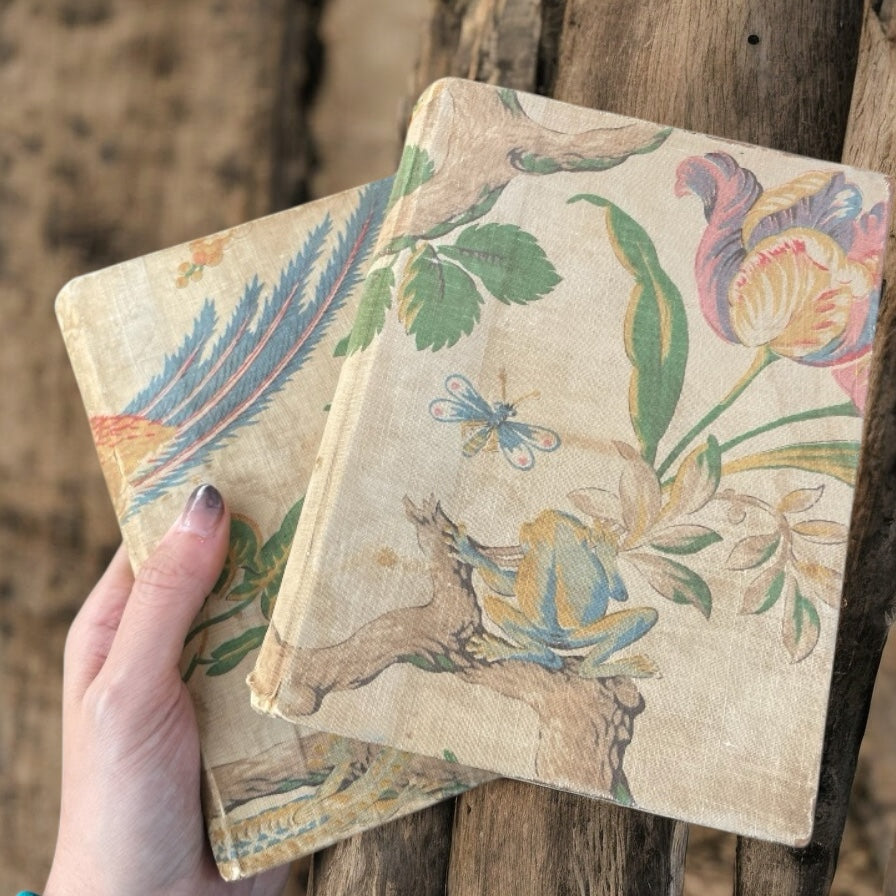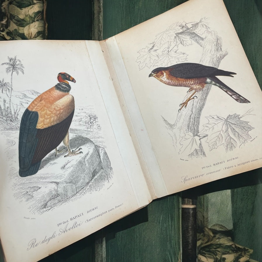 La donna che collezionava il mondo… In un’epoca in cui l’accesso allo studio era ancora un privilegio maschile, c’era una donna che non volle arrendersi ai confini imposti dal suo tempo. Non aveva una biblioteca a disposizione né una cattedra da cui apprendere: aveva invece occhi avidi di conoscenza, mani pazienti e un cuore capace di trasformare la curiosità in arte. Così, giorno dopo giorno, ritagliò pazientemente stampe antiche: tavole zoologiche provenienti da libri vetusti, forse già logorati dal tempo e dall’uso. Disegni meticolosi, incisi con maestria e colorati a mano, testimoni di un sapere che ancora sapeva meravigliarsi. Pesci, uccelli coloratissimi, disegni assai curati. Lei non aveva strumenti ufficiali, né le erano concessi titoli o diplomi. Allora decise di costruirseli da sé: rivestì due semplici quaderni con tessuti a motivi floreali, li trasformò in scrigni segreti, e in ogni pagina incollò con cura la meraviglia del mondo. Creò così la sua personale enciclopedia, fatta non di parole stampate, ma di immagini scelte, raccolte, amate. Un atto di artigianato e insieme di ribellione silenziosa: studiare, esplorare, sapere, senza bisogno di permesso. Sfogliare oggi questi quaderni è come aprire una finestra su una storia che non venne mai scritta sui libri: la storia di una donna che, con strumenti poveri e un’anima ricca, inseguì la conoscenza e si creò il suo posto tra i saperi del mondo. Con ogni animale incollato su quelle pagine, rivendicò il diritto di conoscere, di amare, di appartenere. N. 85 antiche stampe d’epoca.