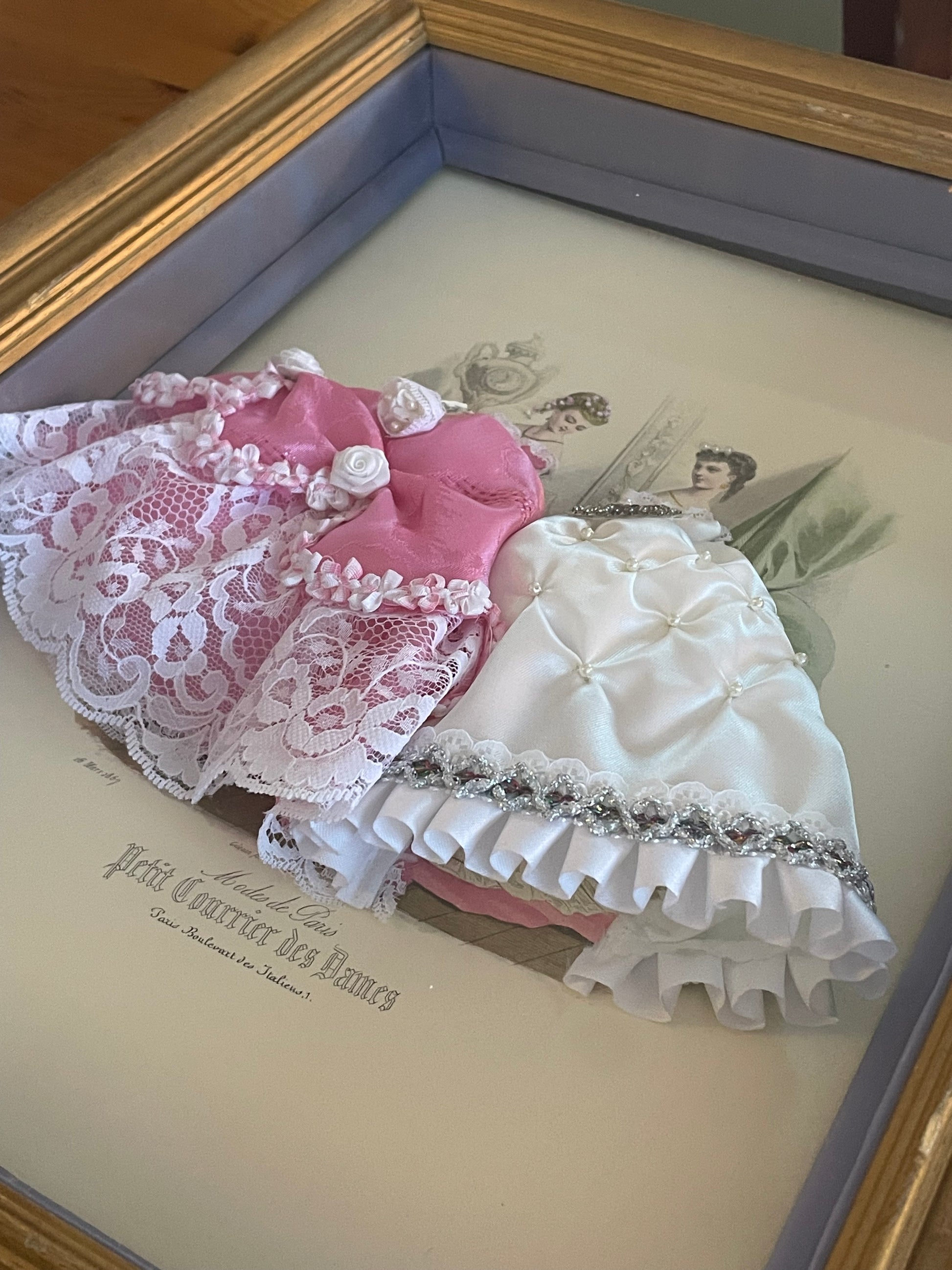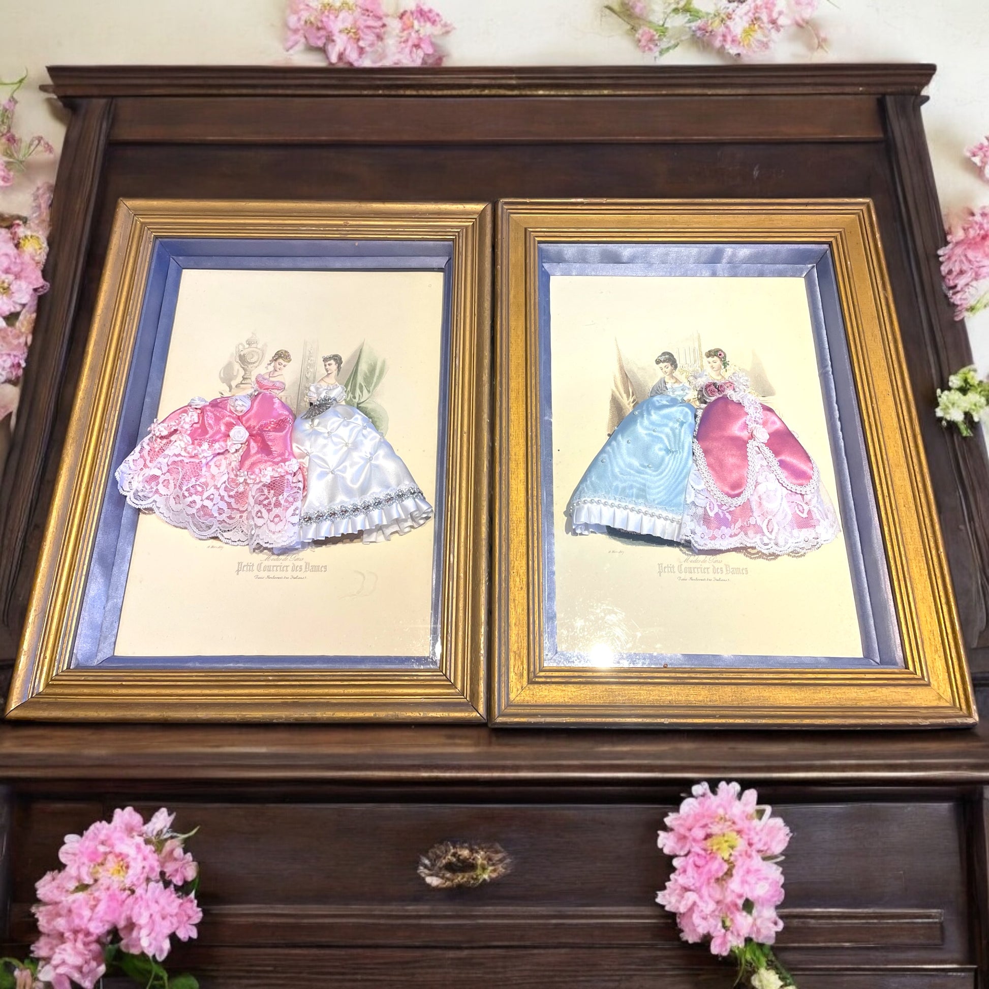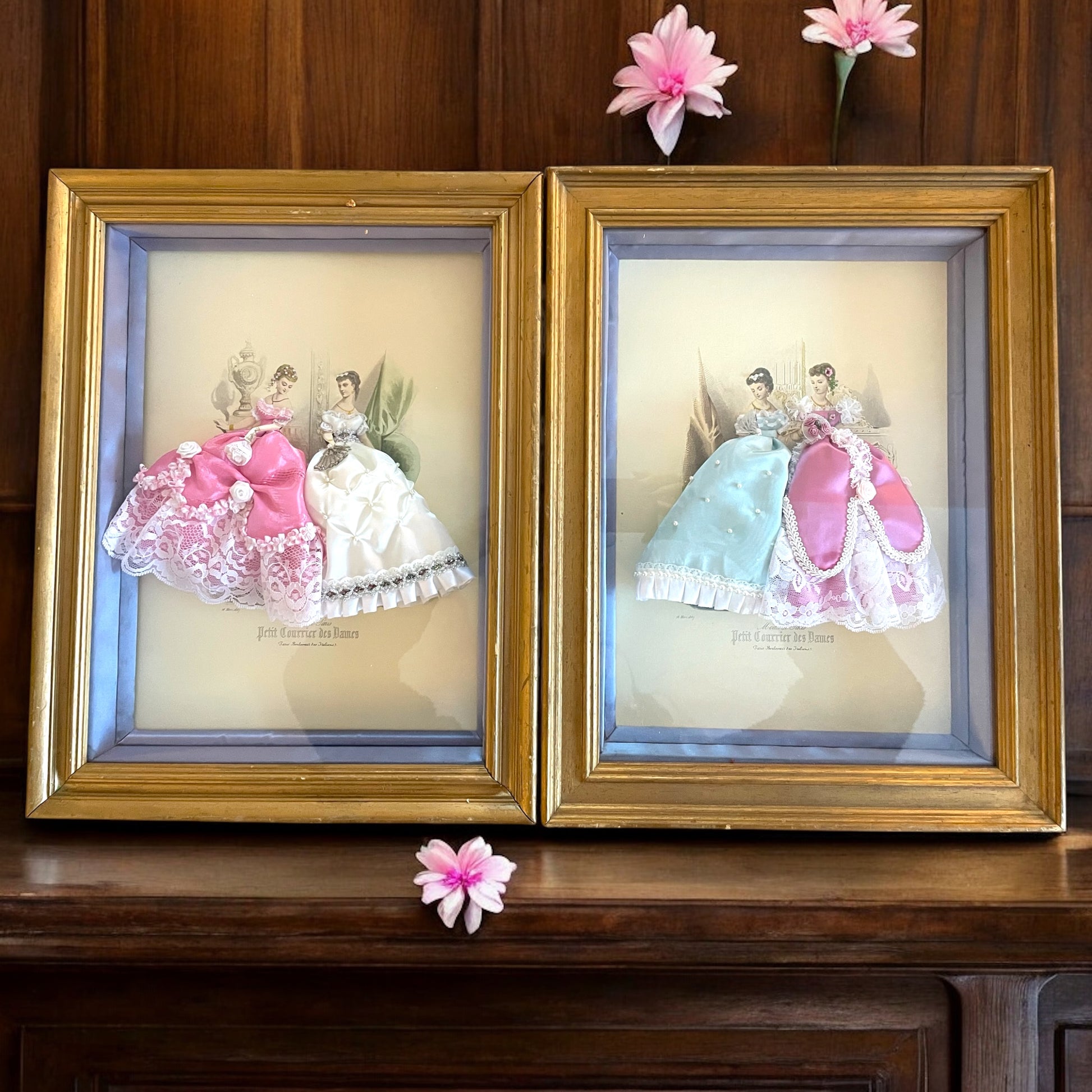 Coppia quadri di profondità con stampe modisteria ‘800 e abiti tessuti a mano