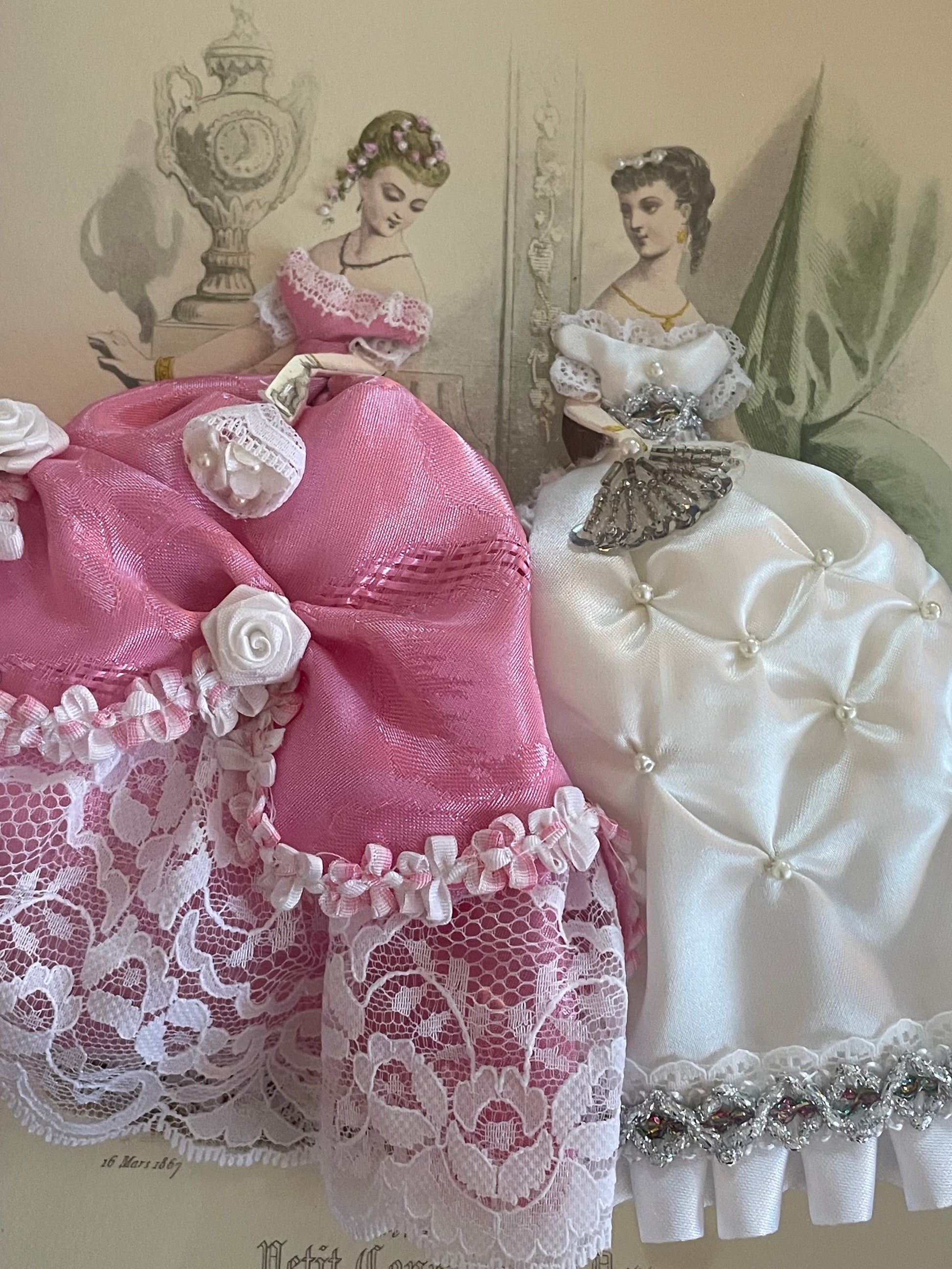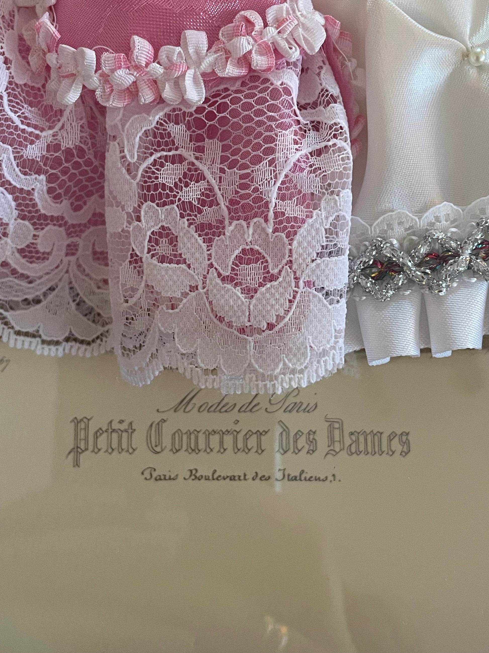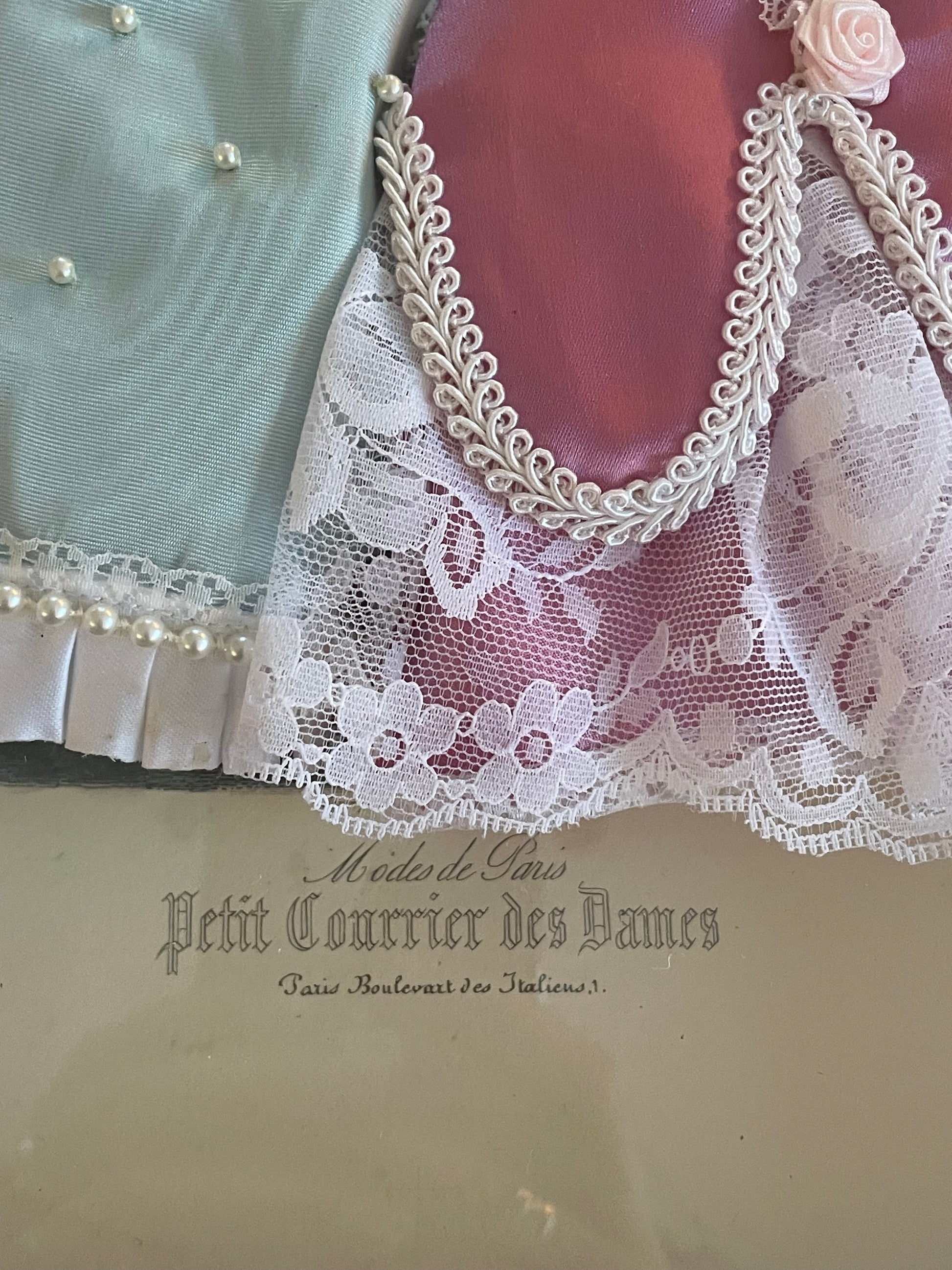 Un’elegante finestra su un passato intriso di fascino e creatività. Questa coppia di quadri di profondità fonde il delicato incanto delle illustrazioni ottocentesche della celebre rivista parigina “Petit Courrier des Dames” con l’arte tessile successiva. Le immagini originali, tratte da un’epoca in cui la moda era un linguaggio di lusso e bellezza, sono state impreziosite da abiti realizzati a mano, con tessuti e accessori tridimensionali che sembrano portare in vita le raffinate figure rappresentate. Gli abiti, cuciti con una perizia artigianale e ornati da perle, pizzi e nastri, amplificano l’aura romantica di queste stampe, trasformandole in opere uniche che evocano i fasti e la grazia dell’alta società parigina del XIX secolo. La delicatezza delle rose di seta, la lucentezza del raso e la precisione dei dettagli sartoriali si uniscono per creare un piccolo “teatro visivo”, dove ogni elemento narra una storia di eleganza e maestria. Con le loro cornici dorate - e i profili interni in raso! - che incorniciano questo dialogo tra illustrazione e tessuto, questi quadri sono capsule del tempo, un omaggio alla moda come arte e alla capacità umana di reinventare la bellezza, generazione dopo generazione. Misure 44.5 x 34.5, completi di vetro protettivo.