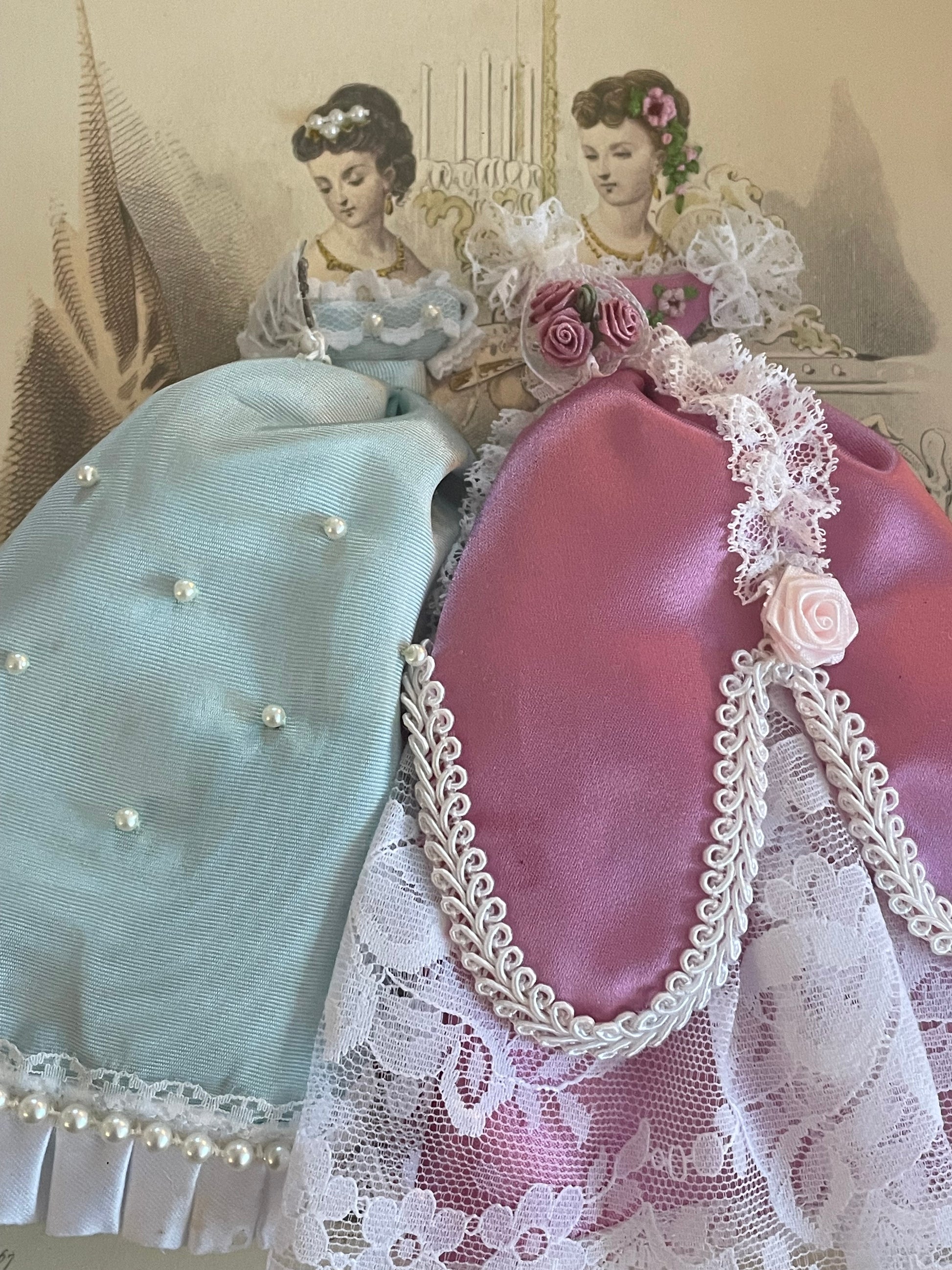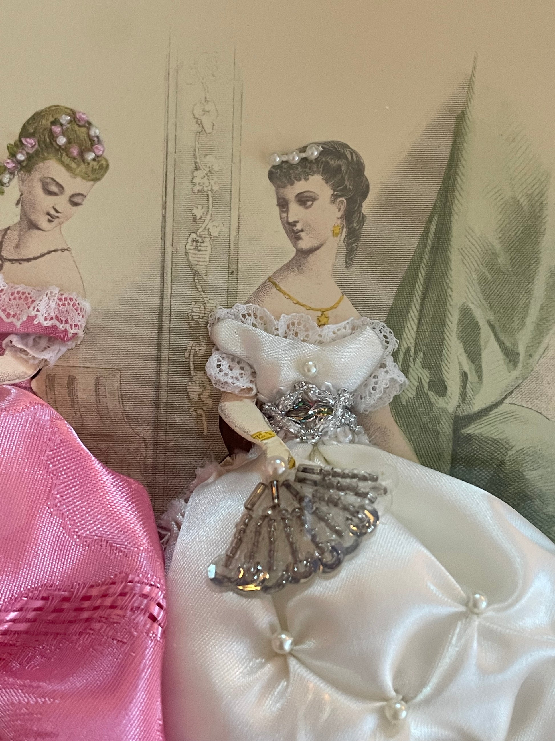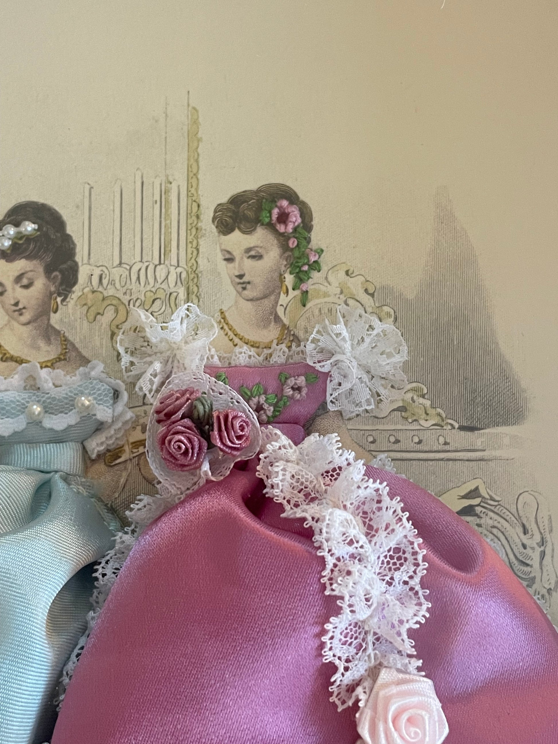 Un’elegante finestra su un passato intriso di fascino e creatività. Questa coppia di quadri di profondità fonde il delicato incanto delle illustrazioni ottocentesche della celebre rivista parigina “Petit Courrier des Dames” con l’arte tessile successiva. Le immagini originali, tratte da un’epoca in cui la moda era un linguaggio di lusso e bellezza, sono state impreziosite da abiti realizzati a mano, con tessuti e accessori tridimensionali che sembrano portare in vita le raffinate figure rappresentate. Gli abiti, cuciti con una perizia artigianale e ornati da perle, pizzi e nastri, amplificano l’aura romantica di queste stampe, trasformandole in opere uniche che evocano i fasti e la grazia dell’alta società parigina del XIX secolo. La delicatezza delle rose di seta, la lucentezza del raso e la precisione dei dettagli sartoriali si uniscono per creare un piccolo “teatro visivo”, dove ogni elemento narra una storia di eleganza e maestria. Con le loro cornici dorate - e i profili interni in raso! - che incorniciano questo dialogo tra illustrazione e tessuto, questi quadri sono capsule del tempo, un omaggio alla moda come arte e alla capacità umana di reinventare la bellezza, generazione dopo generazione. Misure 44.5 x 34.5, completi di vetro protettivo.