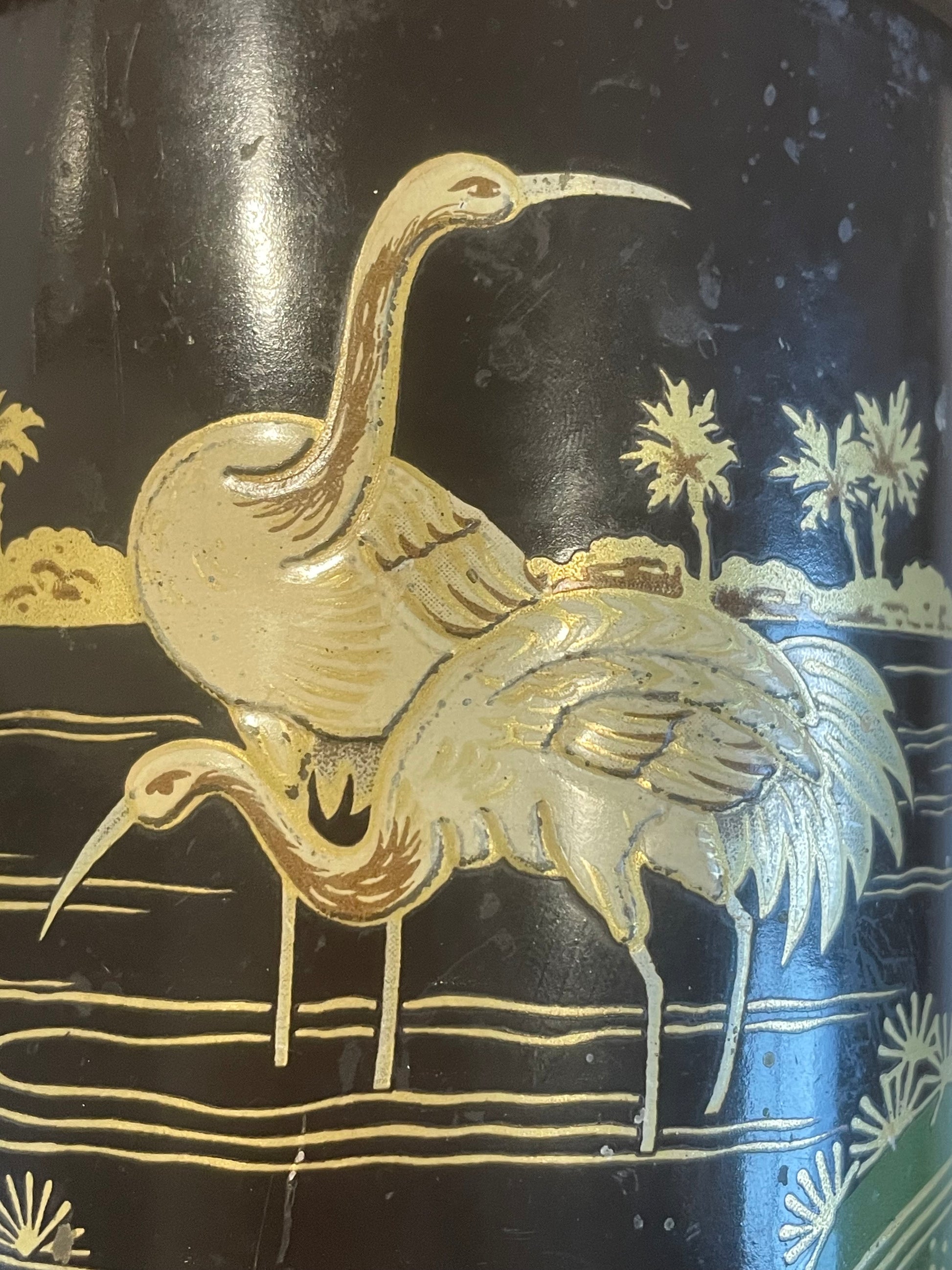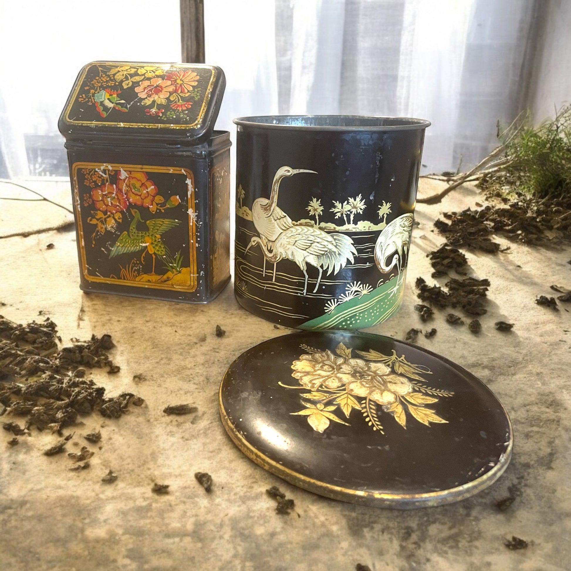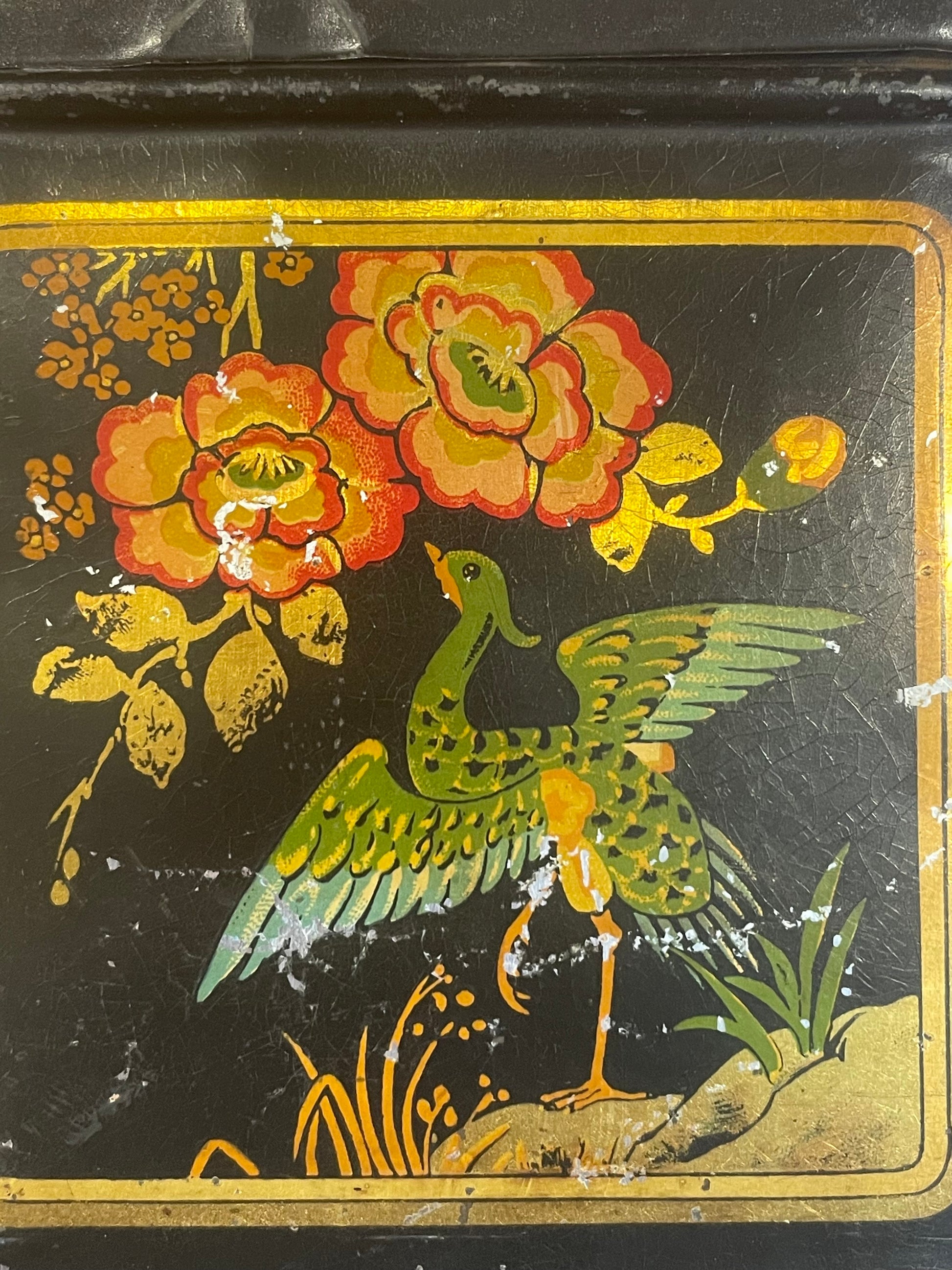 La prima scatola, risalente ai primi decenni del Novecento, emana l’eleganza di un’epoca in cui il tè non era solo una bevanda, ma un rito. Il suo decoro raffigura due gru, animali simbolo di longevità e armonia, immerse in un paesaggio esotico che rievoca l’Oriente, patria del tè in foglie che un tempo conteneva. Probabilmente progettata per i raffinati salotti europei, questa scatola racconta di viaggi lontani, di carovane cariche di spezie e aromi, e del lento scorrere del tempo scandito dal tintinnio delle tazze di porcellana. È alta cm 15. Sotto ha dei piccoli piedini, per evitare l’umidità.