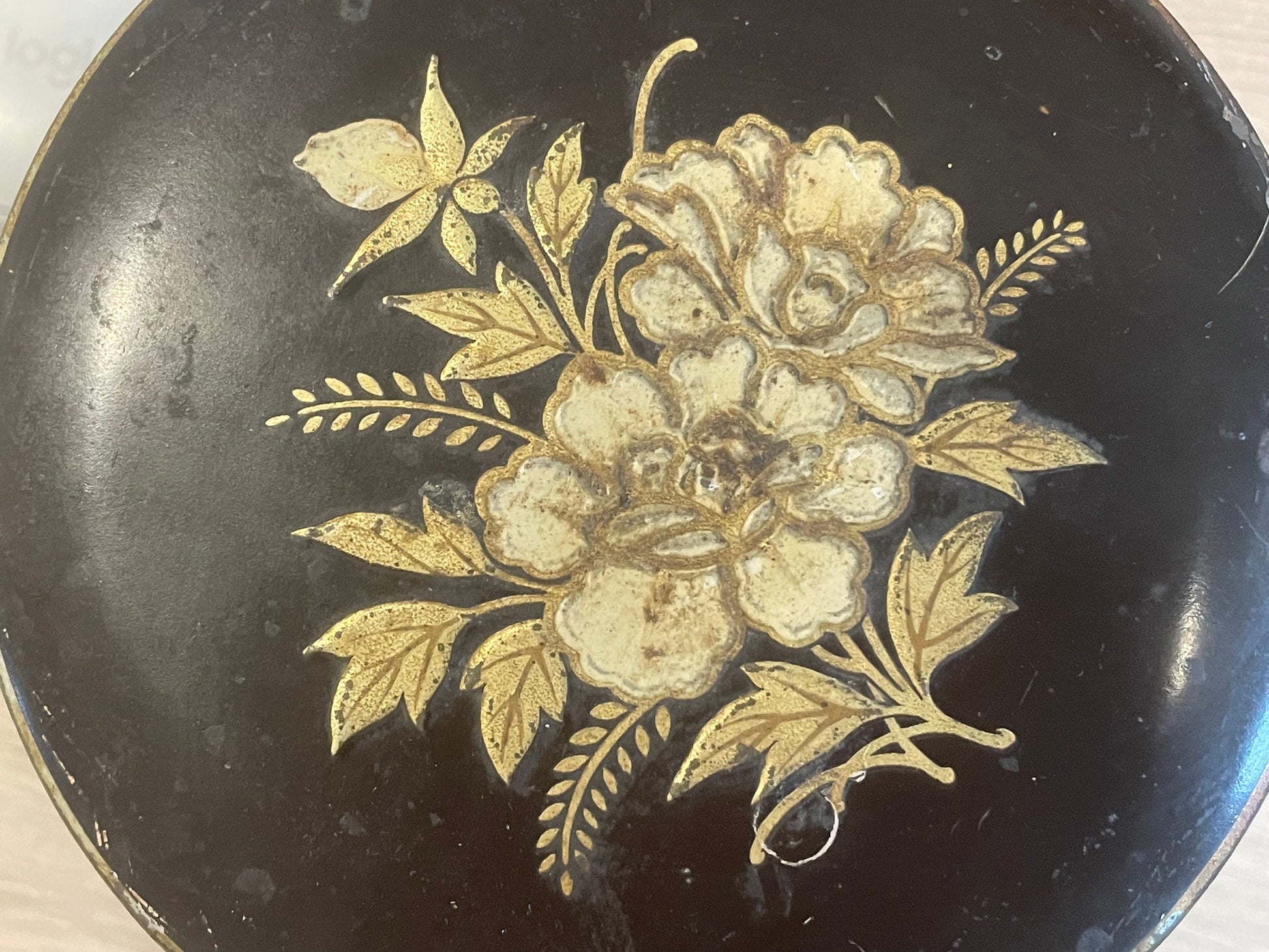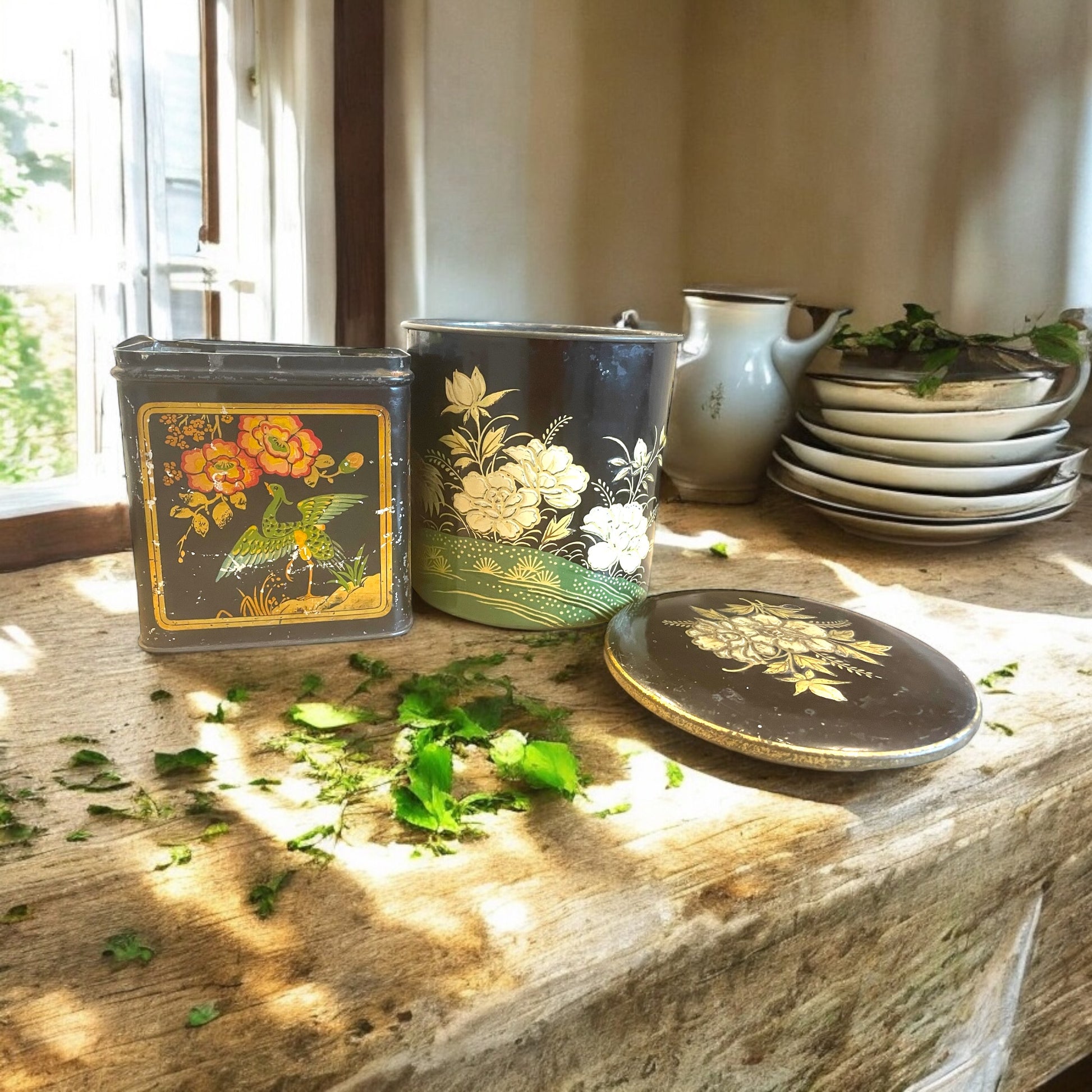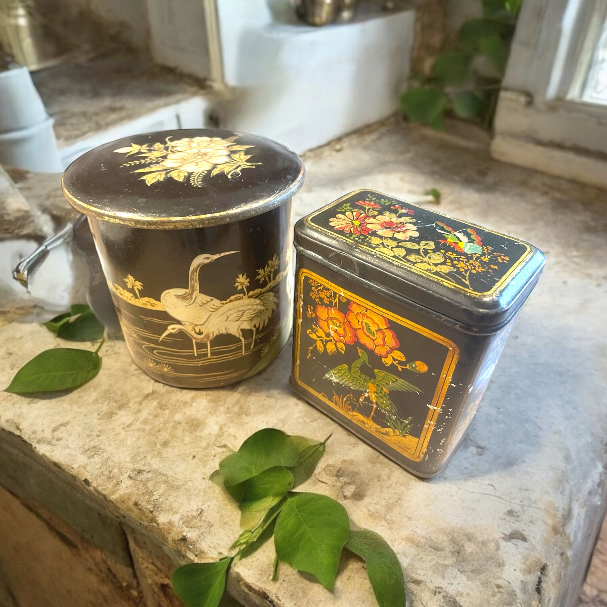 La prima scatola, risalente ai primi decenni del Novecento, emana l’eleganza di un’epoca in cui il tè non era solo una bevanda, ma un rito. Il suo decoro raffigura due gru, animali simbolo di longevità e armonia, immerse in un paesaggio esotico che rievoca l’Oriente, patria del tè in foglie che un tempo conteneva. Probabilmente progettata per i raffinati salotti europei, questa scatola racconta di viaggi lontani, di carovane cariche di spezie e aromi, e del lento scorrere del tempo scandito dal tintinnio delle tazze di porcellana. È alta cm 15. Sotto ha dei piccoli piedini, per evitare l’umidità.