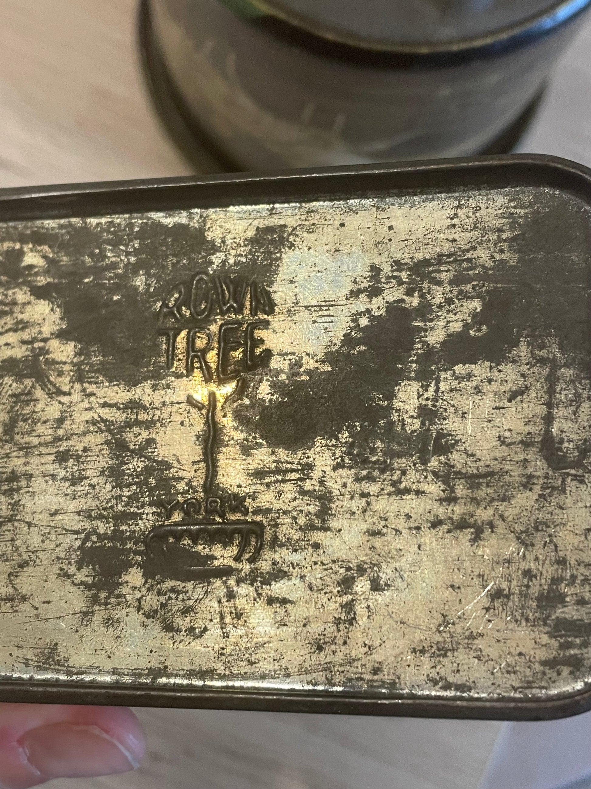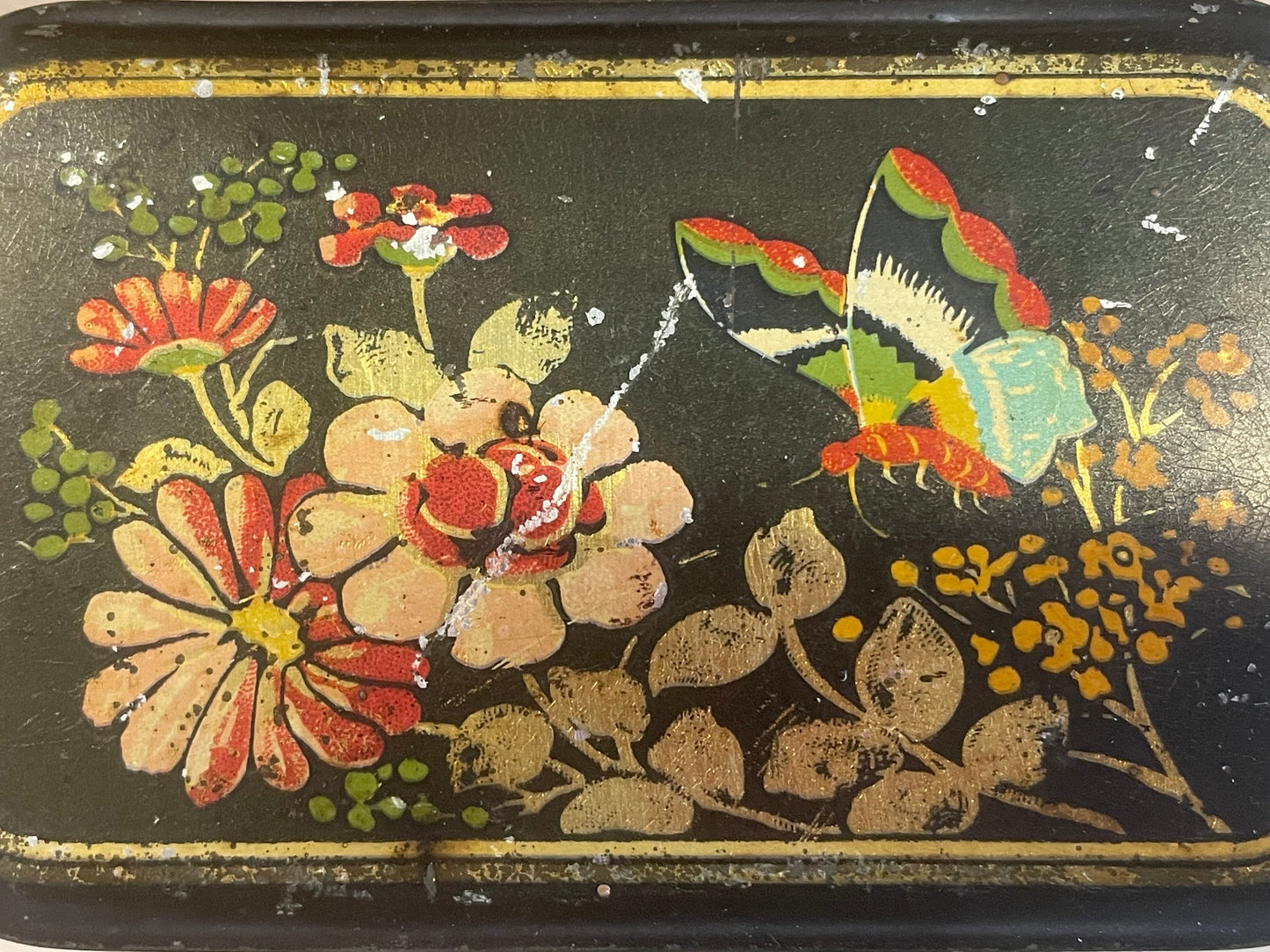 La seconda scatola, antecedente alla metà del Novecento, appartiene invece a un’altra tradizione: quella delle dolci tentazioni. Decorata con un vivace uccello del paradiso che spicca il volo tra fiori sgargianti porta il marchio della celebre Rowntree di York, la storica azienda inglese che ha scritto la storia della pasticceria mondiale e che, negli anni a venire, avrebbe dato vita a capolavori come il celebre KitKat. Questa scatola, che forse conteneva cioccolatini destinati a doni o a momenti di festa, racchiude la gioia di un tempo in cui anche gli oggetti di uso quotidiano erano pensati per durare e incantare. Ha il coperchio incernierato ed è alta 11 cm.