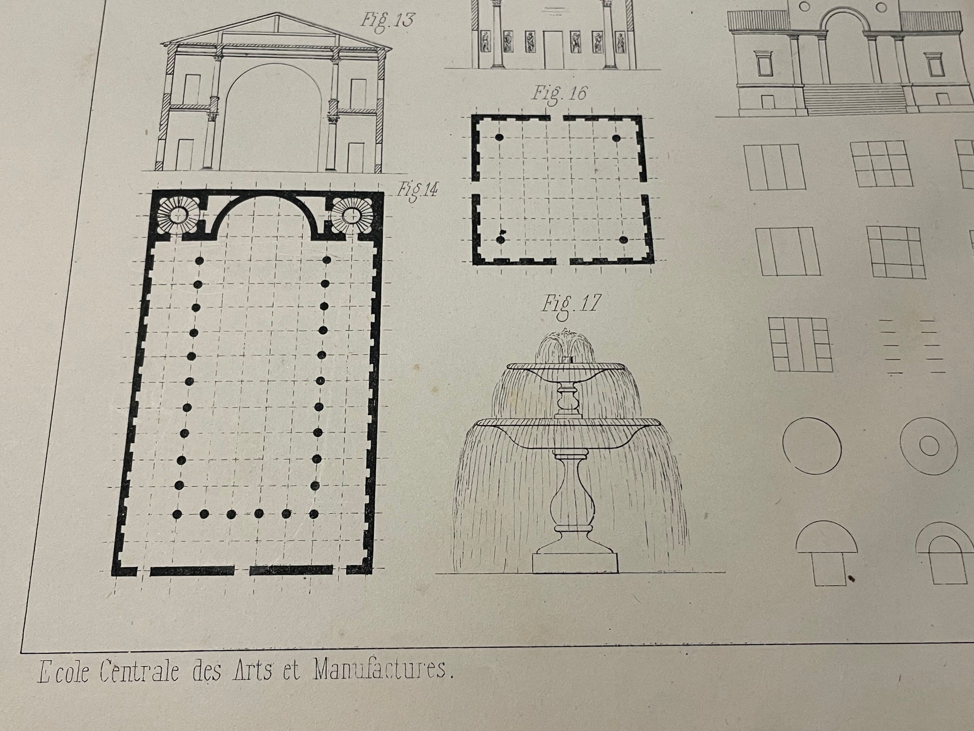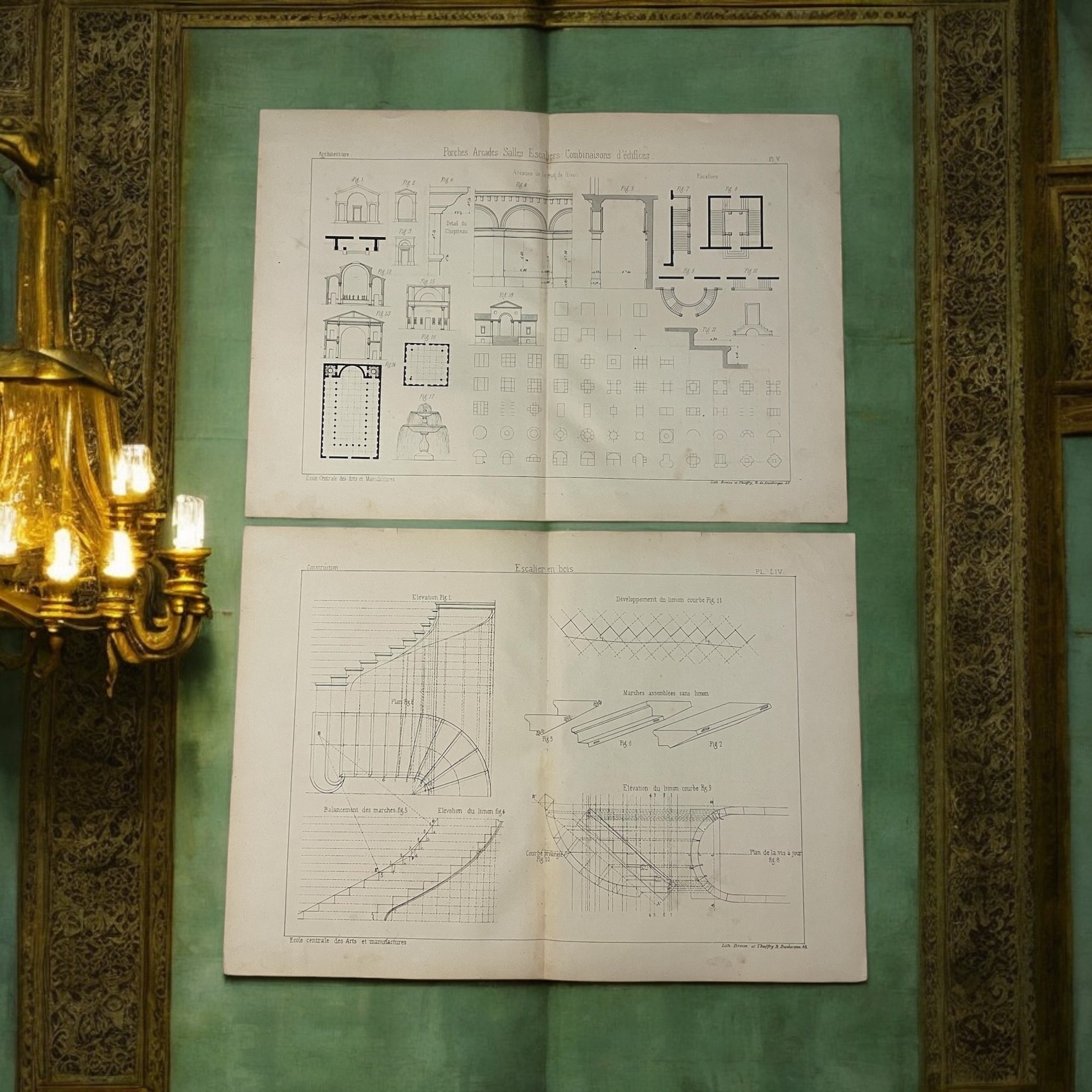 Queste straordinarie tavole illustrate, provenienti dall’École Centrale des Arts et Manufactures di Parigi e databili tra il 1830 e il 1870, rappresentano un’autentica rarità per collezionisti e appassionati di storia dell’architettura e del design. Con una dimensione di 44 x 31 cm, ogni tavola è un capolavoro di precisione tecnica e arte grafica, eseguito con un’accuratezza straordinaria: linee nette e chiare guidano lo sguardo alla scoperta di elementi fondamentali della progettazione ottocentesca. Questa coppia di tavole si concentra su due aspetti fondamentali della costruzione architettonica dell’epoca: