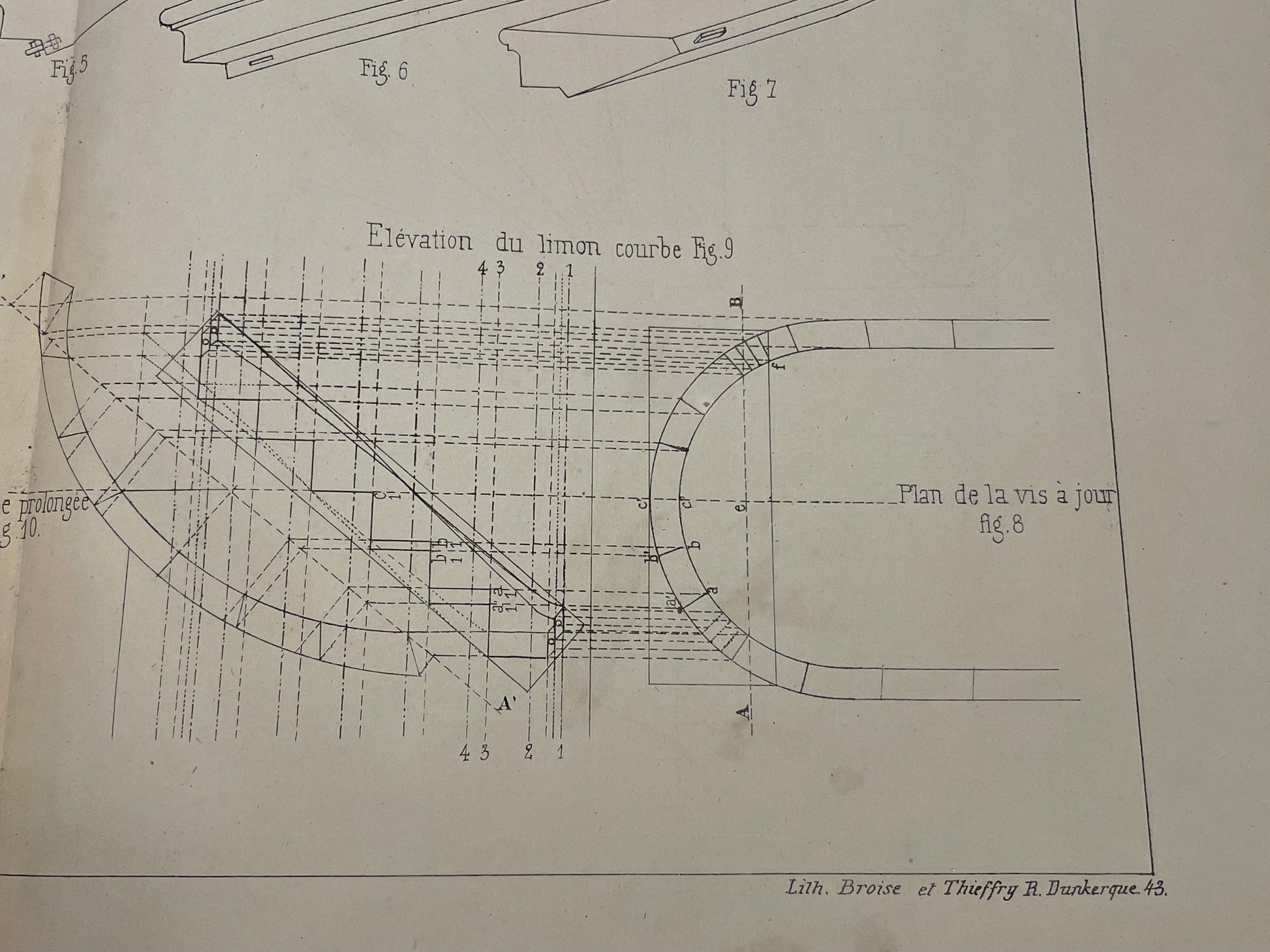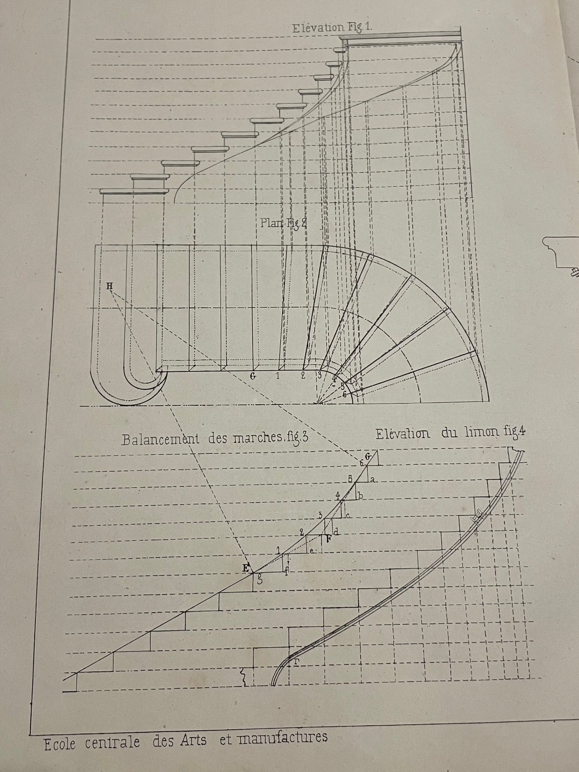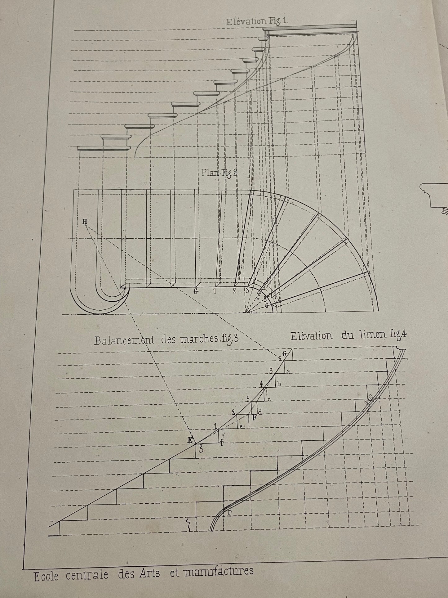 • Scale e sviluppo tecnico: La seconda tavola è dedicata all’ingegneria delle scale, un elemento architettonico essenziale per la progettazione di edifici complessi. Sono rappresentati dettagli di scale in legno (escaliers en bois), con analisi approfondite su bilanciamento dei gradini, sviluppo delle alzate e sezioni dei limons courbes (le strutture portanti curve). La tavola evidenzia il calcolo geometrico necessario per la realizzazione di scale eleganti e funzionali, un aspetto fondamentale della formazione tecnica del XIX secolo.
