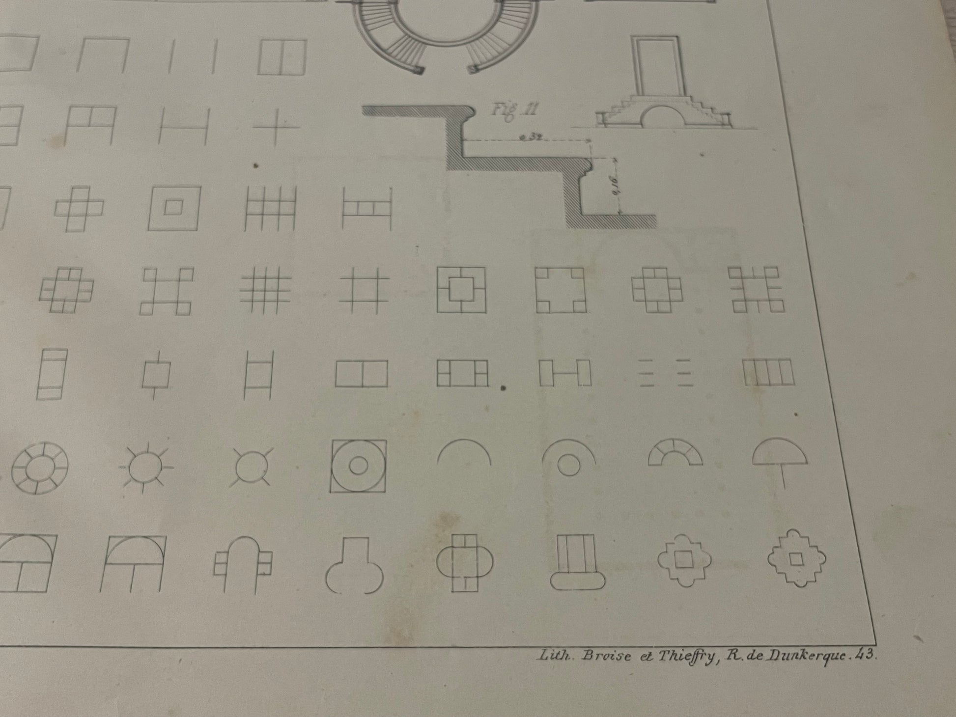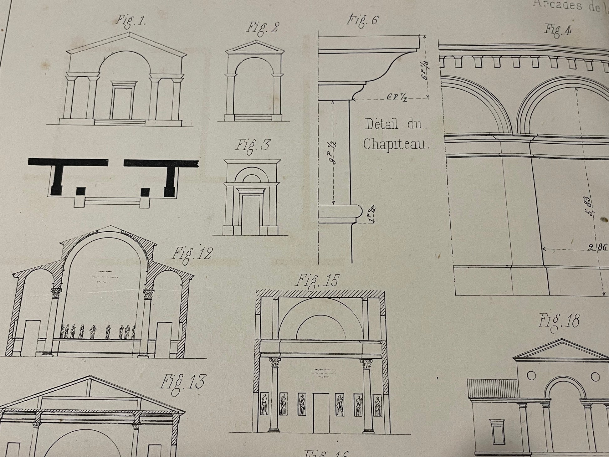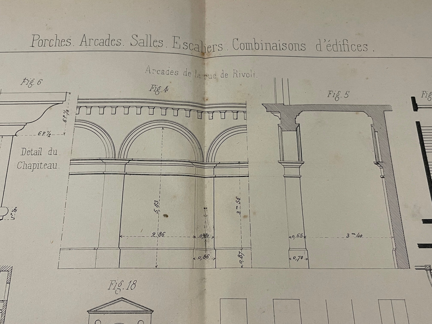 • Architettura e piante edilizie: La prima tavola presenta lo studio di differenti piante e combinazioni architettoniche, con particolare attenzione a elementi strutturali come arcate, portici e distribuzione degli spazi interni. Tra i riferimenti presenti, si notano rimandi ad architetture parigine, come le celebri arcades de la rue de Rivoli, un esempio iconico dell’urbanistica ottocentesca. Questa tavola documenta i principi compositivi alla base della progettazione di edifici pubblici e privati dell’epoca.