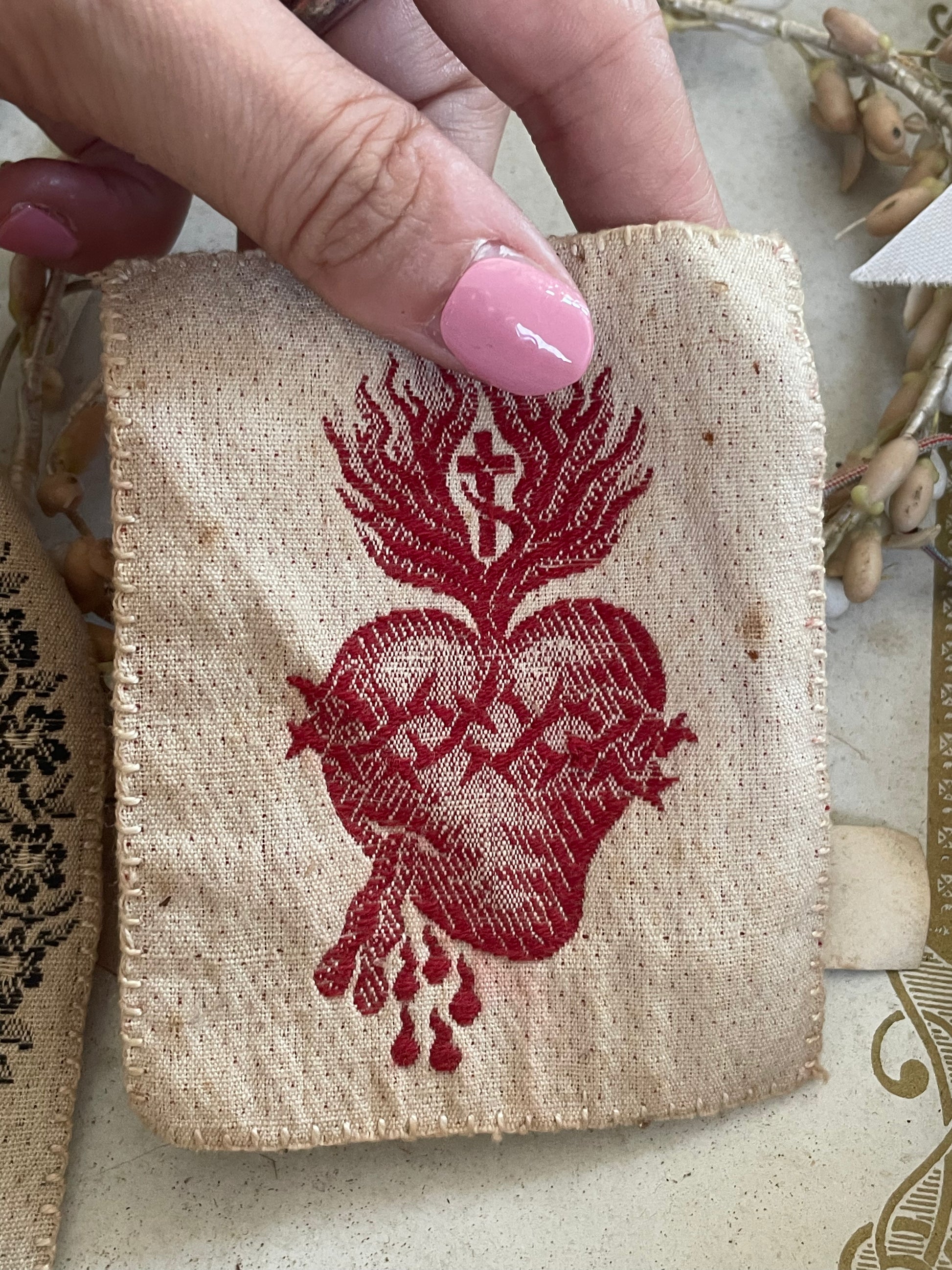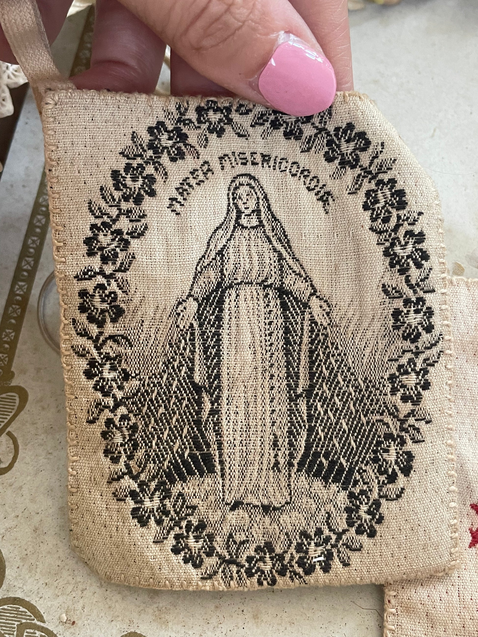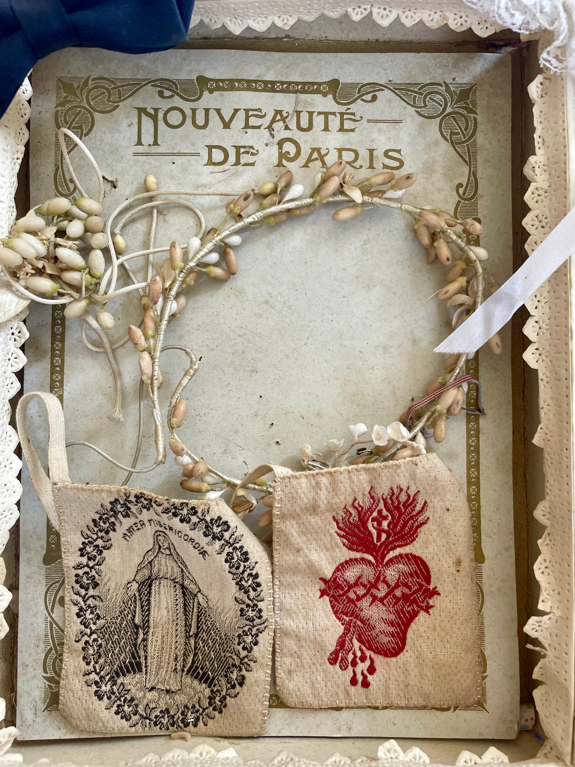 🙏 Due scapolari religiosi in tessuto stampato, con immagini votive: il Sacro Cuore e la Madonna “Mater Misericordiae”. Portati vicino al corpo o cuciti negli abiti per invocare protezione divina sull’unione.