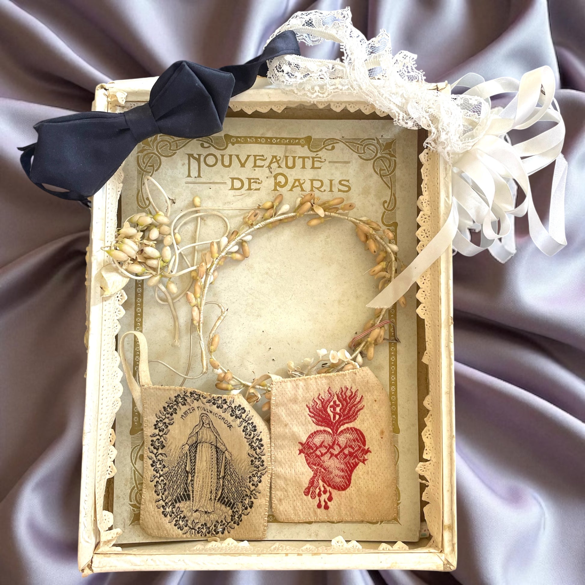 Ci sono scatole che non contengono oggetti. Contengono riti. Memorie. Promesse. Questa antica scatola francese, marcata “Nouveauté de Paris”, custodisce un piccolo corredo nuziale di inizio Novecento, intatto e struggente come una fotografia muta. Ogni elemento ha un’anima. Ogni dettaglio racconta.