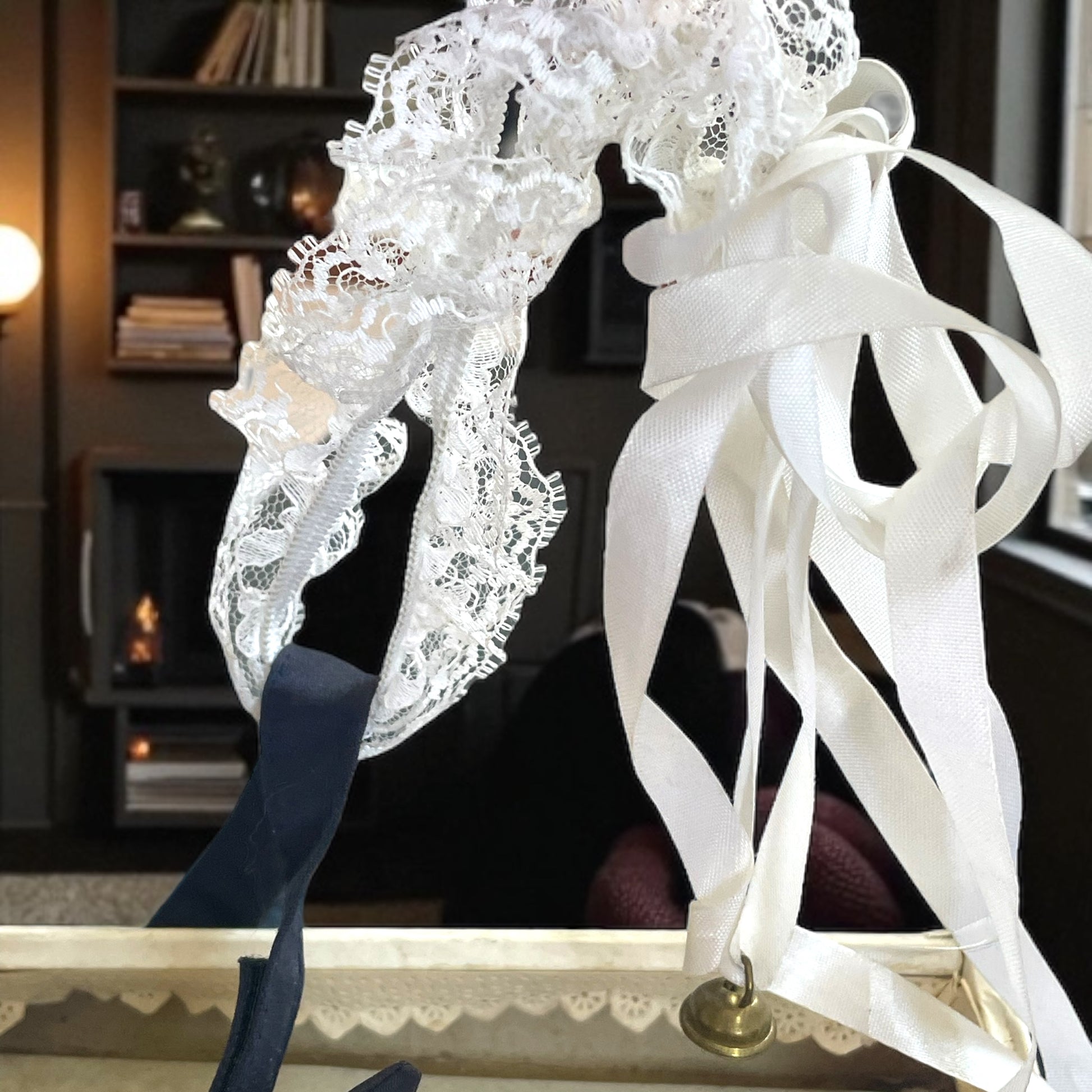 🕊️ Una giarrettiera in pizzo bianco, ornata di lunghi nastri e un piccolo campanellino d’ottone: il suo suono era di buon augurio, simbolo di fertilità e nuova vita. Si indossava sotto l’abito da sposa, nascosta ma mai dimenticata.