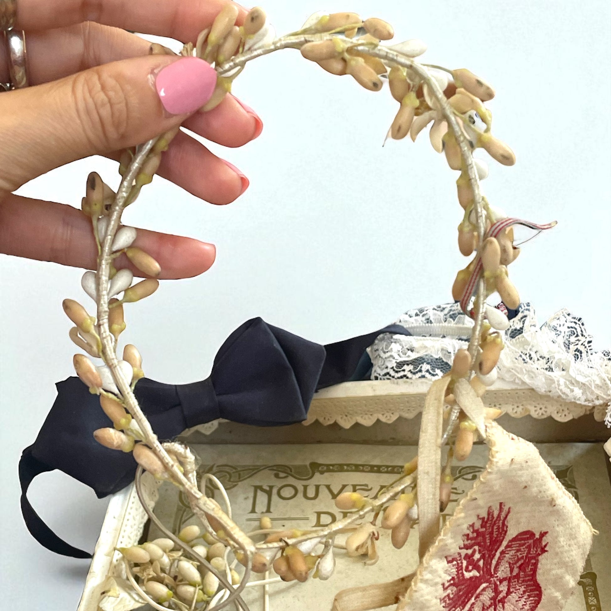 👰♀️ Una delicatissima corona di fiori d’arancio in cera, da indossare sul capo della sposa come simbolo di purezza e amore eterno. I fiori sono ancora avvolti dal loro filo di seta: fragili come quel “sì” appena sussurrato.