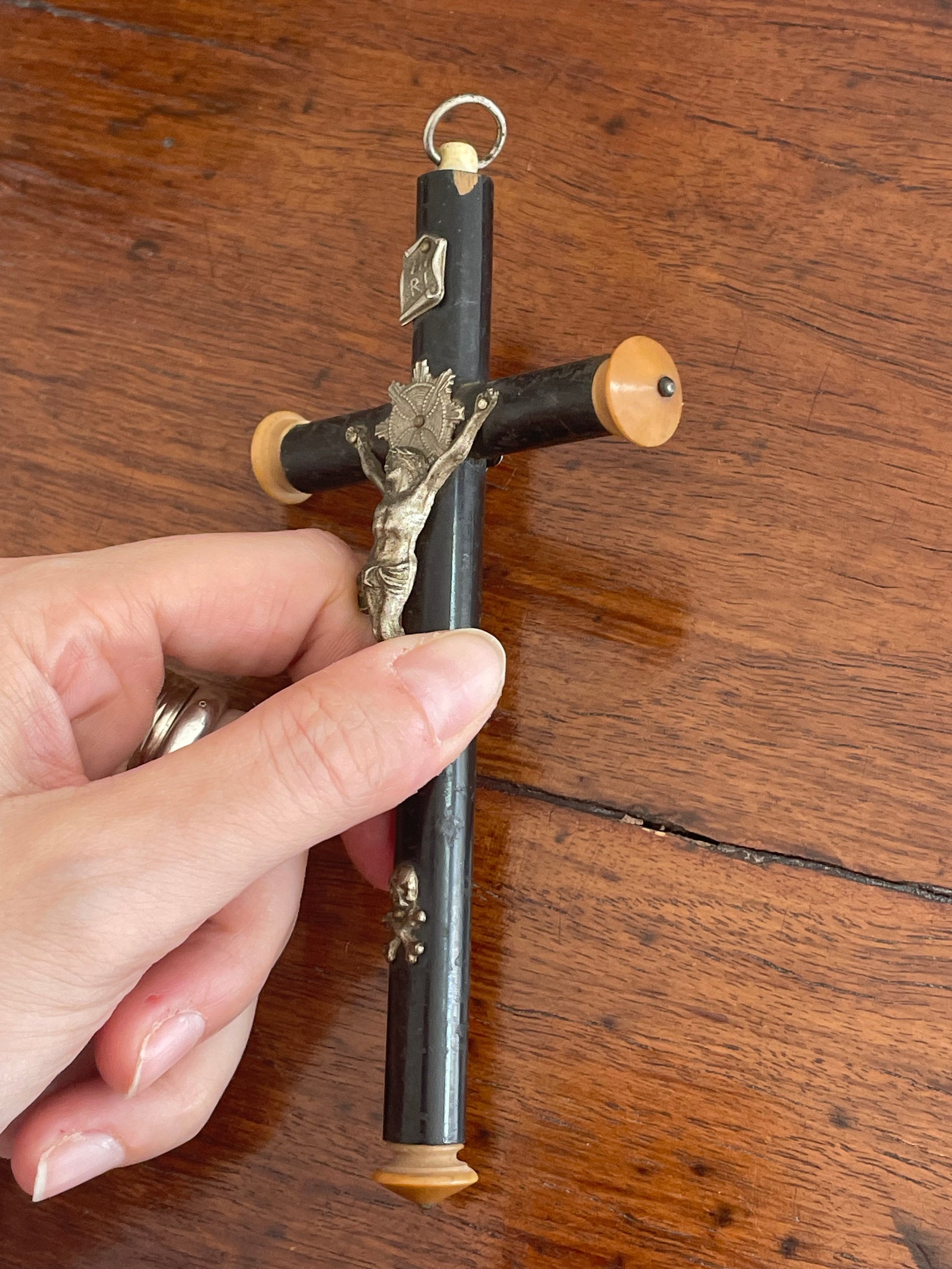 Era fatta per essere portata. Per scivolare tra le dita, scaldarsi al contatto della pelle, riposare sotto la stoffa di un abito scuro. Questa croce ha viaggiato, stretta nel pugno di chi, forse, trovava conforto nel suo peso discreto, nella solidità del legno ebanizzato, nell’argento consumato dal tempo. L’oro del sole raggiante intorno al capo del Cristo sembra ancora vibrare alla luce, un’eco lontana di quella speranza che illuminava le notti di chi la stringeva. Il piccolo teschio inciso sul fusto, muto ammonimento del tempo che fugge, è lì a ricordare la caducità della vita e la promessa di una rinascita. I suoi terminali in osso raccontano di una cura particolare, di un manufatto scelto con attenzione, non solo per la sua funzione, ma per il suo valore simbolico. La fede non è solo un sentimento: è un oggetto che si consuma tra le mani, un metallo che si ossida al respiro, un legno che si leviga sotto il tocco costante. Chi la stringeva trovava in essa una compagnia silenziosa, un piccolo frammento d’eternità nel palmo della mano. E oggi, dopo più di un secolo, questa croce porta con sé la memoria di quelle vite, delle parole sussurrate e delle speranze custodite nel segreto della devozione. Dimensioni: cm 14 x 8