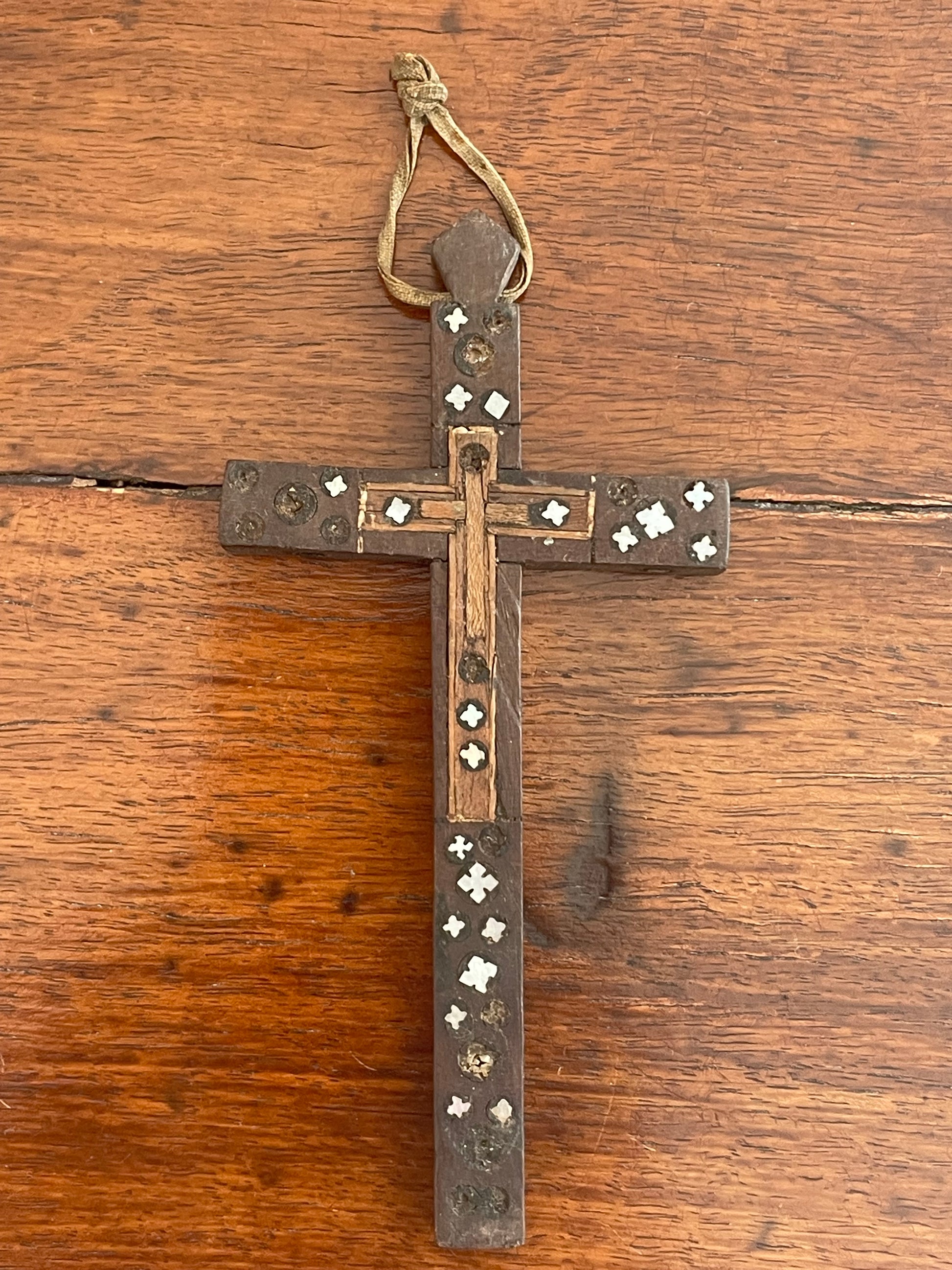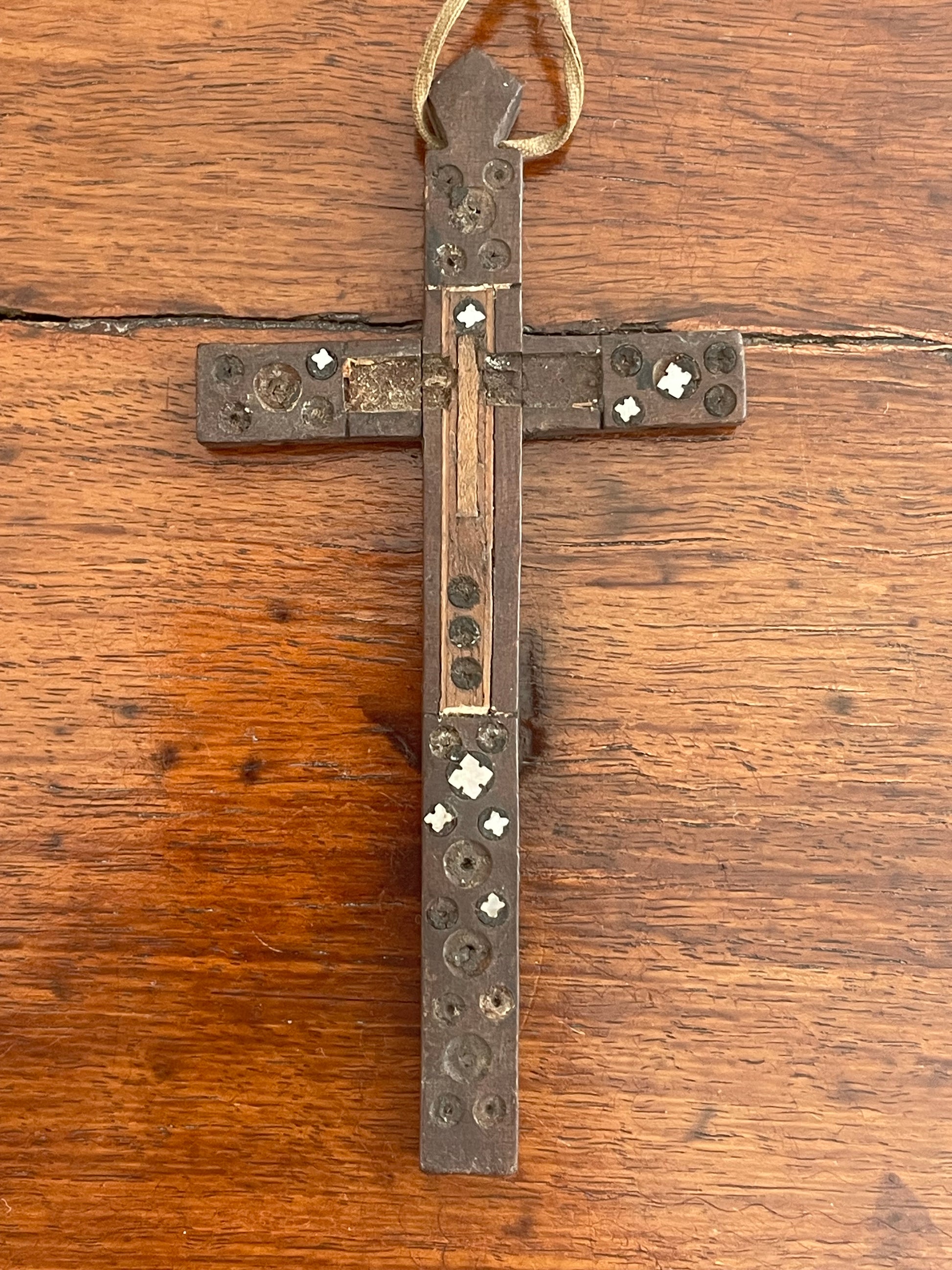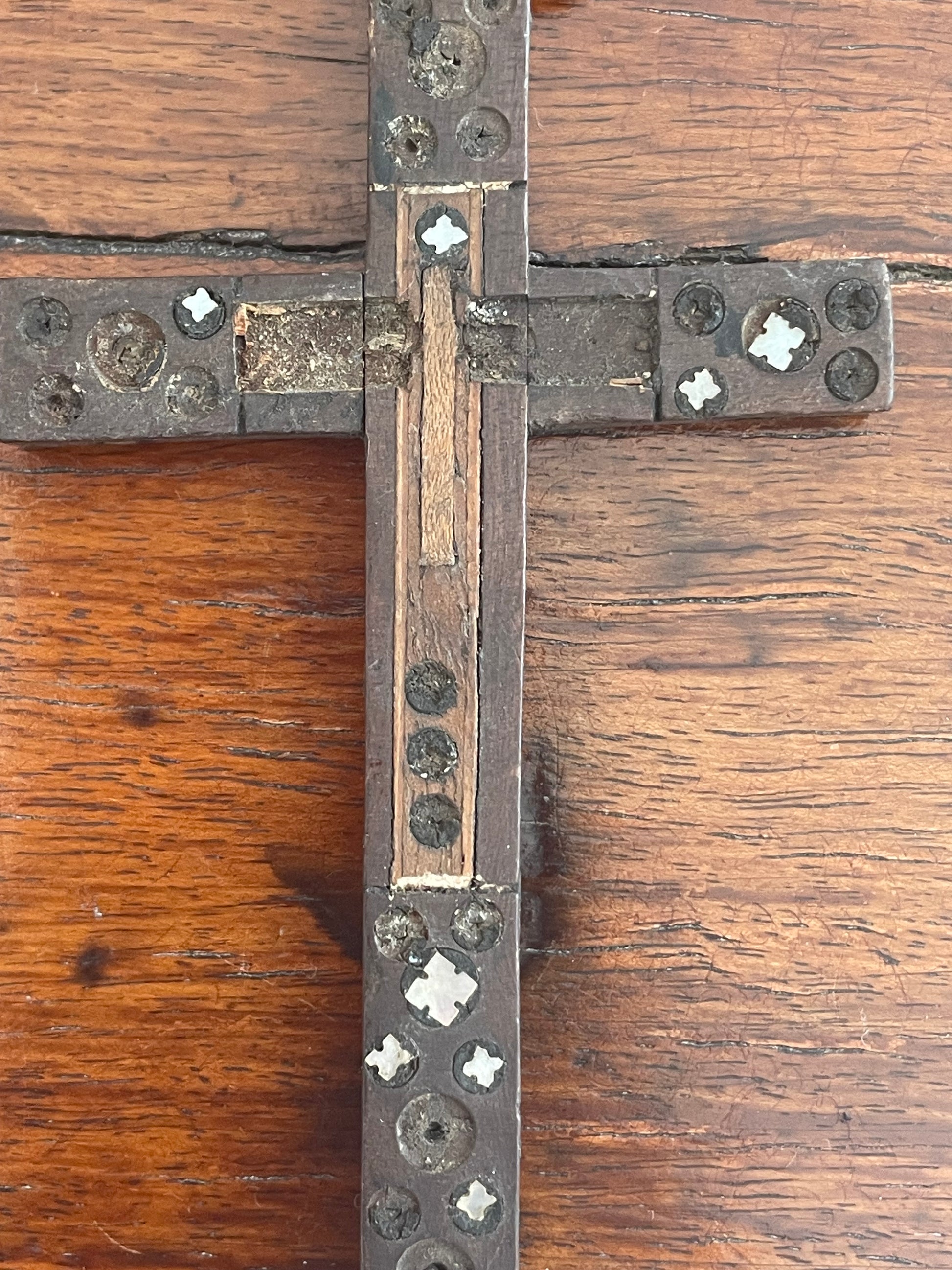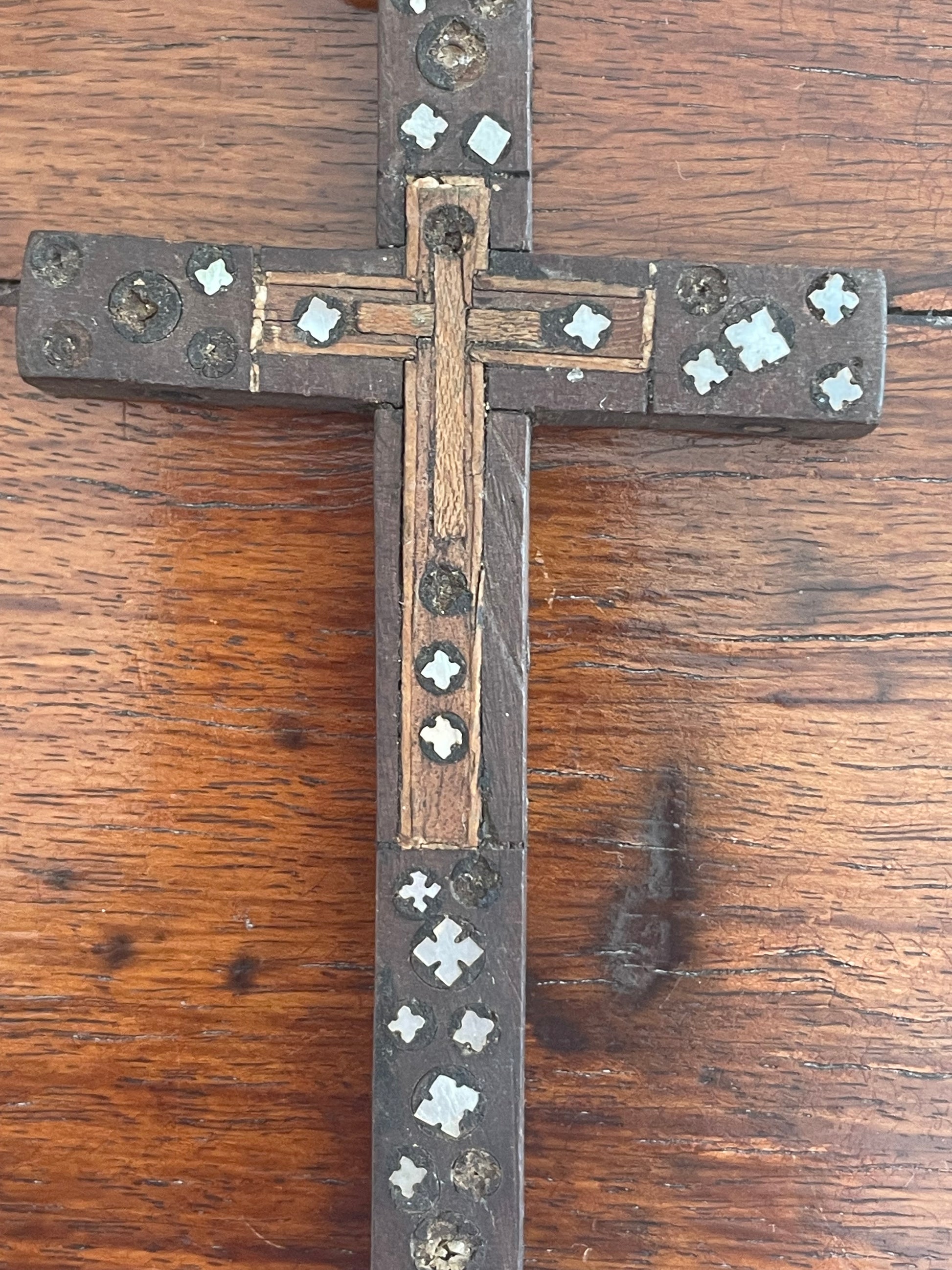 Questa raffinata croce pettorale, realizzata in legno scuro con intarsi in madreperla, appartiene alla tradizione artigianale delle croci prodotte a Gerusalemme e nella Terra Santa tra la fine del XVIII e il XIX secolo. Si tratta di un manufatto religioso destinato a pellegrini e membri del clero, indossato al petto come simbolo di devozione e legame spirituale con i luoghi sacri del Cristianesimo. Il legno scuro, lavorato con intarsi geometrici e floreali in madreperla, è una caratteristica distintiva delle croci devozionali realizzate nei laboratori della Galilea e di Betlemme. L’inserto centrale, costituito da una seconda croce in legno più chiaro, potrebbe essere legno d’ulivo, simbolo di pace e sacrificio, oltre che essenza tipica della vegetazione della Terra Santa. Gli inserti in madreperla, ormai in parte mancanti per l’usura del tempo, erano frequentemente utilizzati per impreziosire oggetti religiosi destinati ai pellegrini, conferendo luminosità e richiamando la purezza e la luce divina. Le croci come questa erano realizzate dai maestri artigiani cristiani della Palestina e vendute ai fedeli che visitavano i Luoghi Santi. Portarla al petto significava tenere viva la memoria del pellegrinaggio e del contatto con le radici della fede cristiana. Spesso, queste croci venivano benedette prima di essere donate a monaci, preti o laici devoti, e potevano contenere reliquie o elementi sacri al loro interno. Un manufatto affascinante e ricco di storia, espressione della fede e del viaggio interiore di chi lo ha custodito con devozione. Le dimensioni: cm 12,5 x 6.