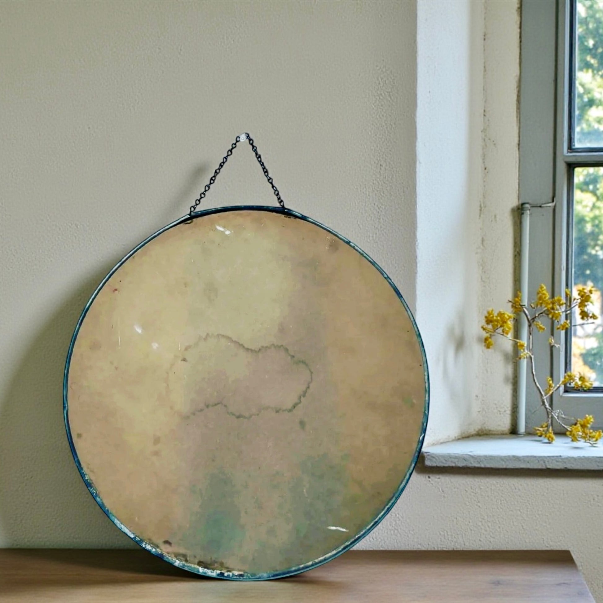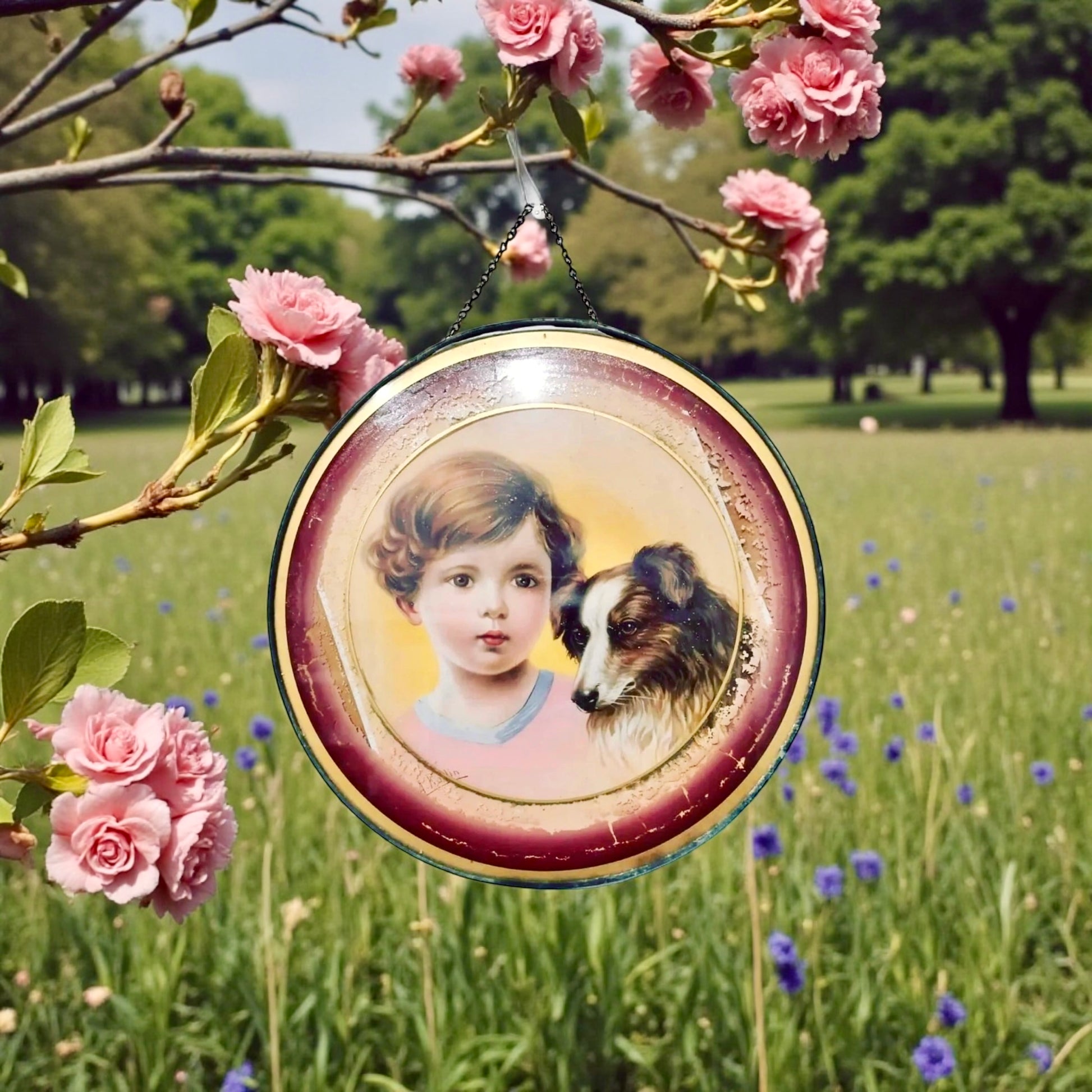 Non tutto ciò che viene dal passato voleva essere “importante”. Alcune cose volevano solo essere amate. Questa stampa d’epoca raffigura un bambino e il suo cane: due presenze vicine, silenziose, unite da una fiducia assoluta. Lo sguardo è fermo, la mano invisibile ma percepibile. La protezione non è dichiarata, è semplicemente lì. La stampa, incorniciata sottovetro, presenta ritocchi manuali di colore, una pratica diffusa per rendere più calda e viva l’immagine. Oggi piccoli frammenti di pittura e carta punteggiano i bordi dell’interno della cornice: il tempo che passa e non sempre è clemente. La cornice e la catena sono originali, con una patina che racconta anni di pareti domestiche, camere da letto, corridoi di case vissute. Non è un oggetto raro: ma è un oggetto gentile, tenero, che commuove.
