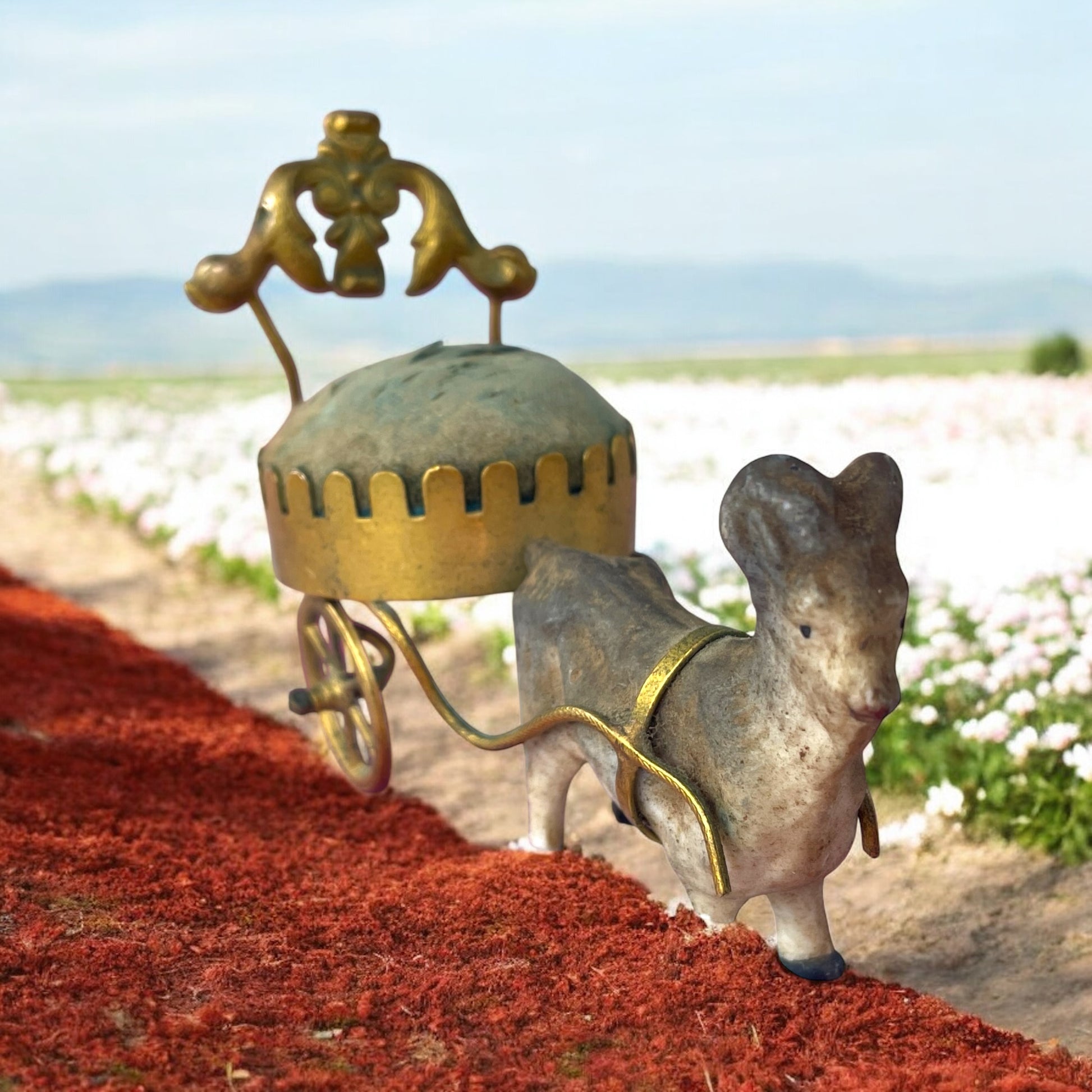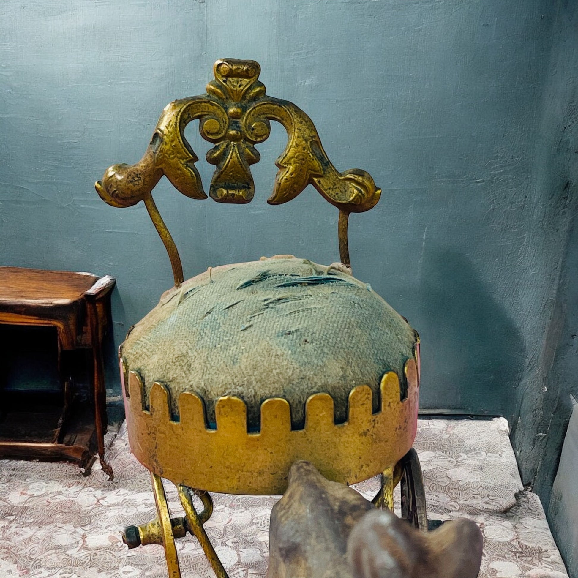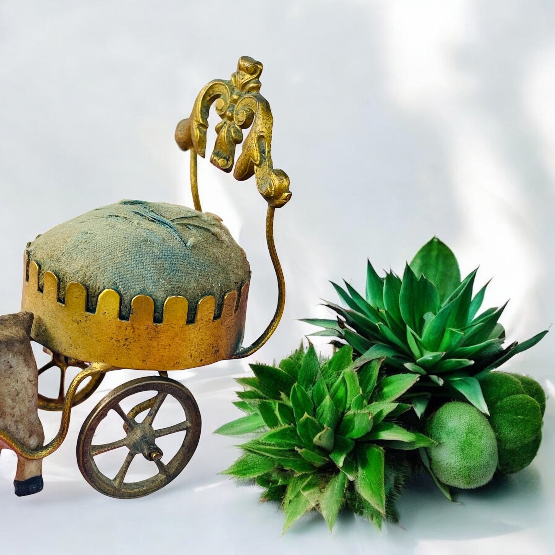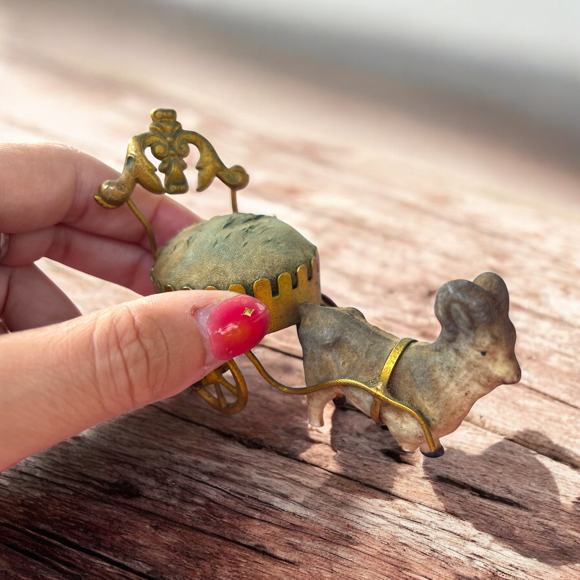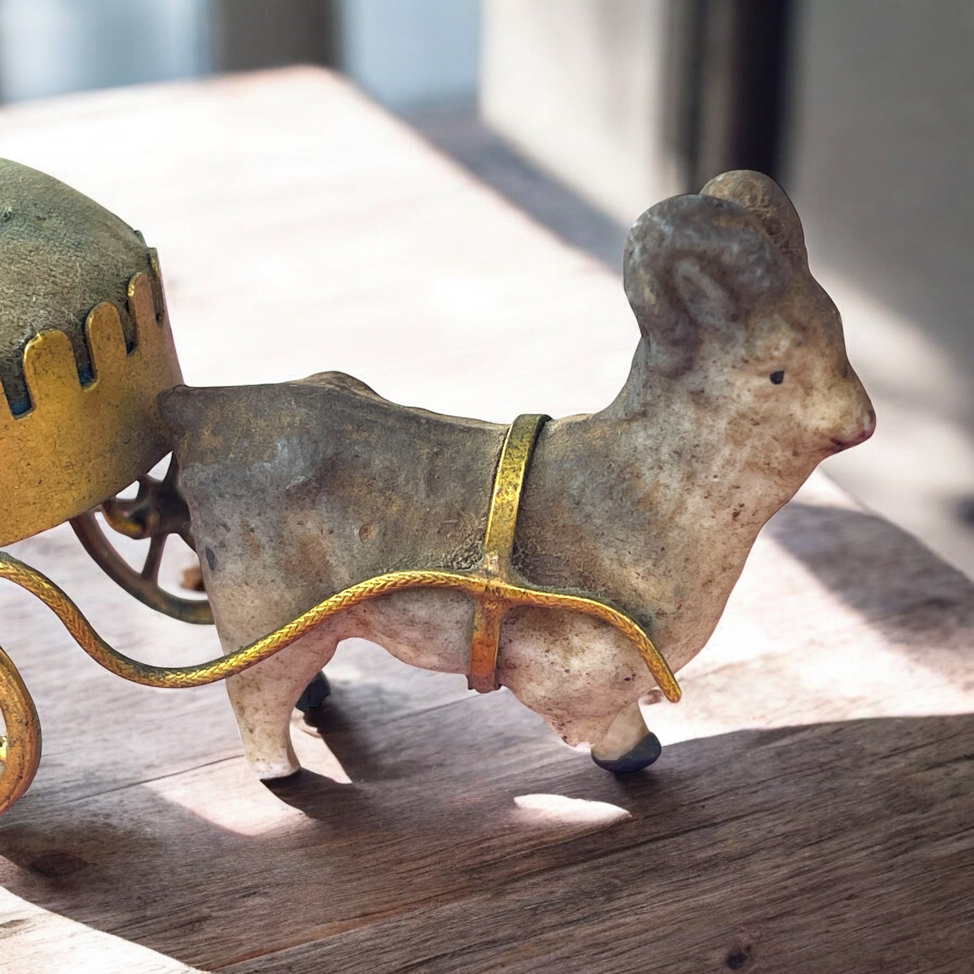A volte, tra le mani capita un oggetto che sembra uscito da una fiaba. Non perché sia prezioso nel senso comune, ma perché ha qualcosa di profondamente insolito, magico, disarmante. Questo minuscolo montone, con le sue corna ricurve e l’andatura gentile, non porta un carro qualunque: trascina con sé un piccolo trono d’ottone, sormontato da un cuscino di stoffa consunta, un tempo destinato ad accogliere spilli come fossero gioielli. E allora ti chiedi: chi avrà mai pensato di realizzare un puntaspilli così? Quanta fantasia, quanta delicatezza, quanta voglia di bellezza serviva per inventare un oggetto del genere? Non nasce per necessità, ma per il puro piacere di creare qualcosa di speciale. È questo che lo rende diverso. Non somiglia a nulla di comune, e per questo non si può spiegare con categorie ordinarie. Sì, ha due zampette rotte. Ma come ogni creatura delle favole, anche lui ha le sue cicatrici, che lo rendono ancora più vero. Un oggetto per chi sa ancora vedere la meraviglia nelle piccole cose… per chi colleziona fiabe, non solo oggetti.