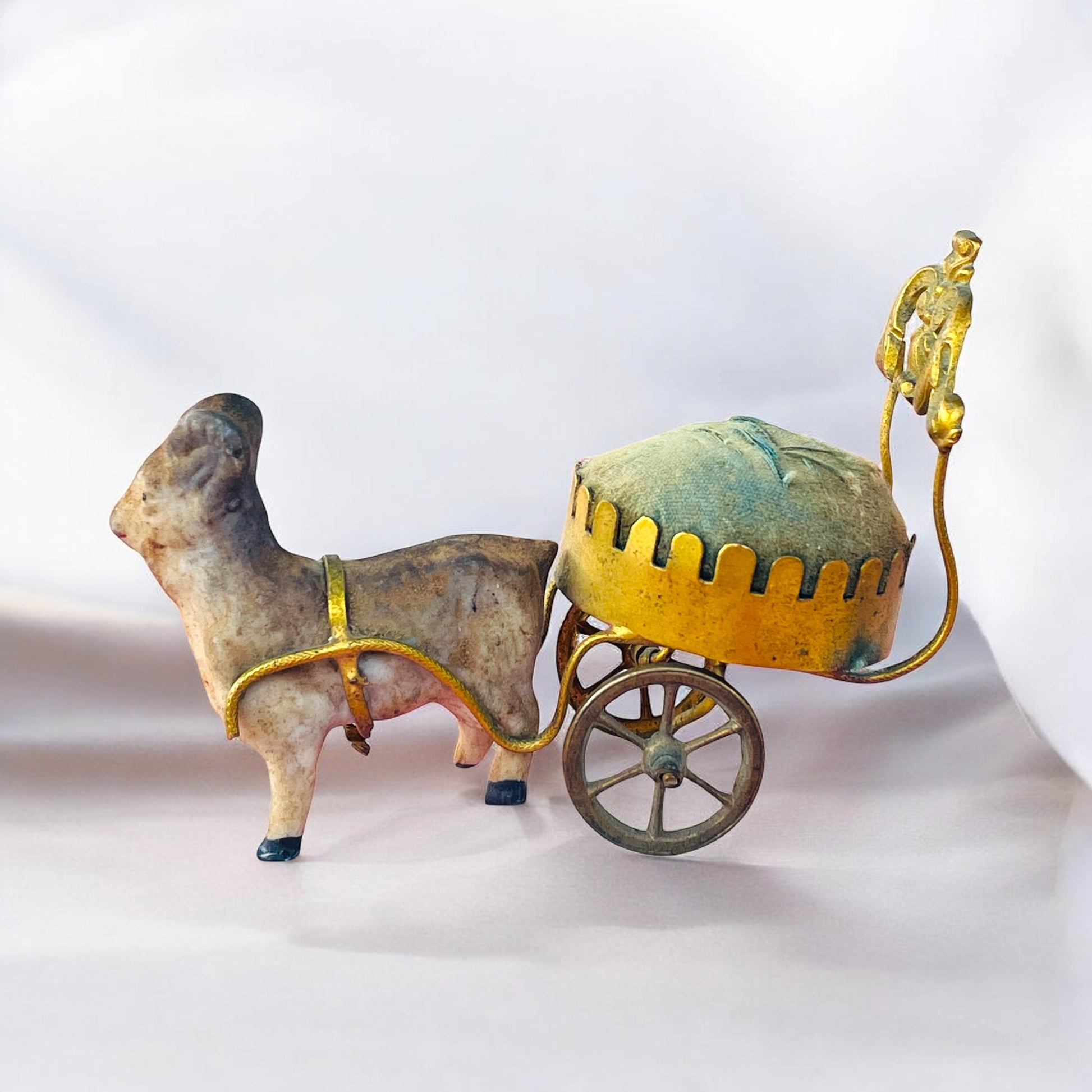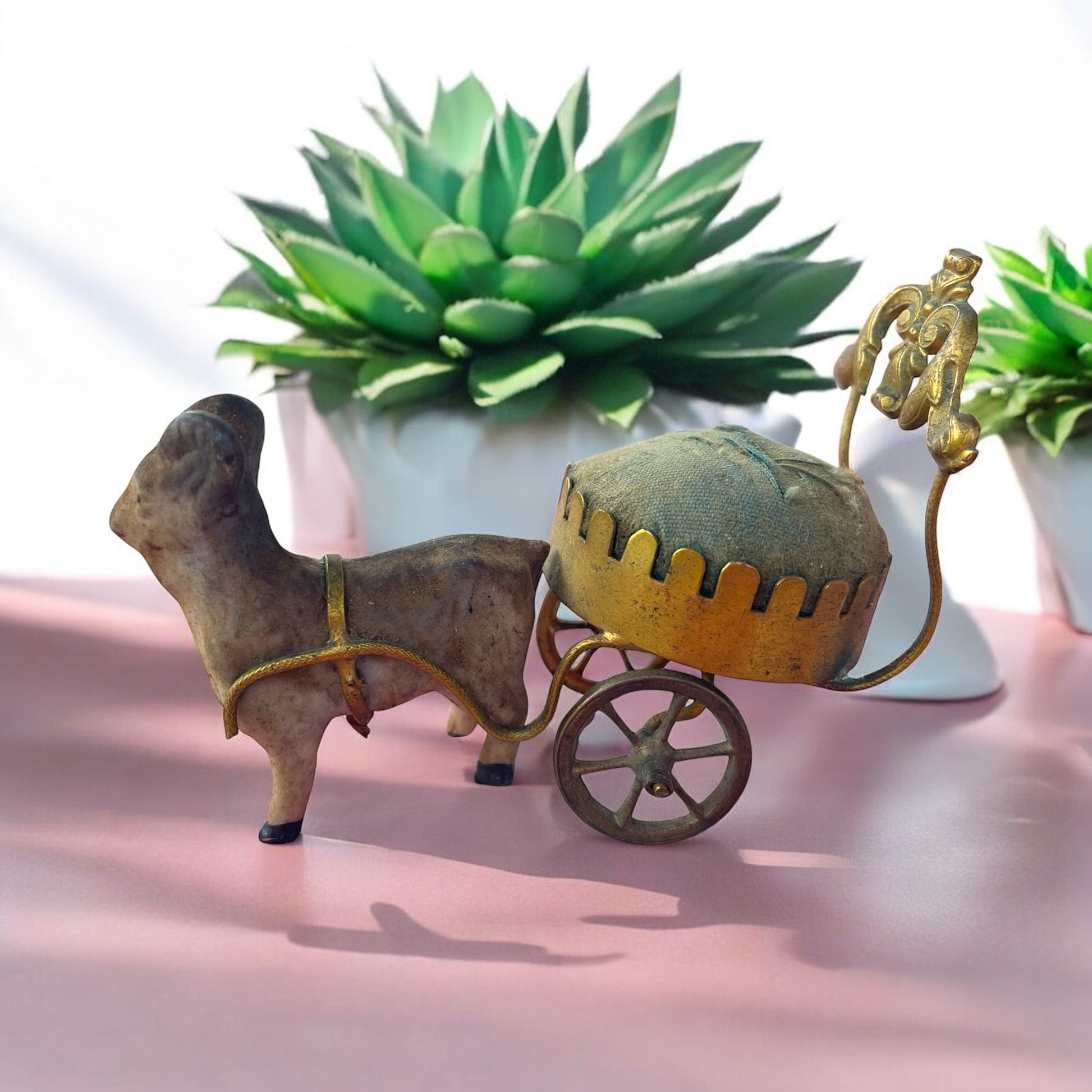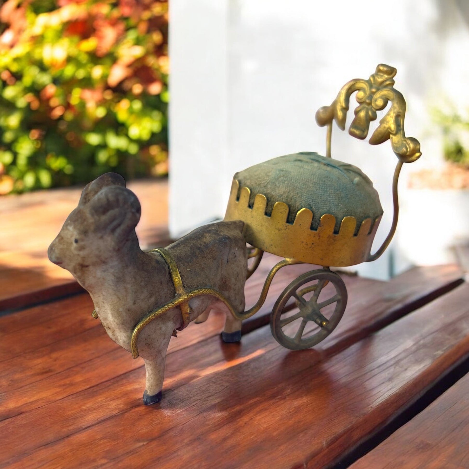 Delizioso punta spilli fine ‘800 da collezione, montone in biscuit con carretto e trono