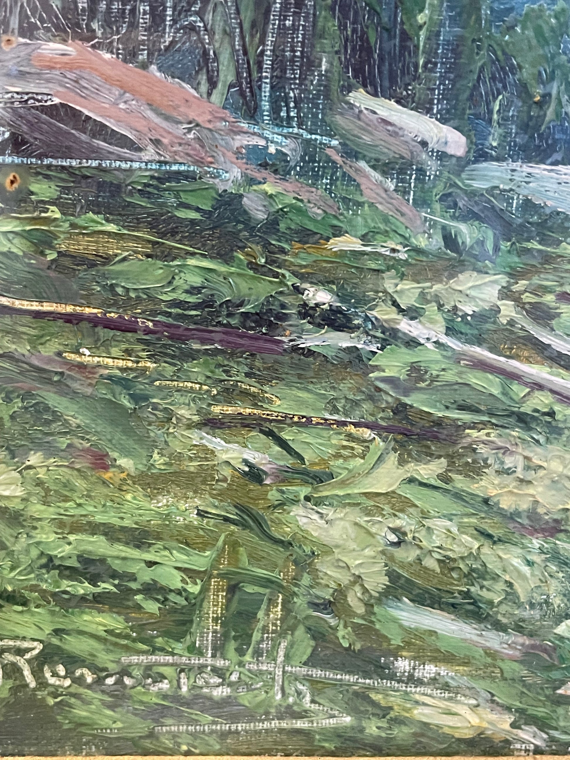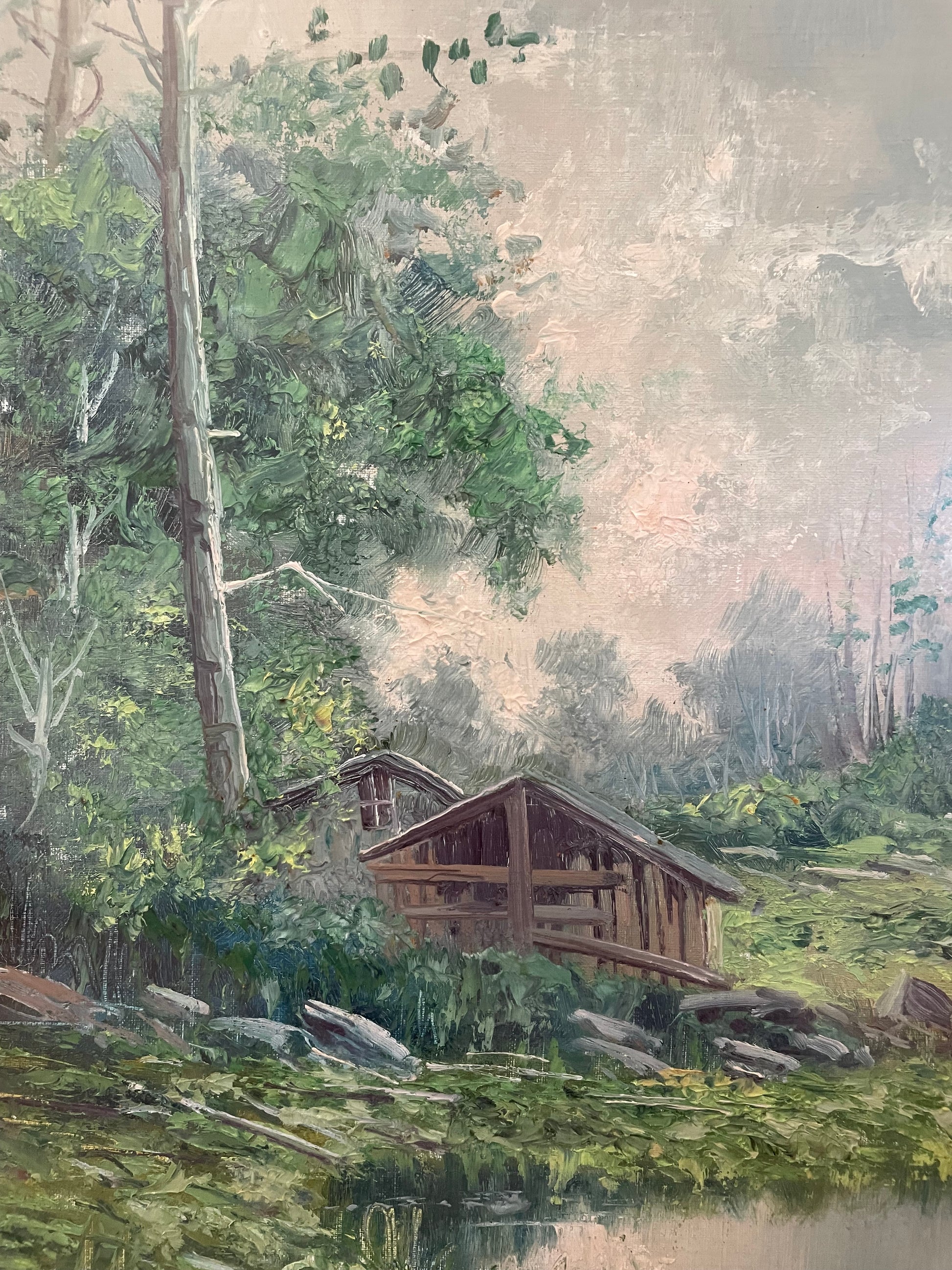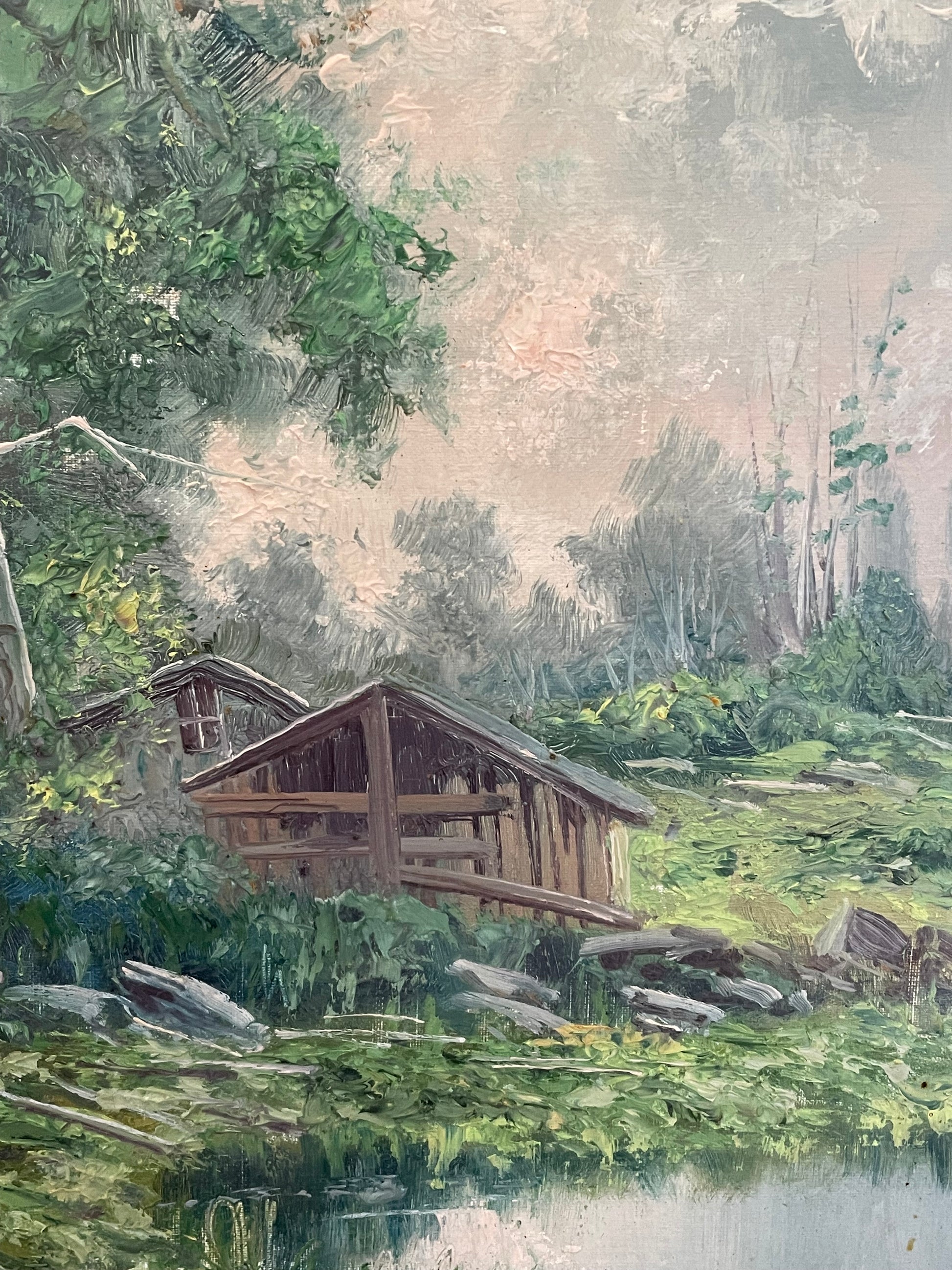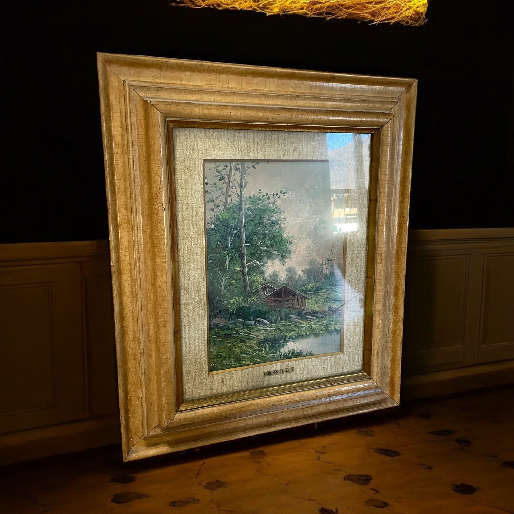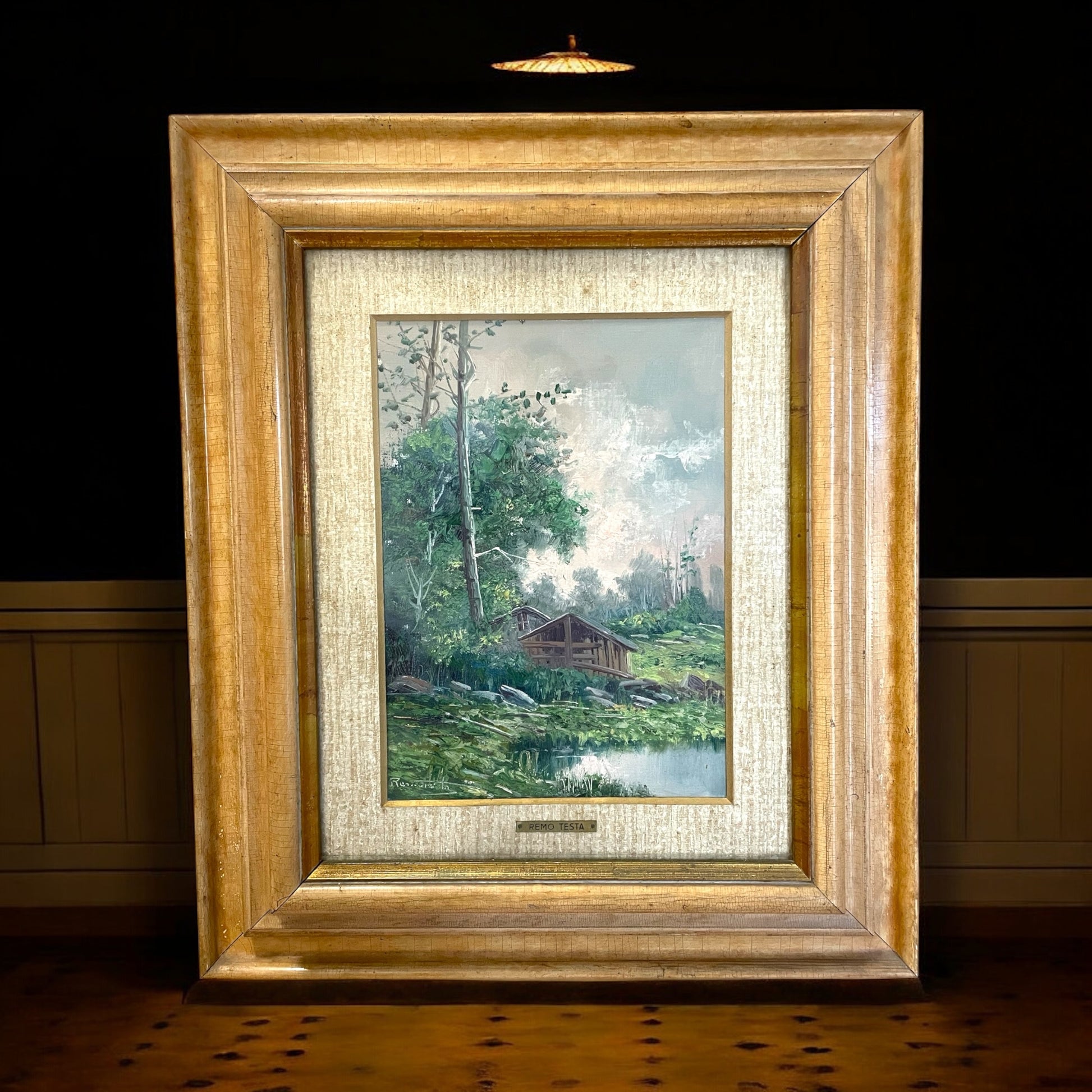 Remo Testa è un pittore del XX secolo, noto soprattutto per le sue marine, che gli hanno conferito notorietà. Le sue creazioni, apprezzate per il realismo e l’equilibrio compositivo, sono state battute all’asta con una media di 35 opere vendute, mostrando un certo interesse per la sua produzione, pur rimanendo un nome minore. Oggi vi propongo questa sua opera facente parte della mia collezione di famiglia. La cornice, risalente agli anni ’60-’70, è in eccellenti condizioni. Realizzata con un profilo robusto e una finitura dorata calda, conferisce eleganza al dipinto, valorizzandolo senza sovrastarne l’essenza. Il dipinto è una veduta rurale incastonata nel cuore delle Prealpi lombarde (le mie zone!) ed evoca un’atmosfera di serenità e raccoglimento. La scena, dominata da un piccolo edificio rustico circondato da una vegetazione rigogliosa, invita l’osservatore a perdersi in un mondo senza tempo, dove il ritmo della natura regna sovrano. I dettagli del fienile, con il suo tetto spiovente e le linee essenziali, richiamano le costruzioni tipiche delle valli montane, immerse in un paesaggio di pace e silenzio. La vegetazione si arrampica rigogliosa, alternando verdi profondi e sfumature più delicate, mentre lo specchio d’acqua riflette la quiete circostante, amplificando il senso di calma. Il cielo, con la sua morbida foschia, si dissolve all’orizzonte, suggerendo la presenza di montagne lontane e un clima mite, tipico delle zone prealpine. Guardando quest’opera, sembra quasi di percepire il fruscio delle foglie, il canto degli uccelli e l’odore dell’erba bagnata. È un dipinto che cattura non solo lo sguardo, ma anche i sensi, trasportandoci in una dimensione dove il tempo rallenta e tutto si riconnette alla natura. Contemplarlo serve a tornare solo osservatori e non manipolatori della natura. Le dimensioni totali: cm 65 x 55. Solo tela: 45 x 35.
