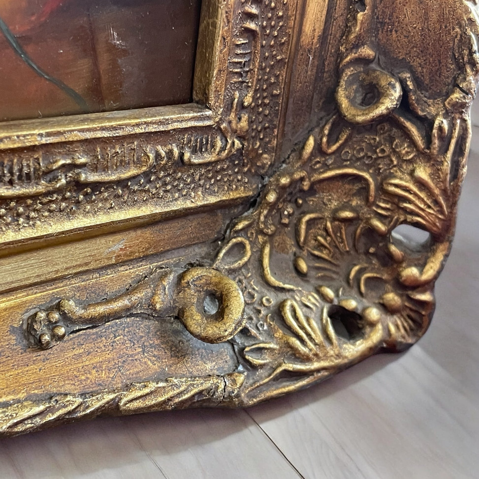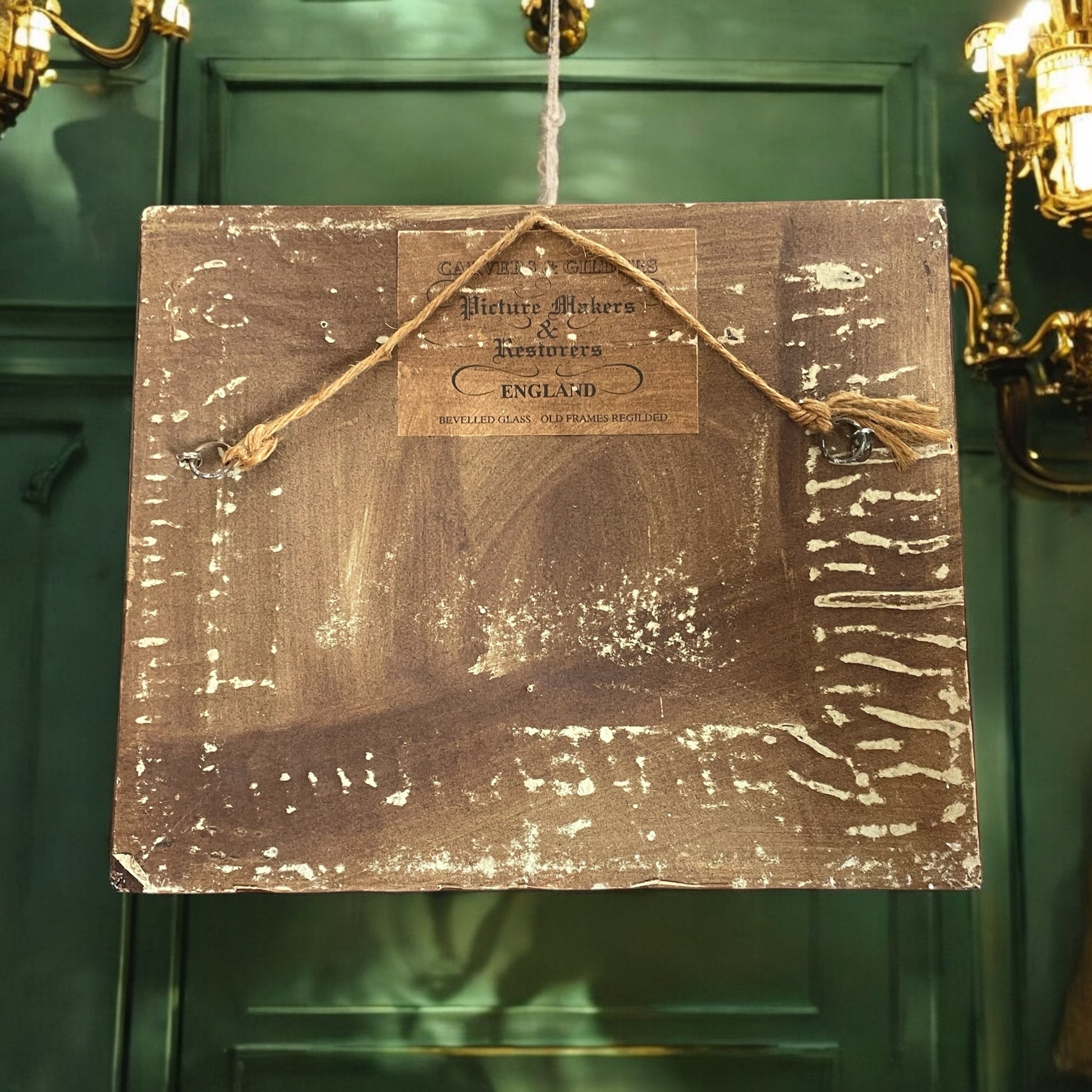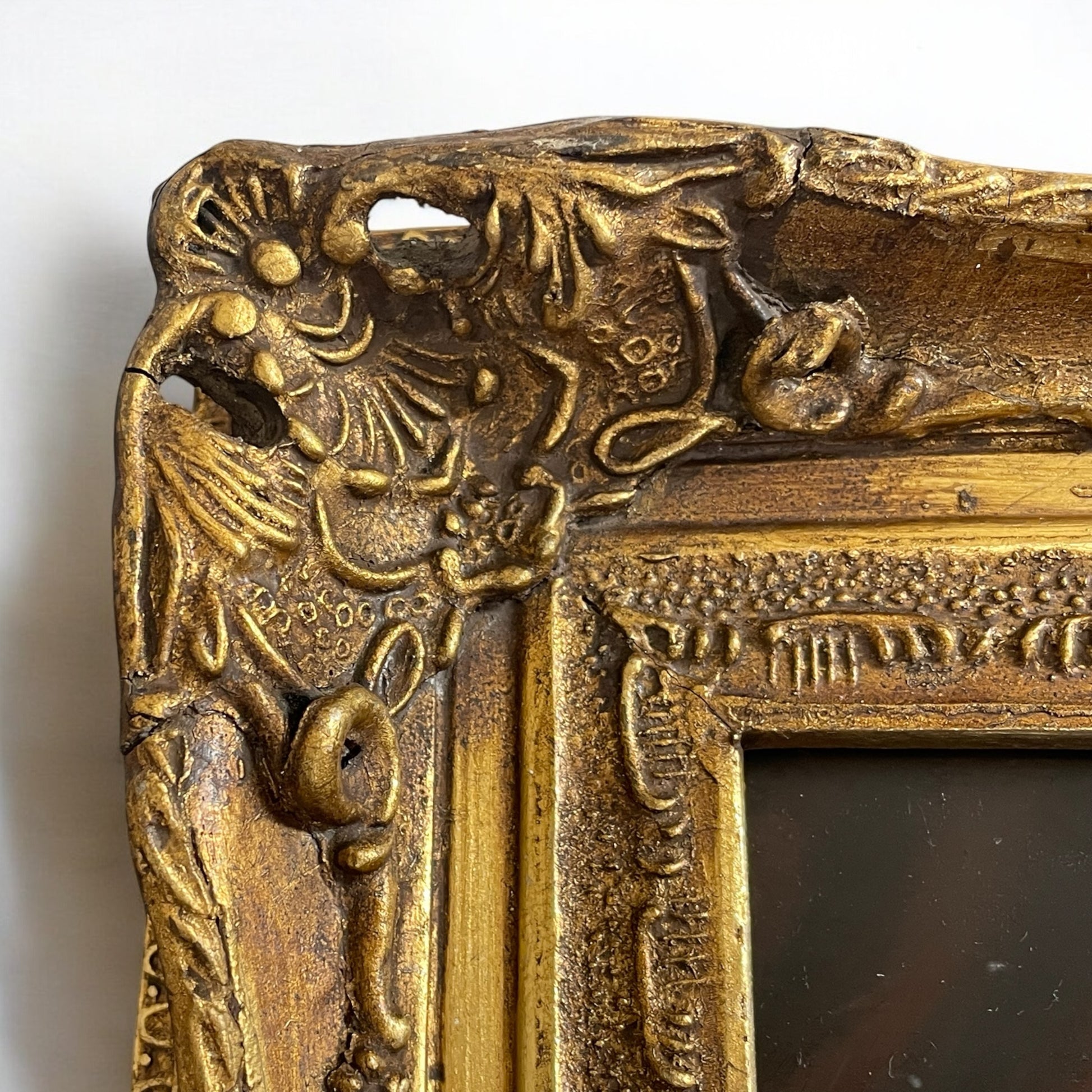 Un dipinto a olio realizzato in Inghilterra negli anni ’40, con una resa sorprendentemente realistica e affettuosa: ogni pelo, ogni piega del cuscino, ogni ombra racconta una storia. I gattini, ritratti con sguardo vivo e pose naturali, sembrano emergere dalla tavola per accompagnare lo spettatore in una scena intima e senza tempo. La cornice, coeva, è in legno e gesso dorato, lavorata con motivi a riccioli, volute fogliate e piccoli boccioli in rilievo, nello stile rococò revival. Leggere crepe nello stucco raccontano la sua storia senza comprometterne la bellezza, anzi, aggiungendo un fascino autentico. Un’opera pensata per chi ama l’arte che racconta e che accarezza il cuore, come un micio che si infila accanto a te sul divano e ti guarda, in silenzio.