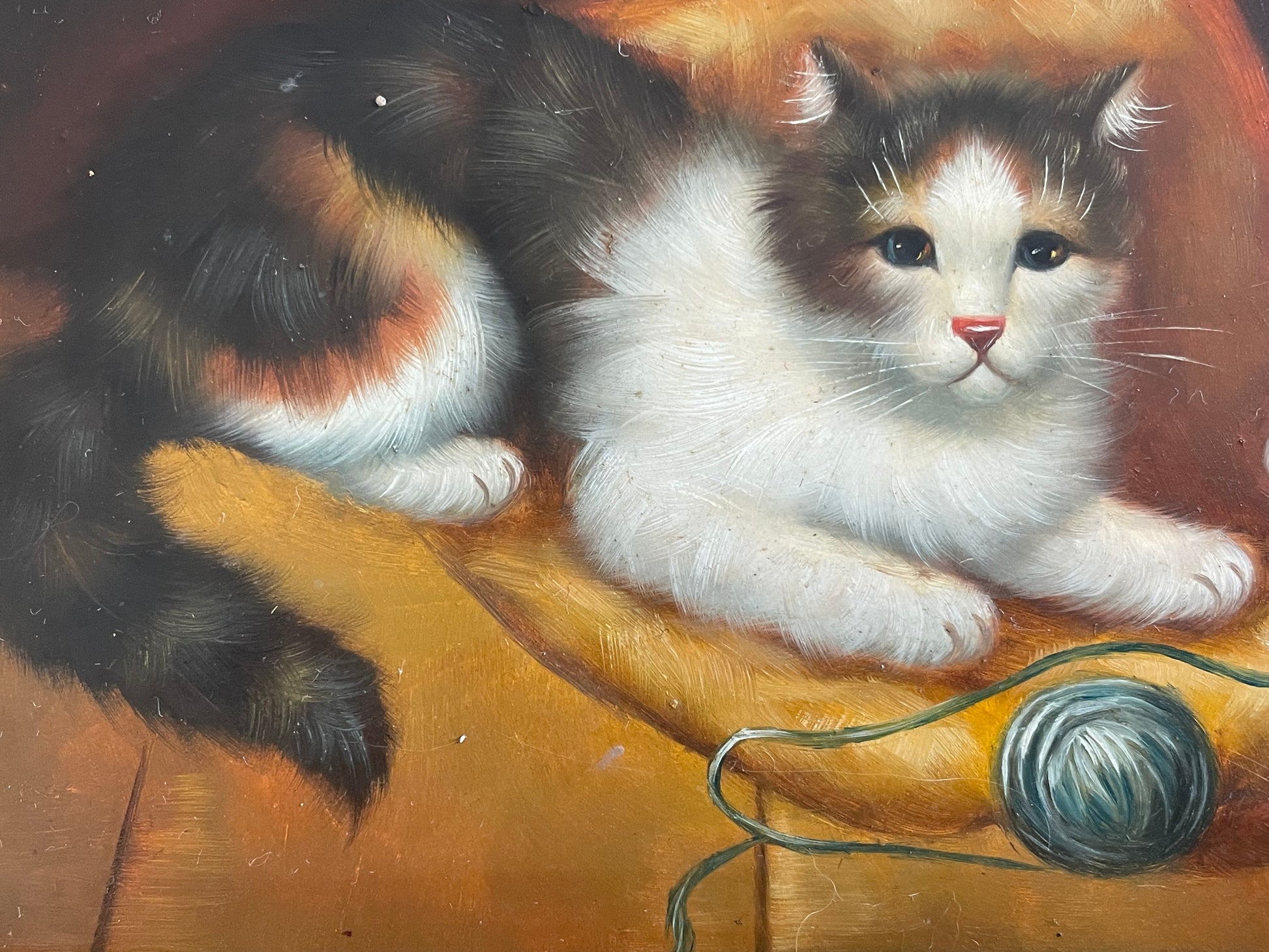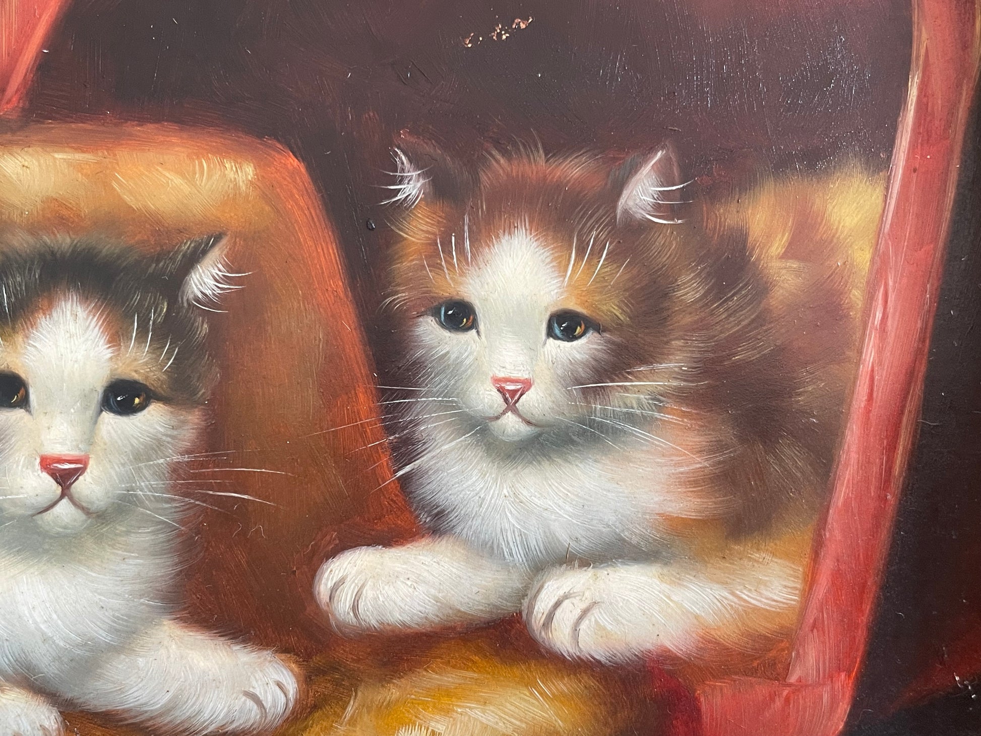 Dipinto inglese con gattini olio su tavoletta, anni ‘40 cornice coeva