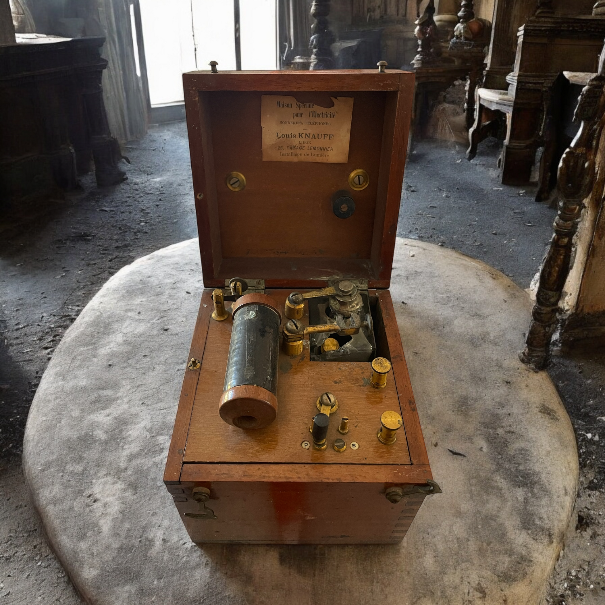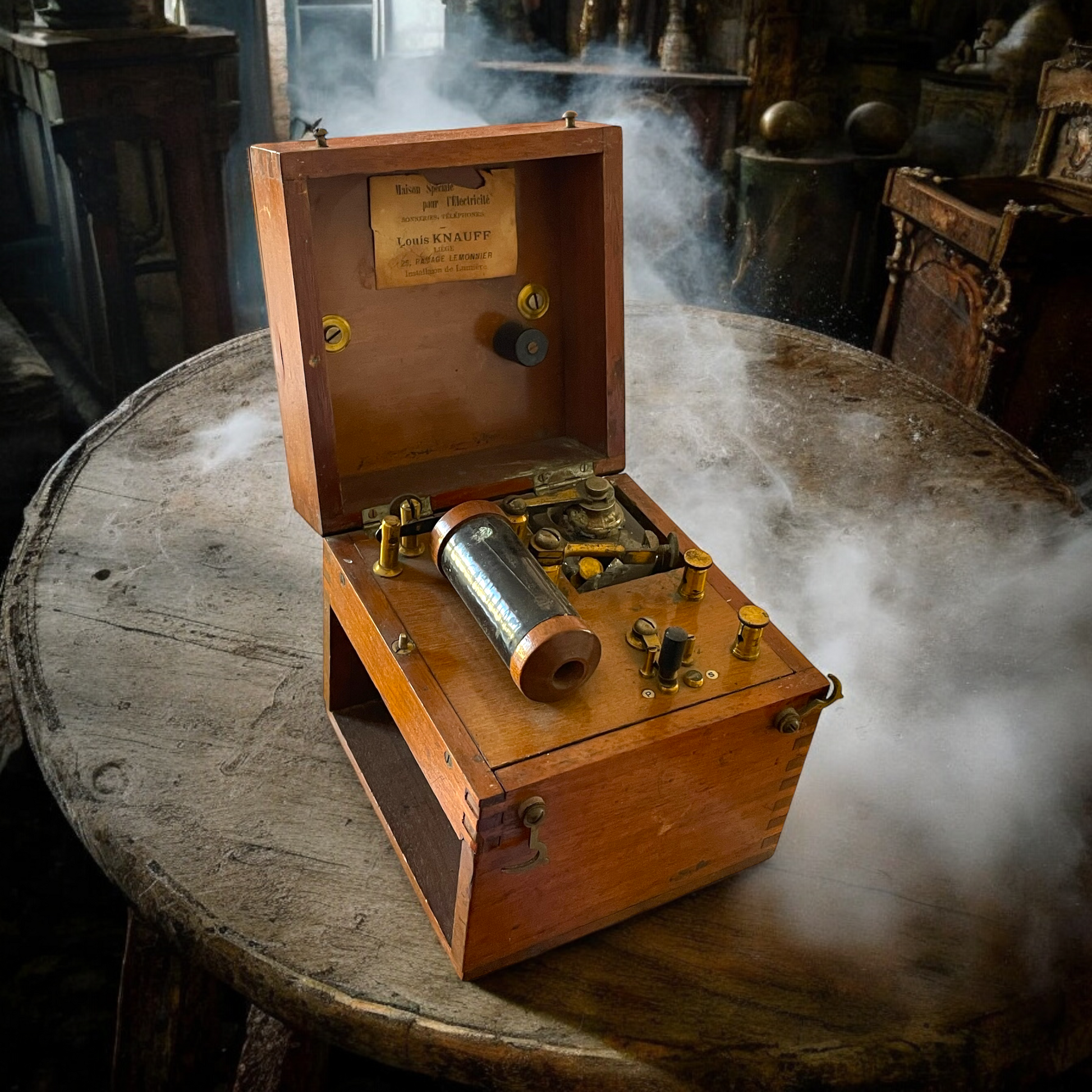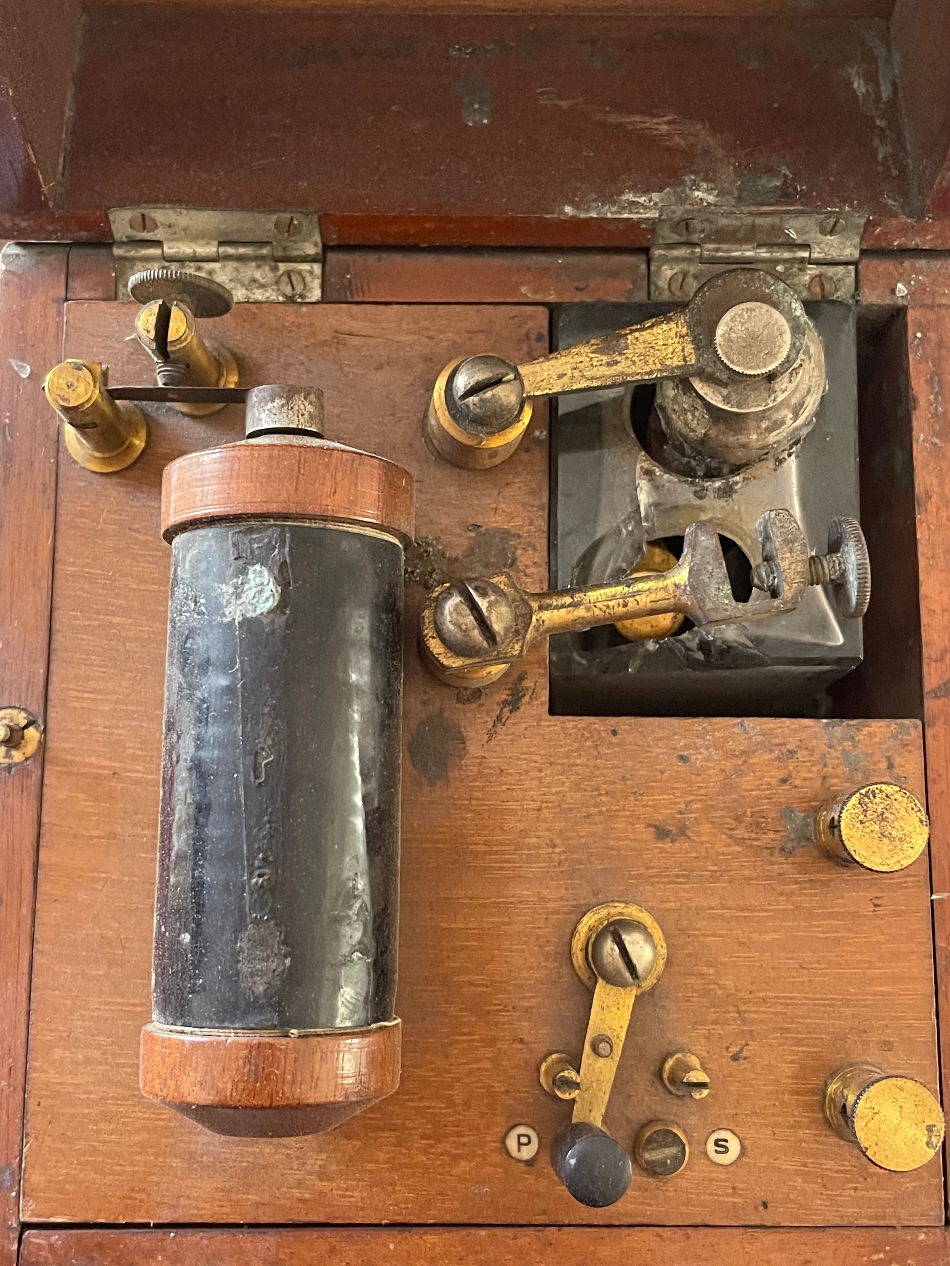 proprio come se fossimo in ritorno ad Oz… ecco l’antico ed inquietante macchinario per l’elettroterapia portatile. Dove si vede il vano c’era un cassettino oggi mancante con all’interno gli elettrodi; l’interno invece è stupendamente conservato, elaborato, affascinante. Bellissima la patina del legno, gli incastri, la maniglia, i gancetti. Conserva ancora l’antica etichetta d’origine, aprirlo significa proprio non essere più nel Kansas….