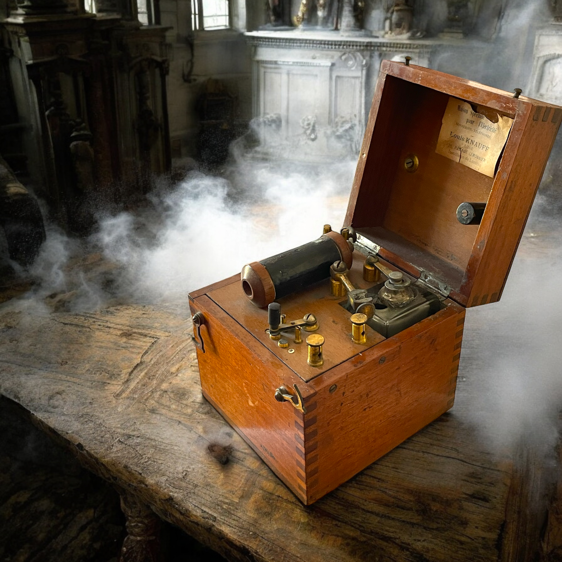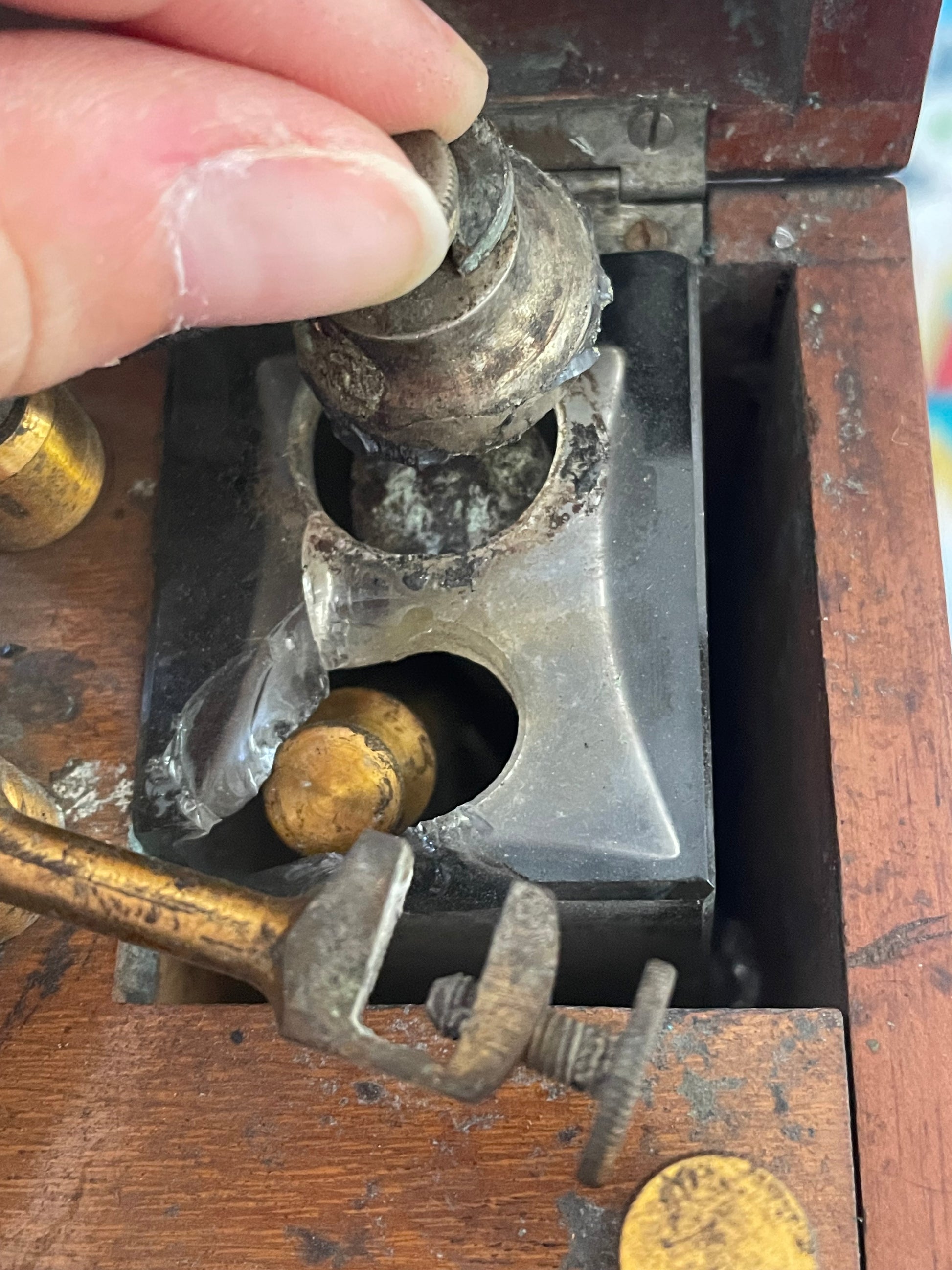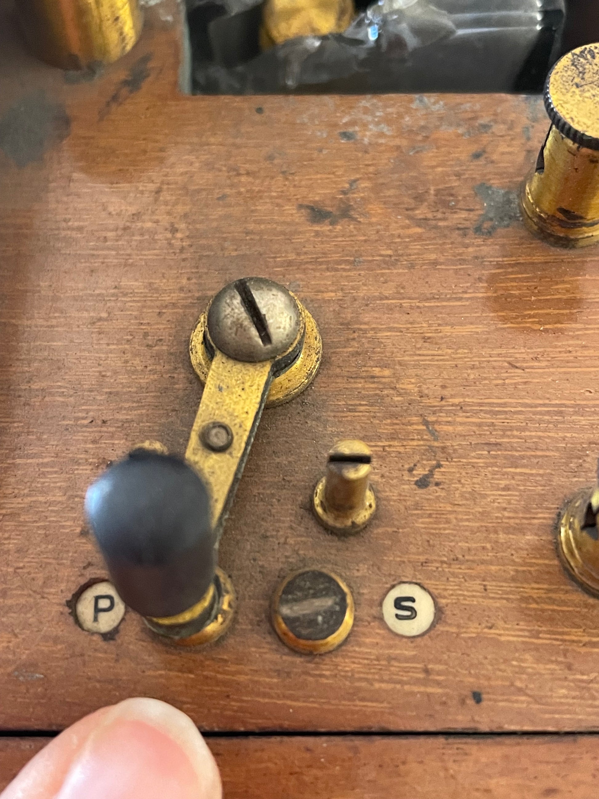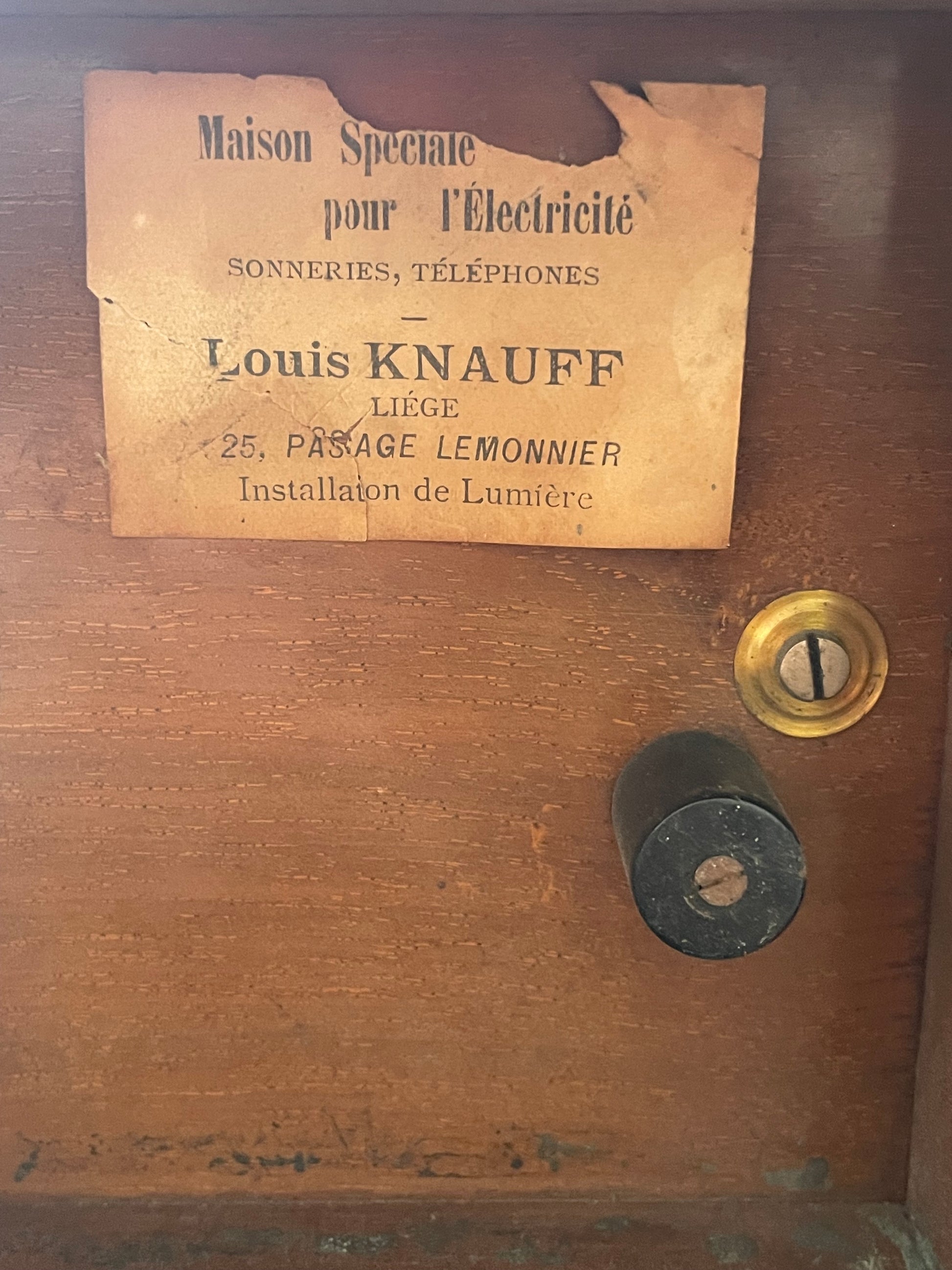 proprio come se fossimo in ritorno ad Oz… ecco l’antico ed inquietante macchinario per l’elettroterapia portatile. Dove si vede il vano c’era un cassettino oggi mancante con all’interno gli elettrodi; l’interno invece è stupendamente conservato, elaborato, affascinante. Bellissima la patina del legno, gli incastri, la maniglia, i gancetti. Conserva ancora l’antica etichetta d’origine, aprirlo significa proprio non essere più nel Kansas….