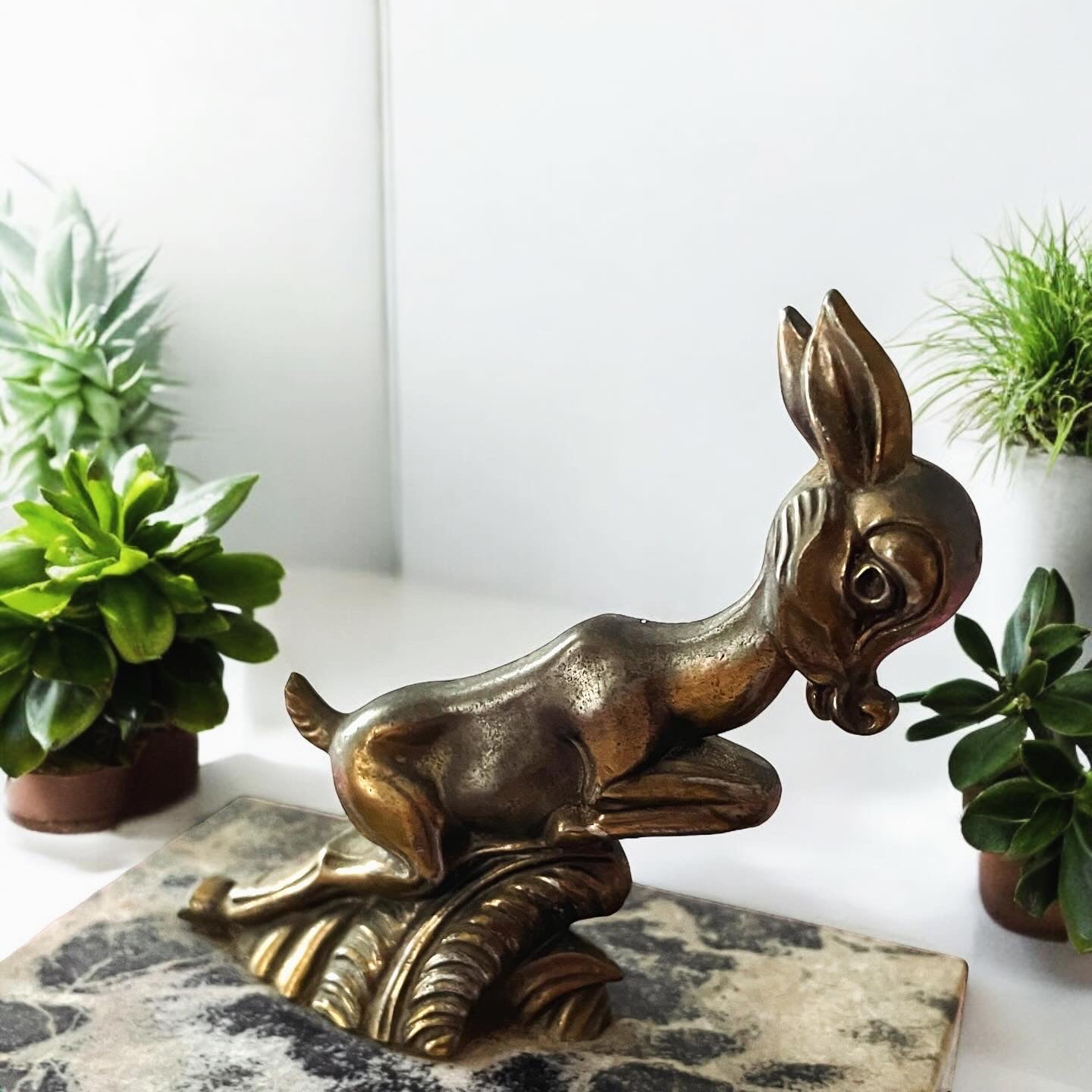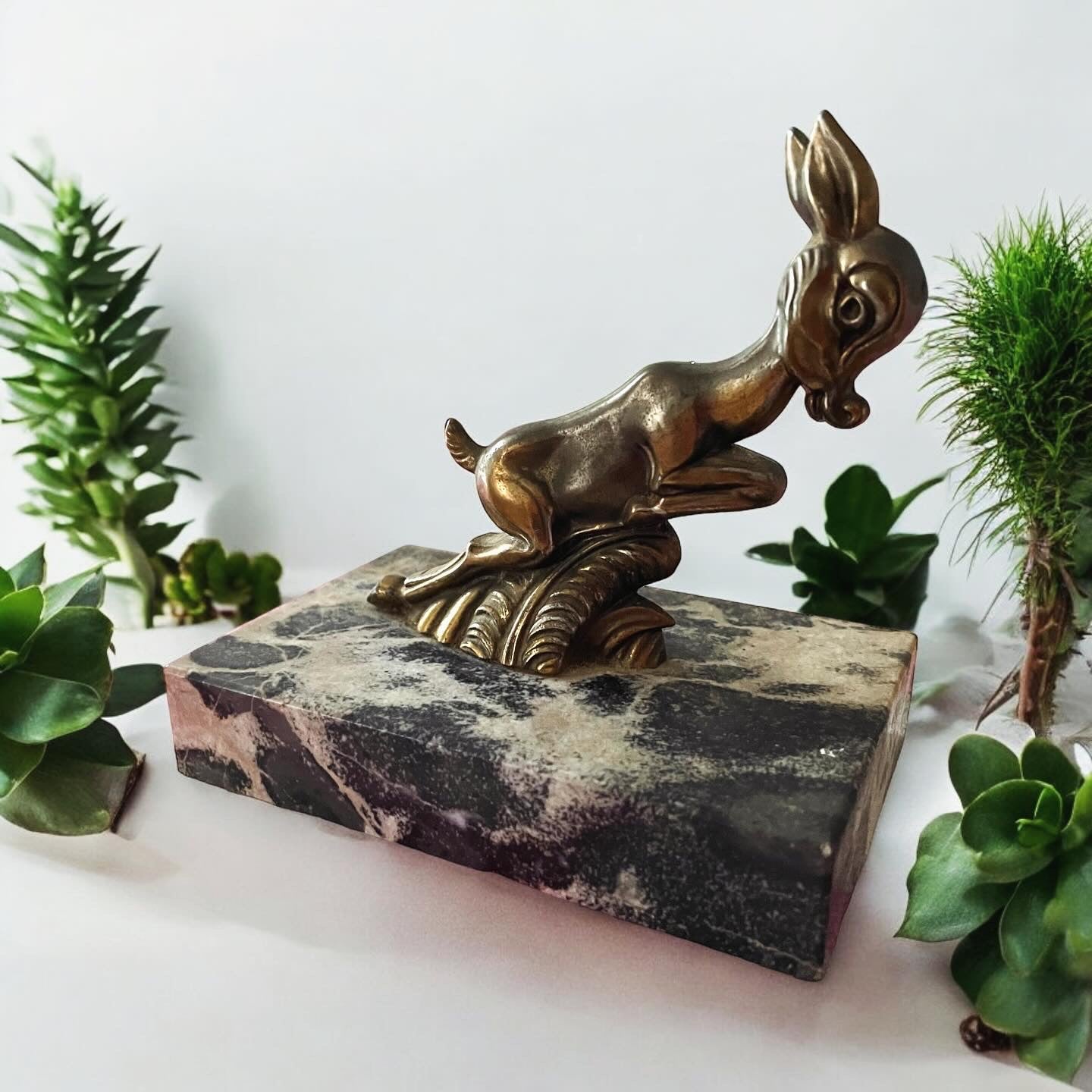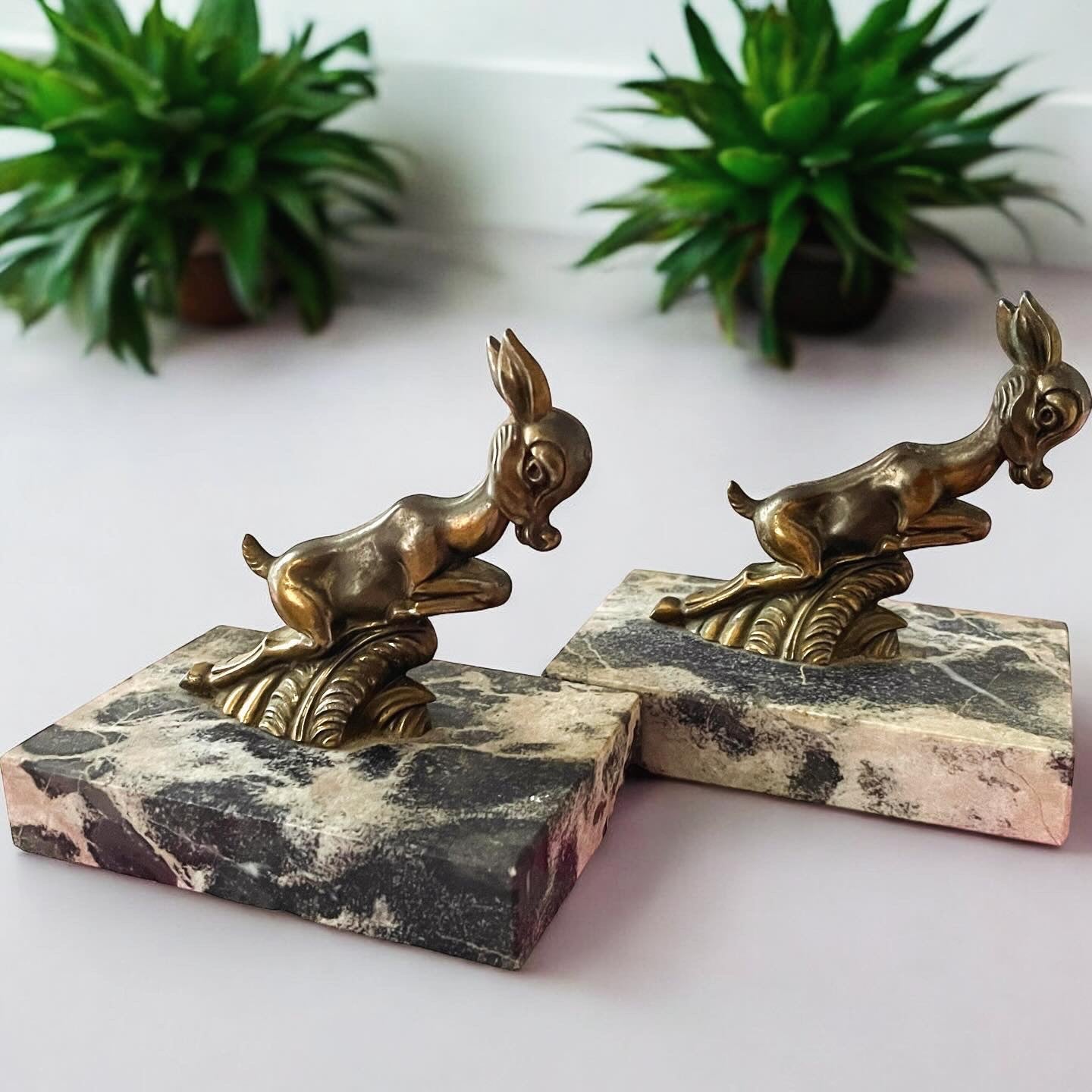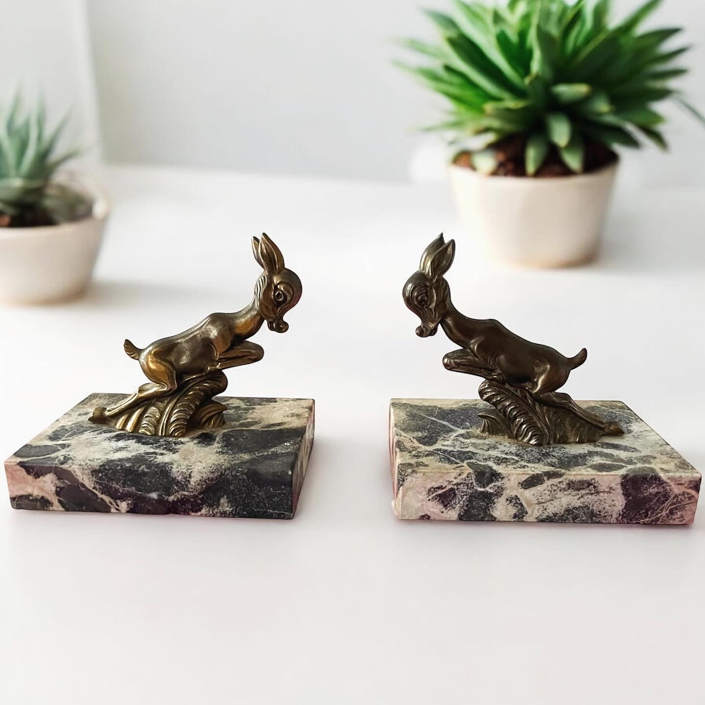 Antique bookends on veined grey marble bases surmounted by spelter figures depicting two very pretty fawns in the act of gathering themselves just before jumping, note the slender and elegant lines. They are very sought after and refined; in excellent condition, we have had similar ones that have always been in great demand. Dimensions: 13 x 12 cm.