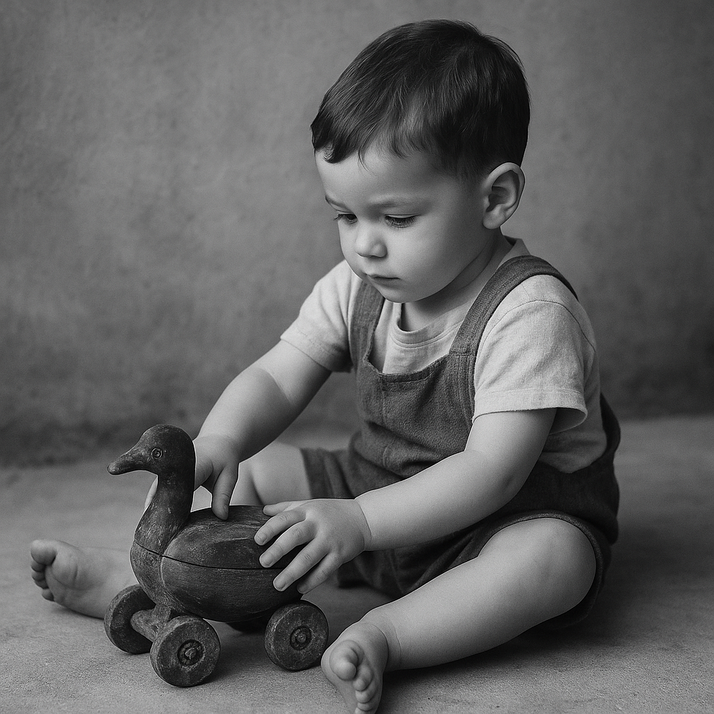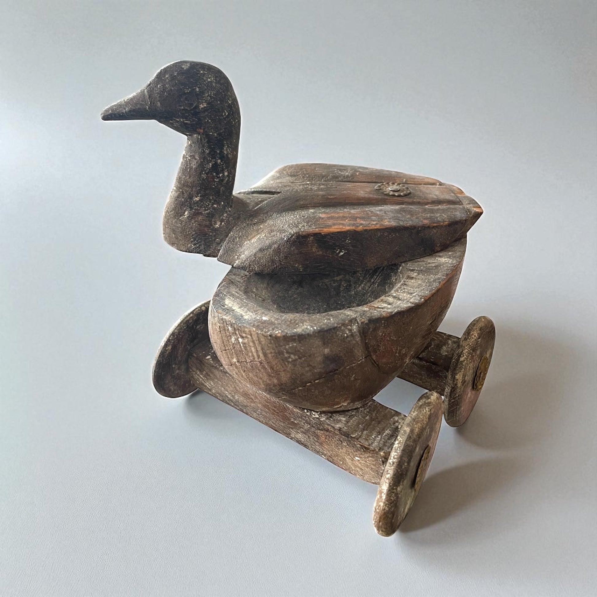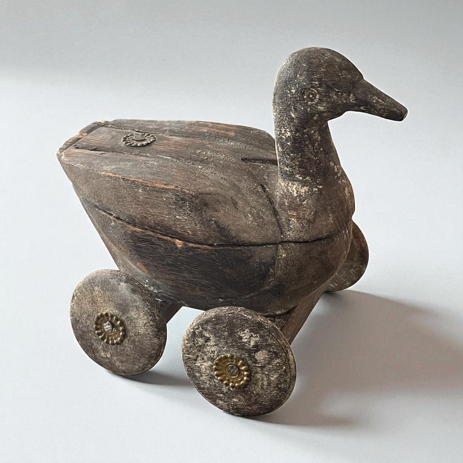 Immagina un bambino nei primi decenni del ’900. Seduto sulla soglia di casa, con un sorriso timido, spinge avanti e indietro questo piccolo animale di legno. Niente batterie, niente schermi, niente luci: bastava l’anatra a ruote, capace di diventare ogni volta qualcosa di diverso — un compagno di giochi, un piccolo scrigno di segreti, una promessa di meraviglia. Il legno, levigato dal tempo e dalle mani, racconta di un artigianato popolare semplice ma ricco di simboli: l’anatra, portatrice di fertilità e protezione, e le borchie in ottone che ricordano antiche cassapanche indiane. Non è soltanto un giocattolo, ma una scatolina che custodiva forse bottoni, dolcetti o tesori d’infanzia. Oggi torna a parlarci con la sua voce di legno antico, invitandoci a riscoprire la bellezza dei gesti lenti e dei giochi di un tempo. Chi era il bambino che un giorno lo teneva tra le mani? E quali segreti avrà nascosto sotto il suo coperchio?