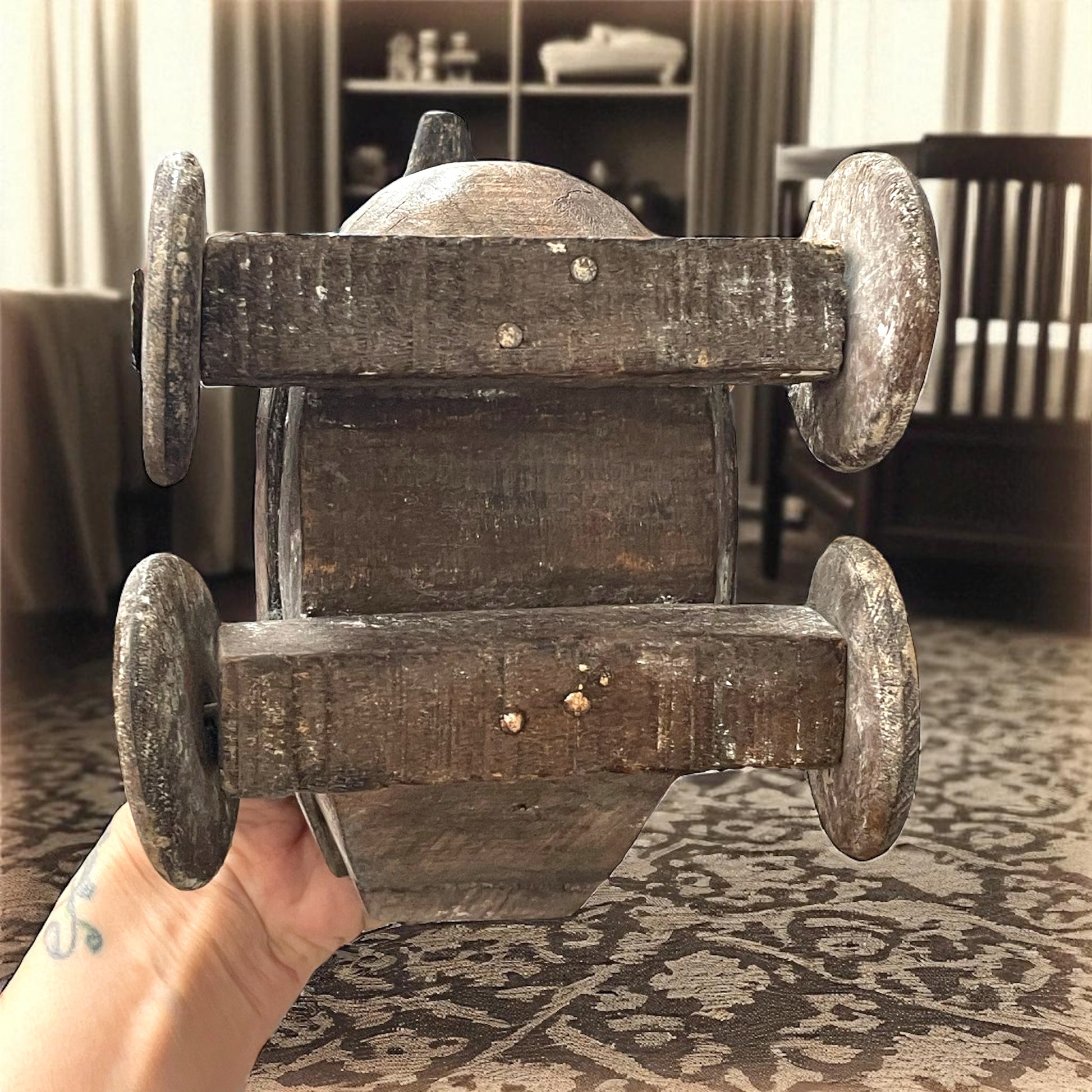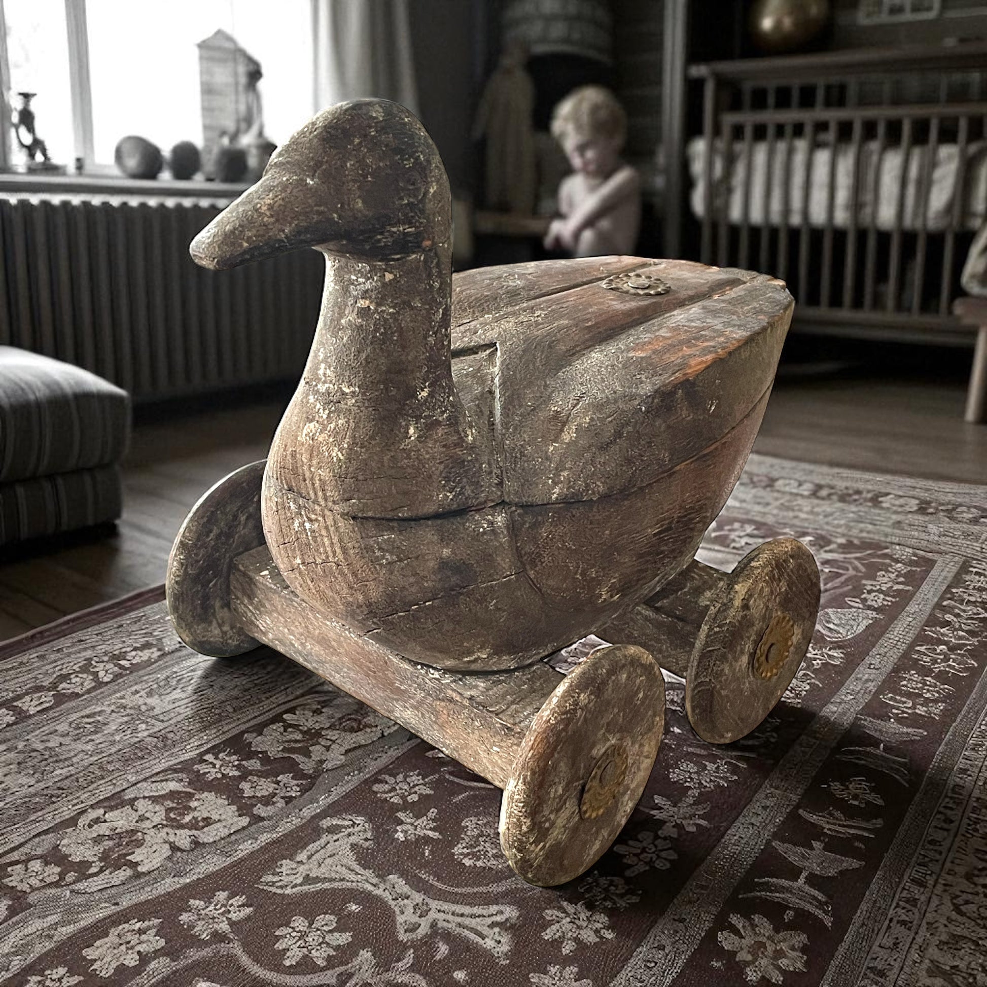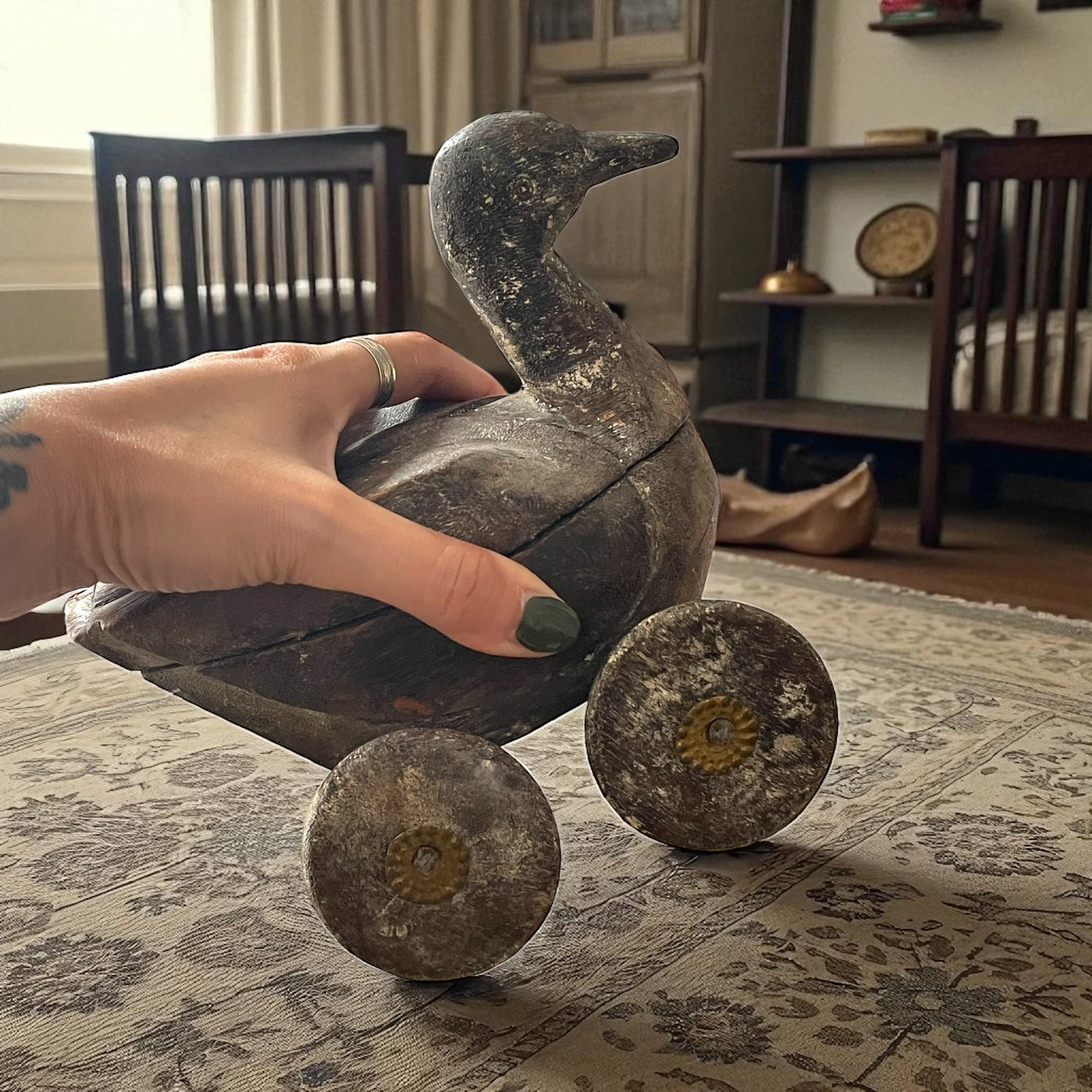 Immagina un bambino nei primi decenni del ’900. Seduto sulla soglia di casa, con un sorriso timido, spinge avanti e indietro questo piccolo animale di legno. Niente batterie, niente schermi, niente luci: bastava l’anatra a ruote, capace di diventare ogni volta qualcosa di diverso — un compagno di giochi, un piccolo scrigno di segreti, una promessa di meraviglia. Il legno, levigato dal tempo e dalle mani, racconta di un artigianato popolare semplice ma ricco di simboli: l’anatra, portatrice di fertilità e protezione, e le borchie in ottone che ricordano antiche cassapanche indiane. Non è soltanto un giocattolo, ma una scatolina che custodiva forse bottoni, dolcetti o tesori d’infanzia. Oggi torna a parlarci con la sua voce di legno antico, invitandoci a riscoprire la bellezza dei gesti lenti e dei giochi di un tempo. Chi era il bambino che un giorno lo teneva tra le mani? E quali segreti avrà nascosto sotto il suo coperchio?