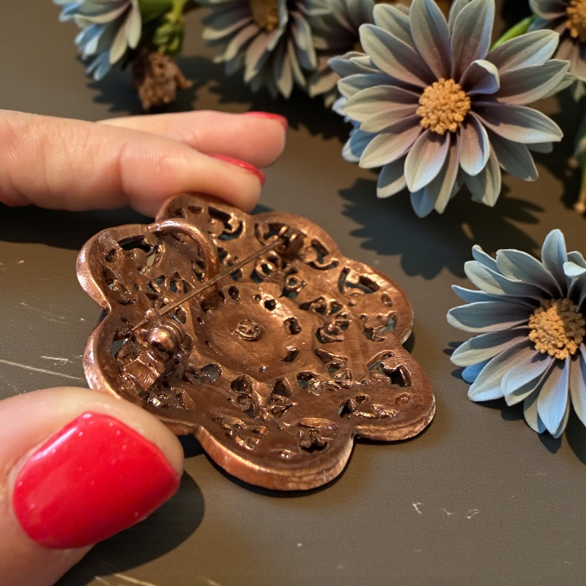 C’è qualcosa di profondamente teatrale in questo gioiello: ha una presenza scenica che non chiede il permesso, ma si posa con naturalezza su un cappotto scuro, su un abito semplice, su una catena lunga che scivola sul petto. La struttura è un fiore pieno, ricco, quasi barocco: una corolla traforata in metallo color rame brunito che custodisce una costellazione di cristalli rosa sfaccettati, iridescenti, con riflessi cangianti che mutano a seconda della luce. Al centro, un cristallo più profondo, color rubino rosato, come il cuore segreto dell’oggetto: l’elemento non negoziabile, il punto focale che cattura lo sguardo e lo trattiene. È sia pendente che spilla, una doppia anima che racconta un’epoca in cui i gioielli erano pensati per durare e adattarsi, non per essere relegati a un solo uso. La chiusura rotante di sicurezza sul retro è solida, ben costruita, rassicurante: un dettaglio che parla di qualità e attenzione. Indossarlo significa scegliere un accessorio che non è mai solo decorazione. È un gesto, un accento, una dichiarazione di gusto e personalità. Ottime le condizioni 🌸.