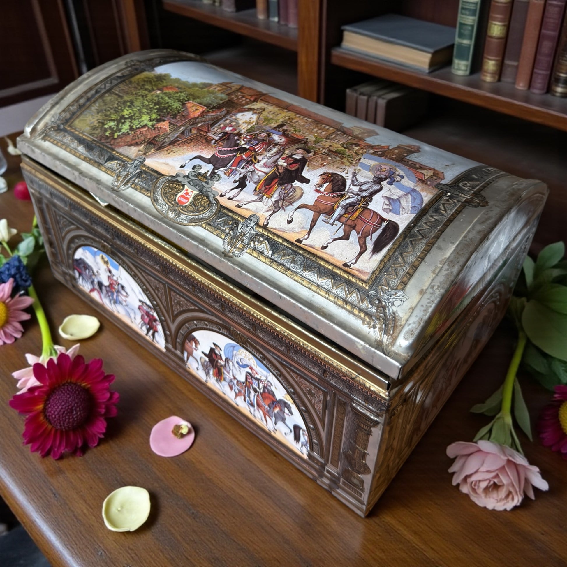 Grande biscottiera scatola di latta tedesca anni 70-80 con scene medievali