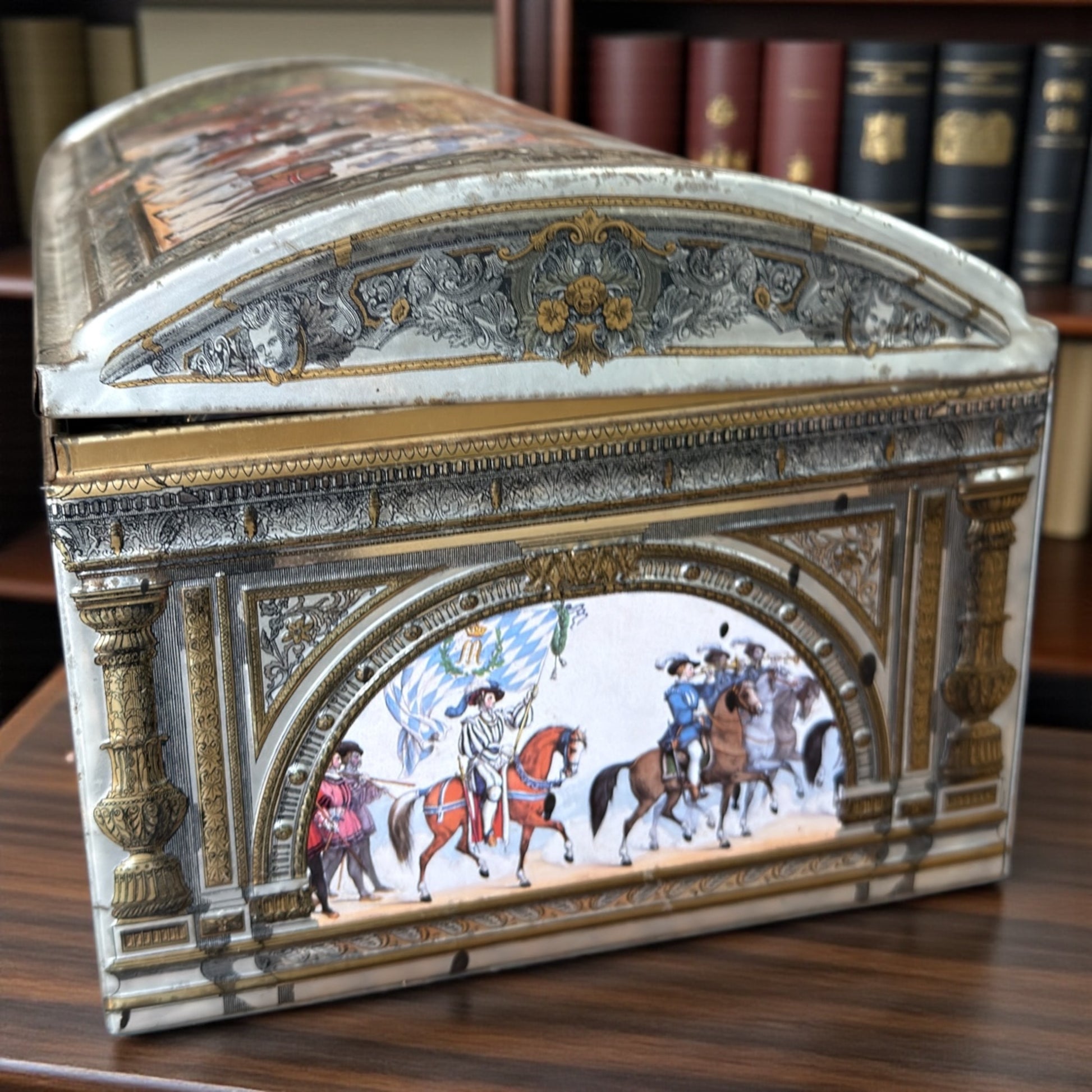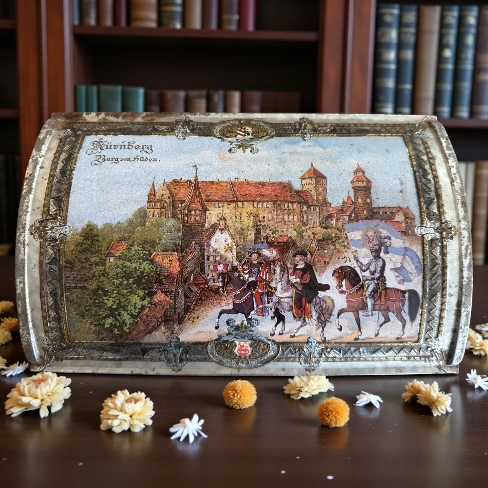 Non è una scatola. È un racconto medievale chiuso in latta. Norimberga. Le mura, i tetti rossi, i cavalieri in corteo, gli stemmi araldici. Una scena che sembra uscita da un libro illustrato antico. Questa grande biscottiera in latta litografata firmata Schmidt nasce negli anni ’70–’80, quando la tradizione tedesca reinterpretava con gusto romantico le proprie radici medievali. Il coperchio bombato amplifica l’effetto scenografico. La grafica è ricca, dettagliata, teatrale. E la patina del tempo – piccole ossidazioni, segni d’uso – non la penalizza: la rende vissuta. È una scatola che non si nasconde in un mobile. Si espone. Perfetta per uno studio, una libreria, una casa di montagna o un angolo che ha bisogno di carattere.