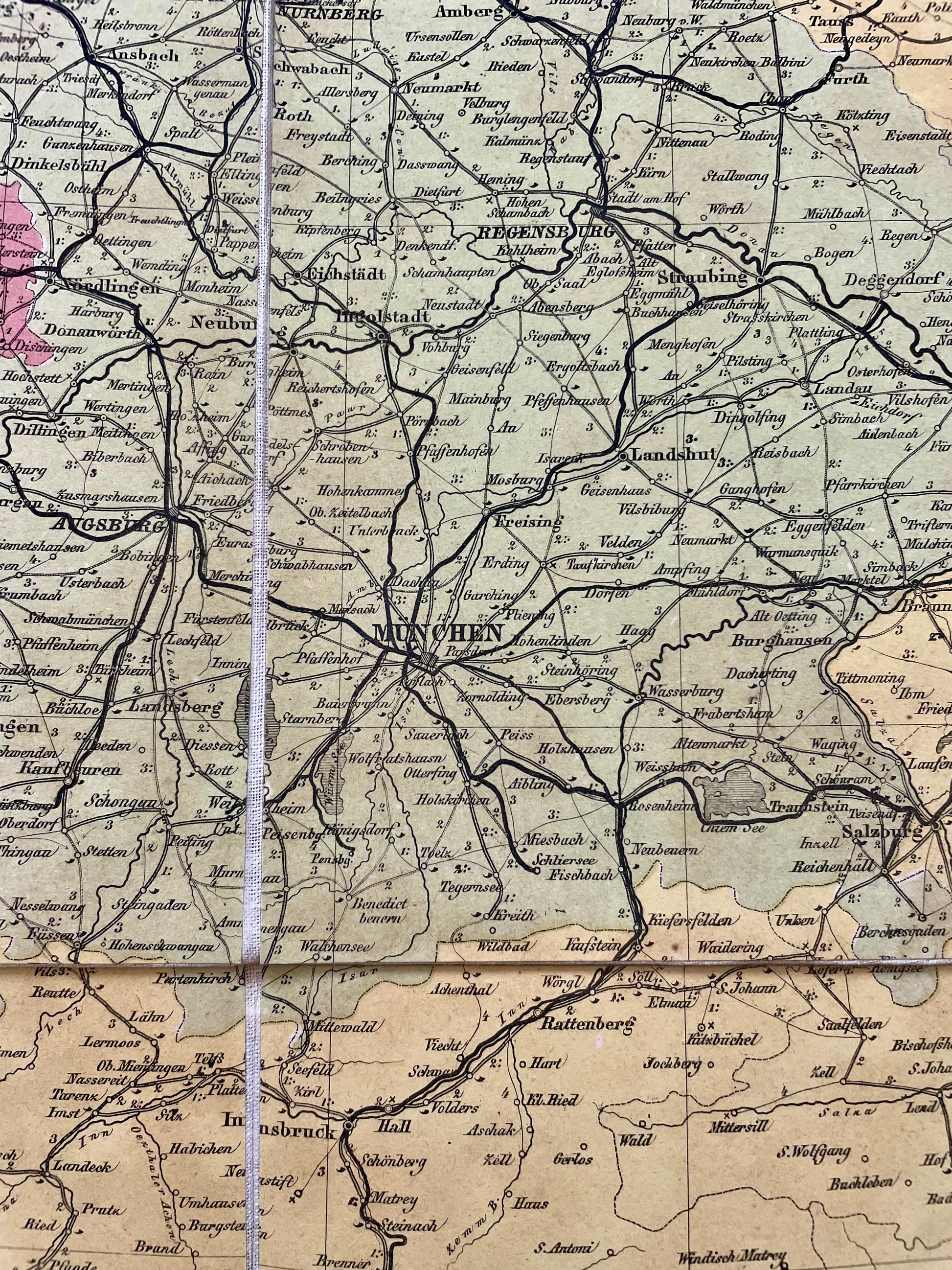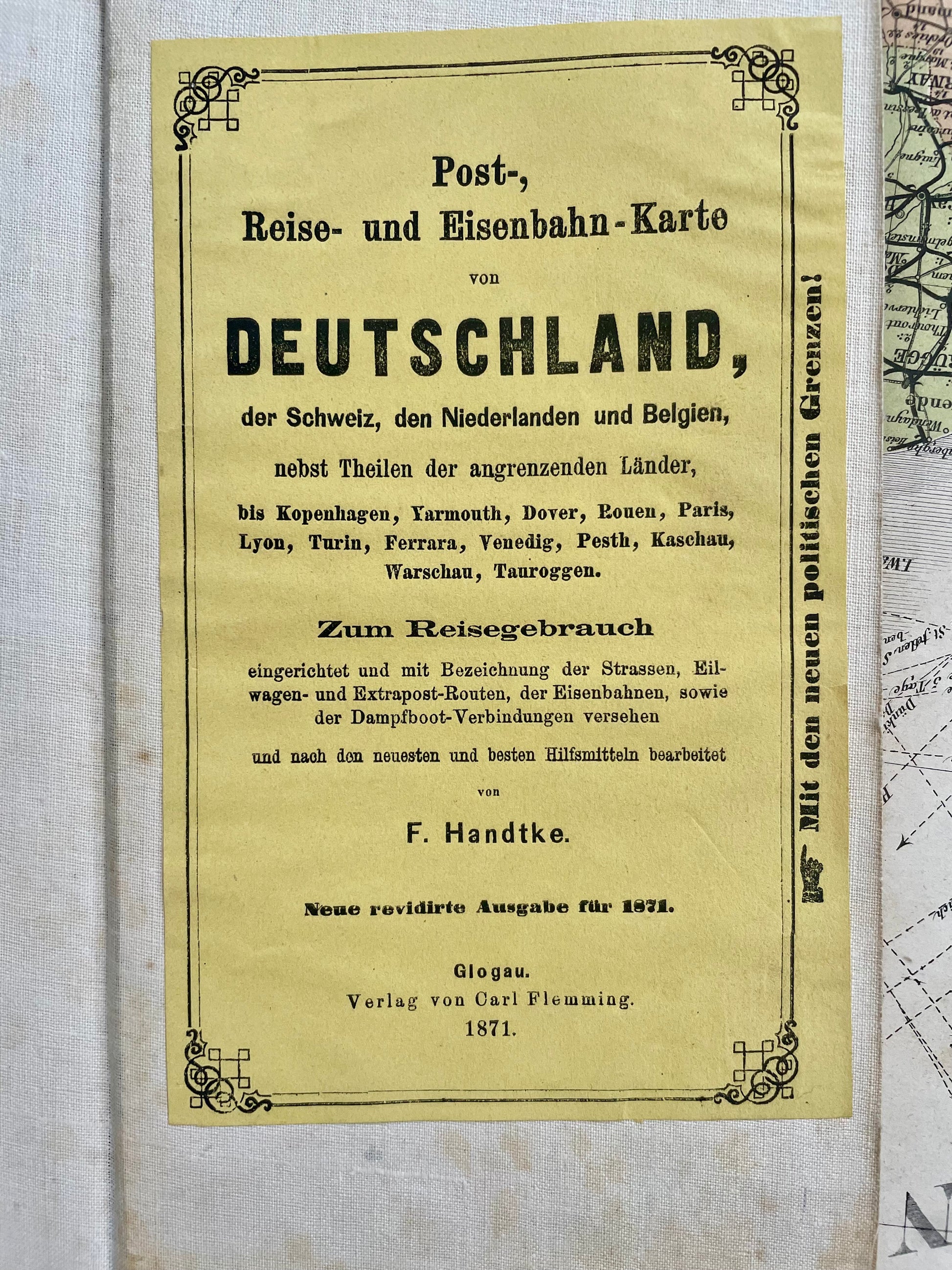 Magnifica carta geografica ottocentesca che rappresenta la rete postale, stradale e ferroviaria della Germania, della Svizzera, dei Paesi Bassi e del Belgio, con estensioni fino a Copenaghen, Parigi, Torino e Varsavia. Pubblicata nell’anno della proclamazione dell’Impero tedesco, è firmata da F. Handtke e stampata dall’importante editore Carl Flemming. Stampata con fine incisione tipografica e coloritura coeva, la carta è montata su tela originale pieghevole e racchiusa nella sua copertina editoriale in tela nera con titolo dorato, perfettamente conservata. All’interno è presente l’etichetta gialla con il catalogo editoriale, dettaglio raro e molto apprezzato dai collezionisti. Formato aperto ca. 90 × 105 cm. La carta presenta piccole lacune marginali evidenziate con il dito in due foto specifiche, ma nel complesso si conserva in buone condizioni, con colori ancora brillanti e struttura originale integra. Un’importante testimonianza cartografica della Germania appena unificata, ideale per collezionisti e studiosi di cartografia storica.
