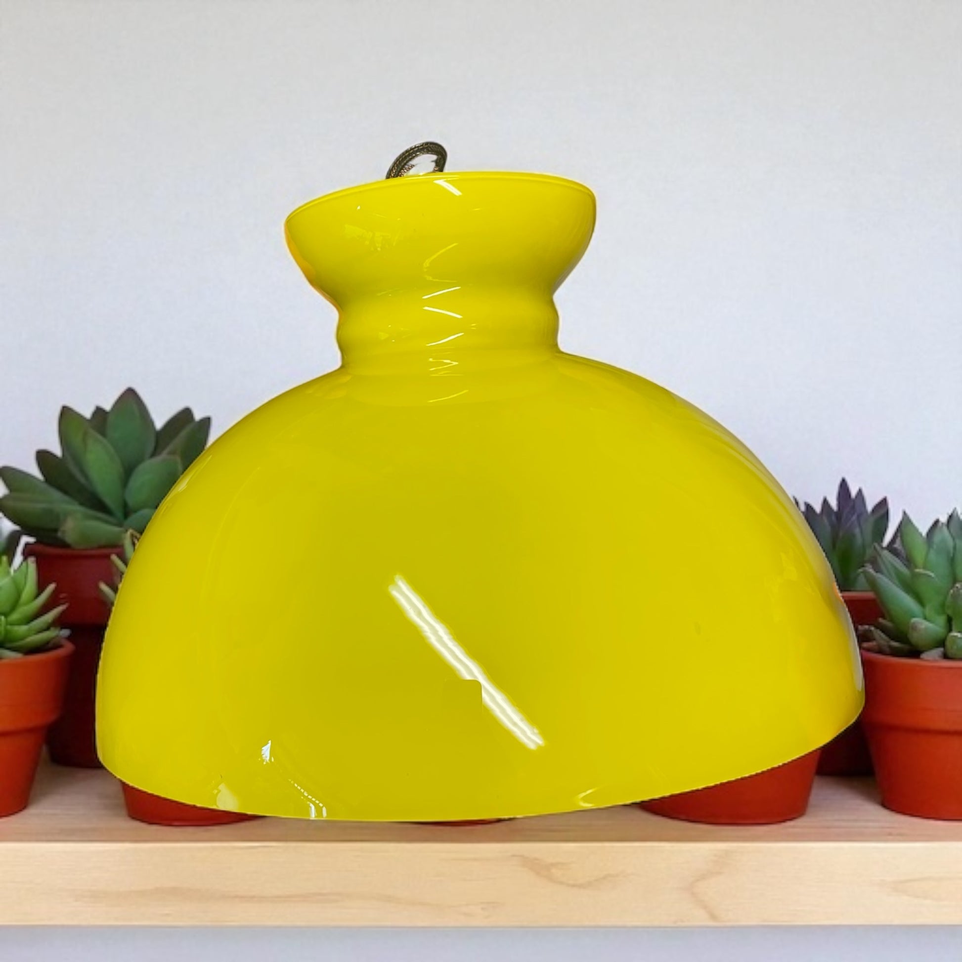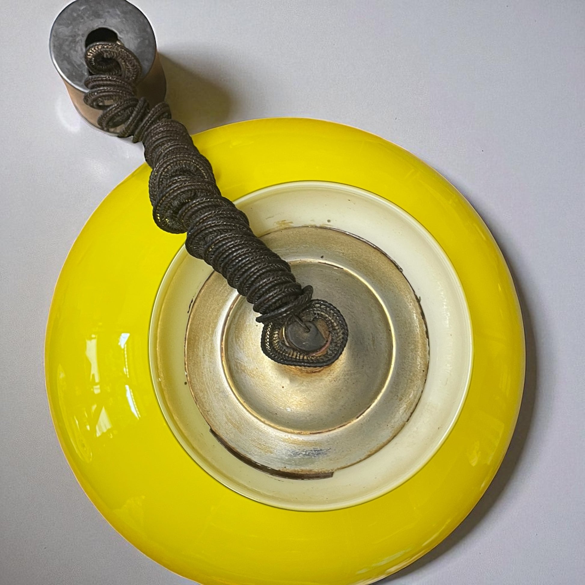 ✨ Epoca: Anni ’60/’70. Stile: Space Age. Materiale: vetro soffiato giallo lucido. Dimensioni: Ø 34,5 cm – H 26 cm. Condizioni: Ottime, nessuna sbeccatura né crepa, presente una piccola bolla originale nel vetro. Cavo originale in tessuto spiralato, completo di attacco a soffitto.