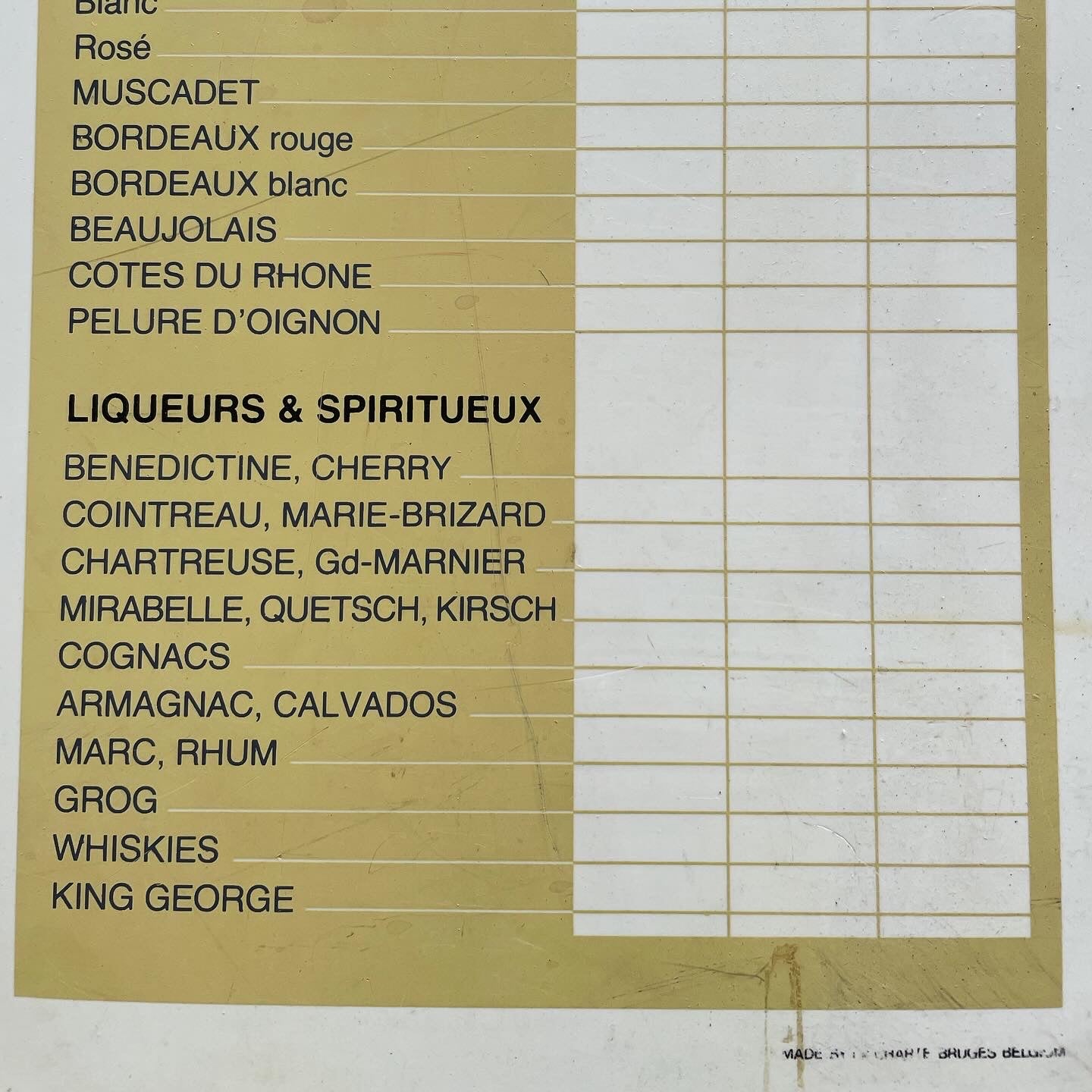 Old large flexible plexiglass price list taken from a Belgian restaurant, dating back to the 60s, you can find Martini, Cinzano, all the main Italian and foreign liqueurs and aperitifs...! A top corner is missing, it is very large, 53 x 27 cm.
